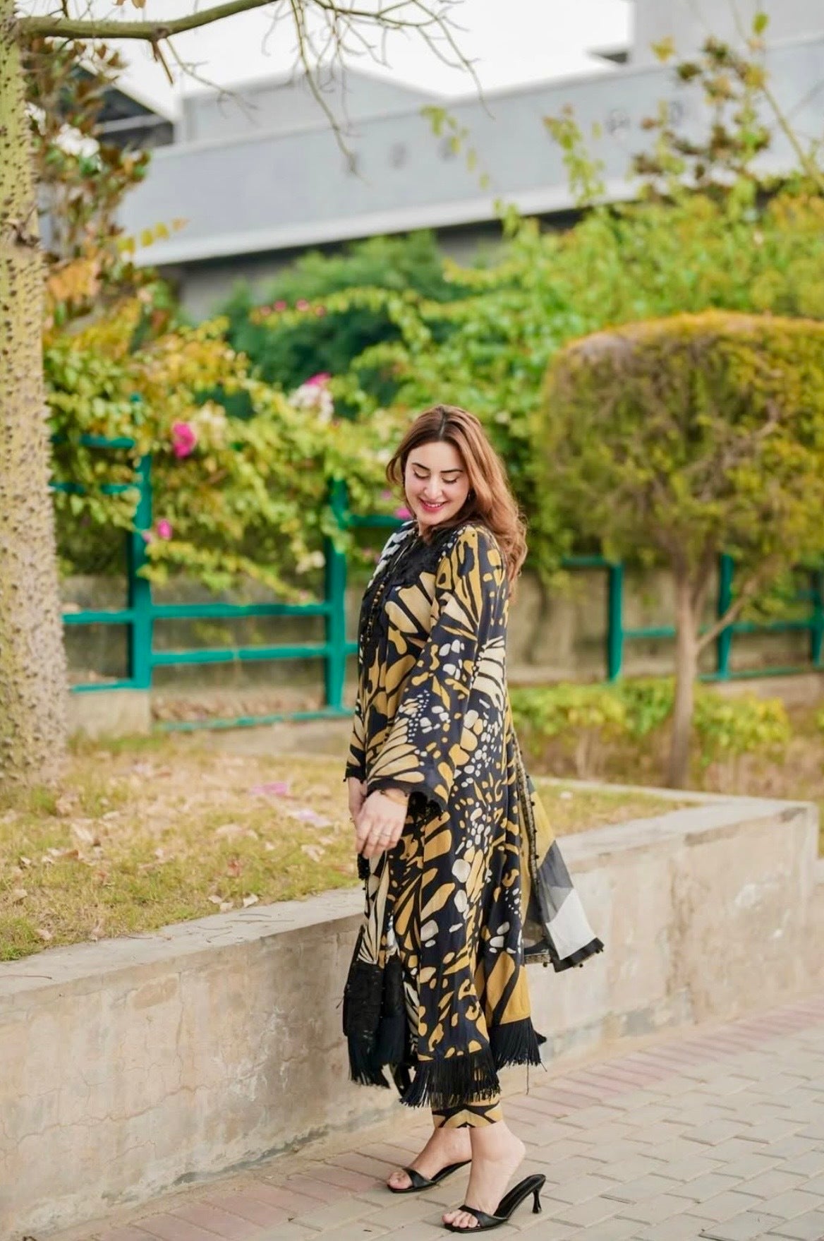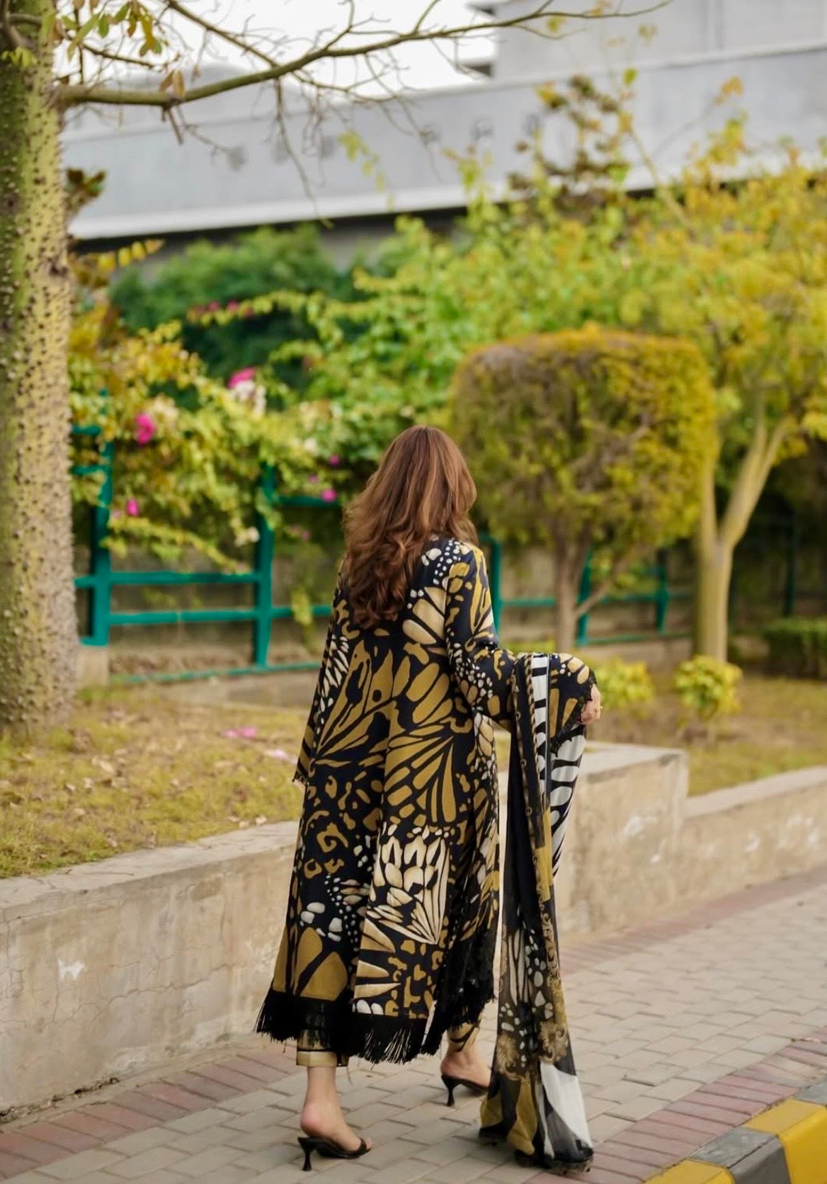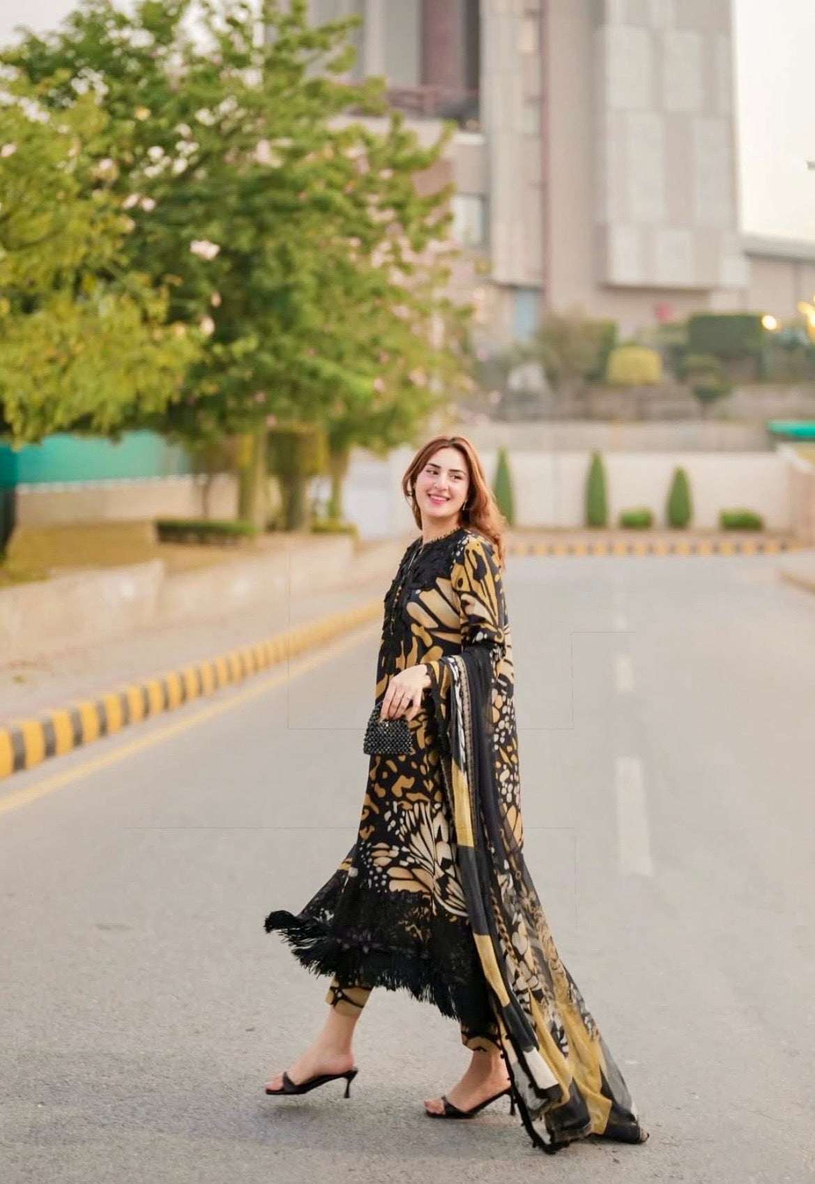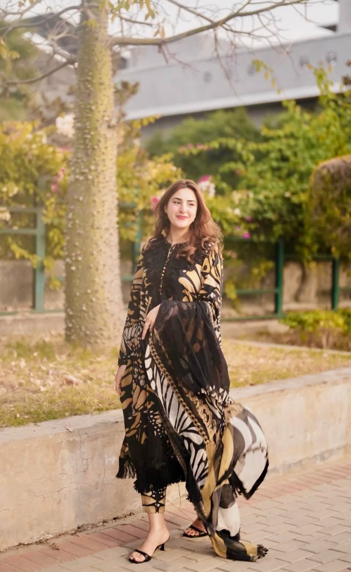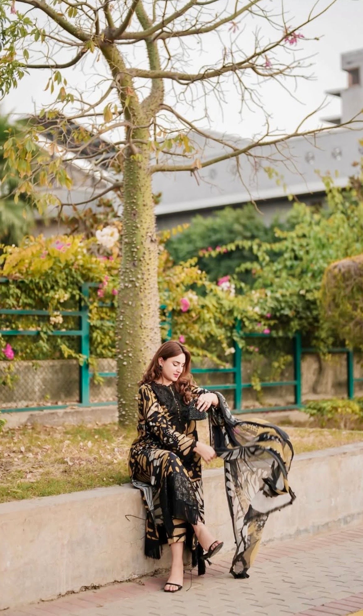 Summary: Embrace winter elegance with this black Pakistani suit from MARIA.B's MPrints collection. Crafted from high-quality linen, this unstitched dress is perfect for the Fall/Winter season, offering a blend of warmth and style. The kameez showcases an intricate embroidered organza neck patch with 3D flowers and is adorned with a bold, artistic print. The black base makes it a versatile choice for evening events and formal gatherings. This ethnic wear masterpiece, part of the winter festive clothing line, is perfect for making a statement at any party. A true representation of a modern Pakistani dress.