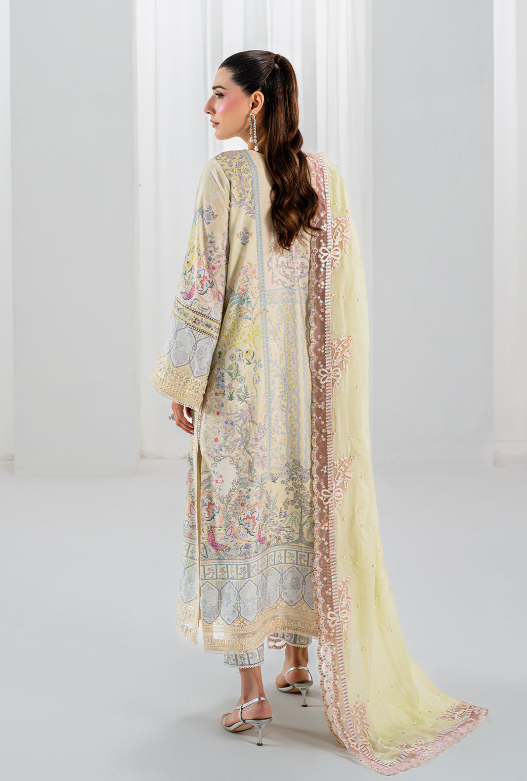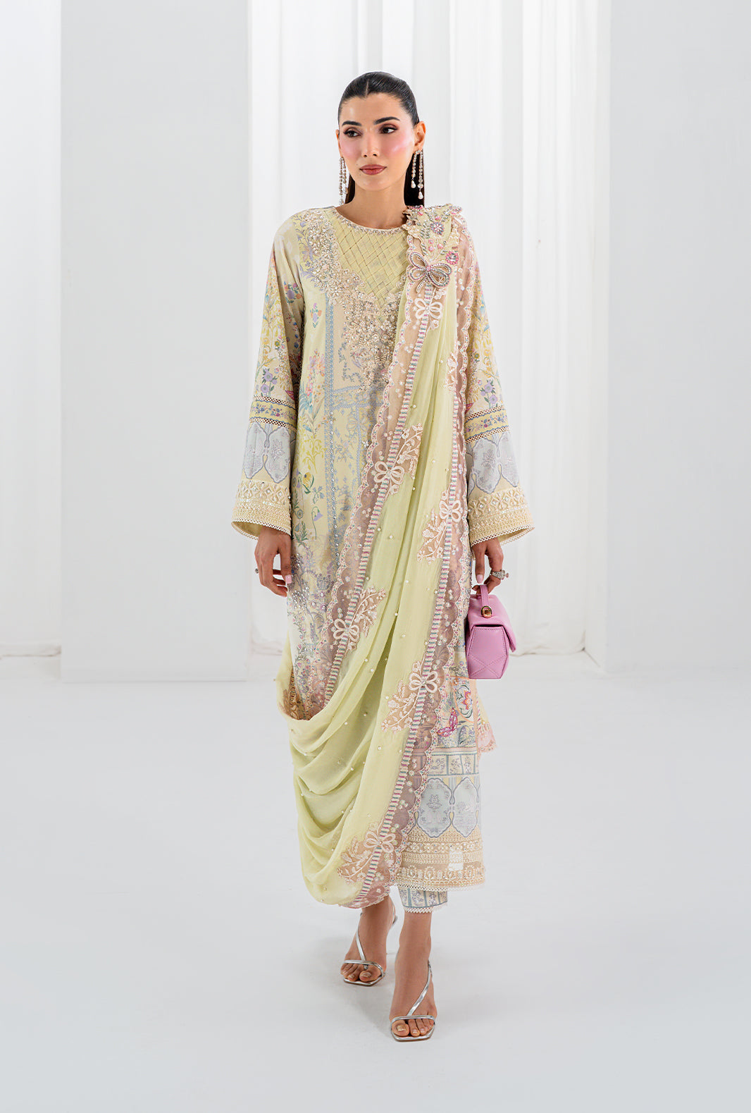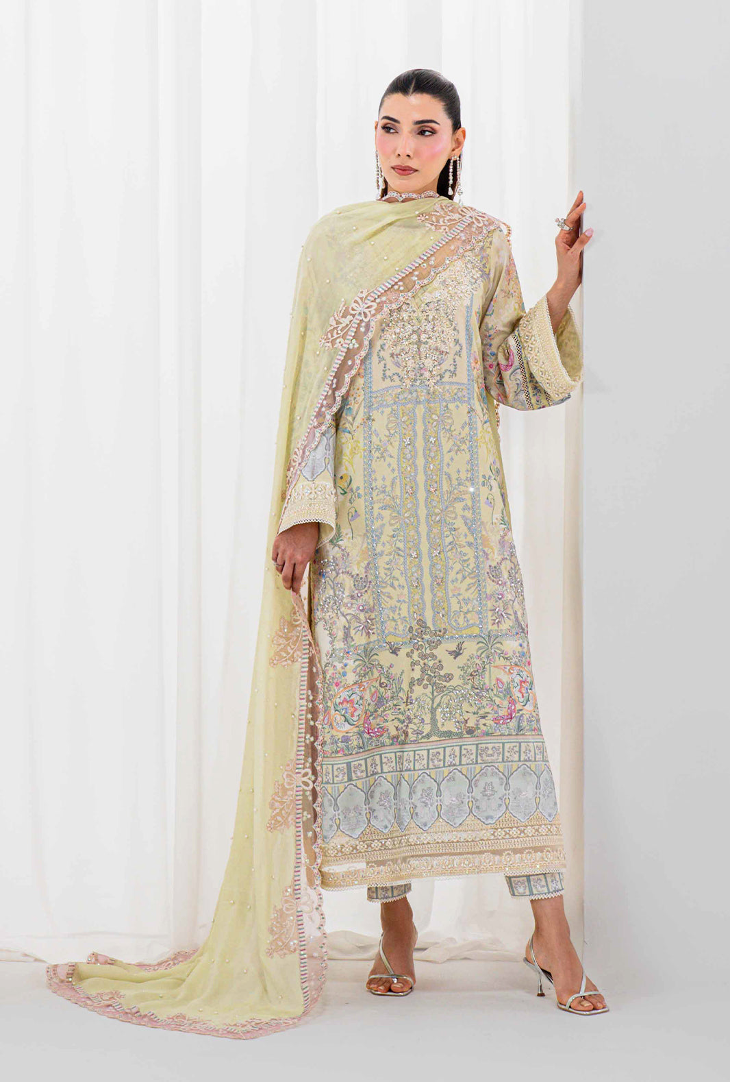 Fabric: Work Technique: Embroidered, Printed & Embellishment Best worn In: All Season Package Includes: Unstitched — 3PC Shirt, Dupatta & Trouser Fabric: Raw Silk Description: ISRA is a study in delicate luxury — a rawsilk printed long shirt with a hand stitched organza neckline and an embellished daman border placed with quiet precision. Embroidered and hand embellished sleeve borders complete a silhouette that is entirely AJR. A pearl embellished silk dupatta finished with organza embroidered borders on all four sides adds an ethereal finish. ISRA also comes with an embellished accessory motif — because how you drape your dupatta should always be a choice. Shirt: Raw Silk Trouser: Raw Silk Dupatta: Silk |