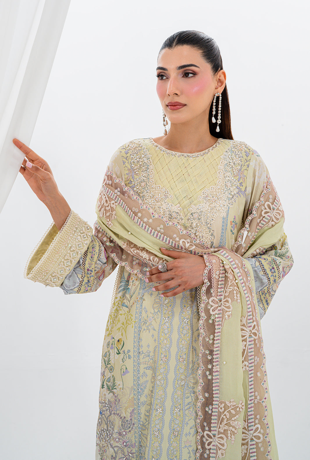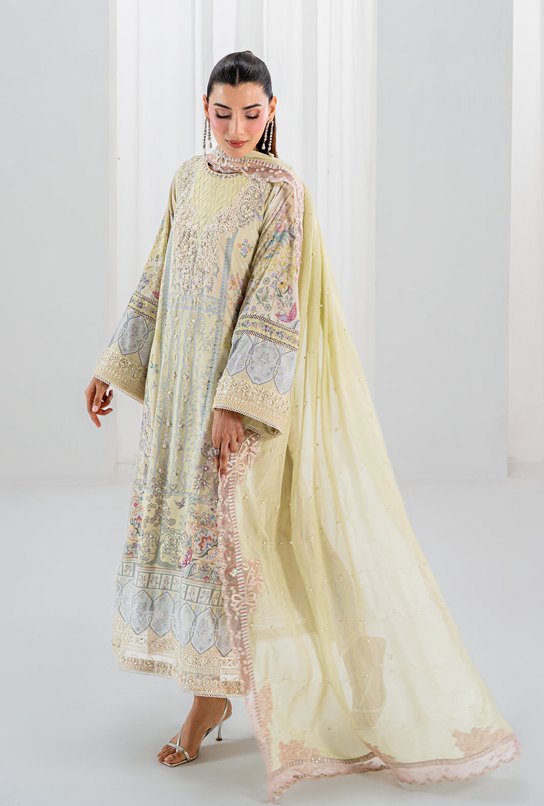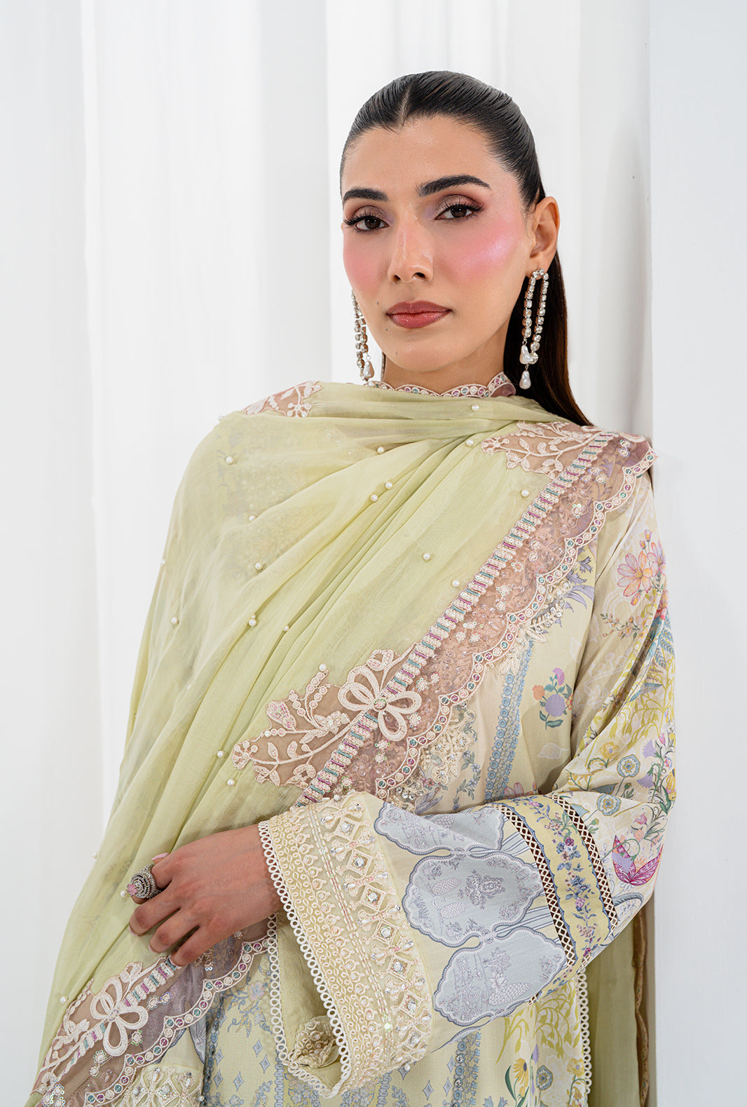 Fabric: Work Technique: Embroidered, Printed & Embellishment Best worn In: All Season Package Includes: Unstitched — 3PC Shirt, Dupatta & Trouser Fabric: Raw Silk Description: ISRA is a study in delicate luxury — a rawsilk printed long shirt with a hand stitched organza neckline and an embellished daman border placed with quiet precision. Embroidered and hand embellished sleeve borders complete a silhouette that is entirely AJR. A pearl embellished silk dupatta finished with organza embroidered borders on all four sides adds an ethereal finish. ISRA also comes with an embellished accessory motif — because how you drape your dupatta should always be a choice. Shirt: Raw Silk Trouser: Raw Silk Dupatta: Silk |