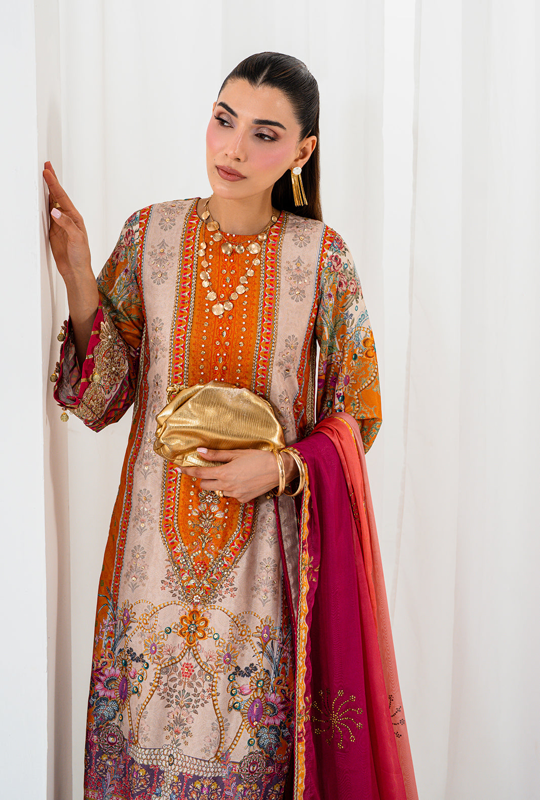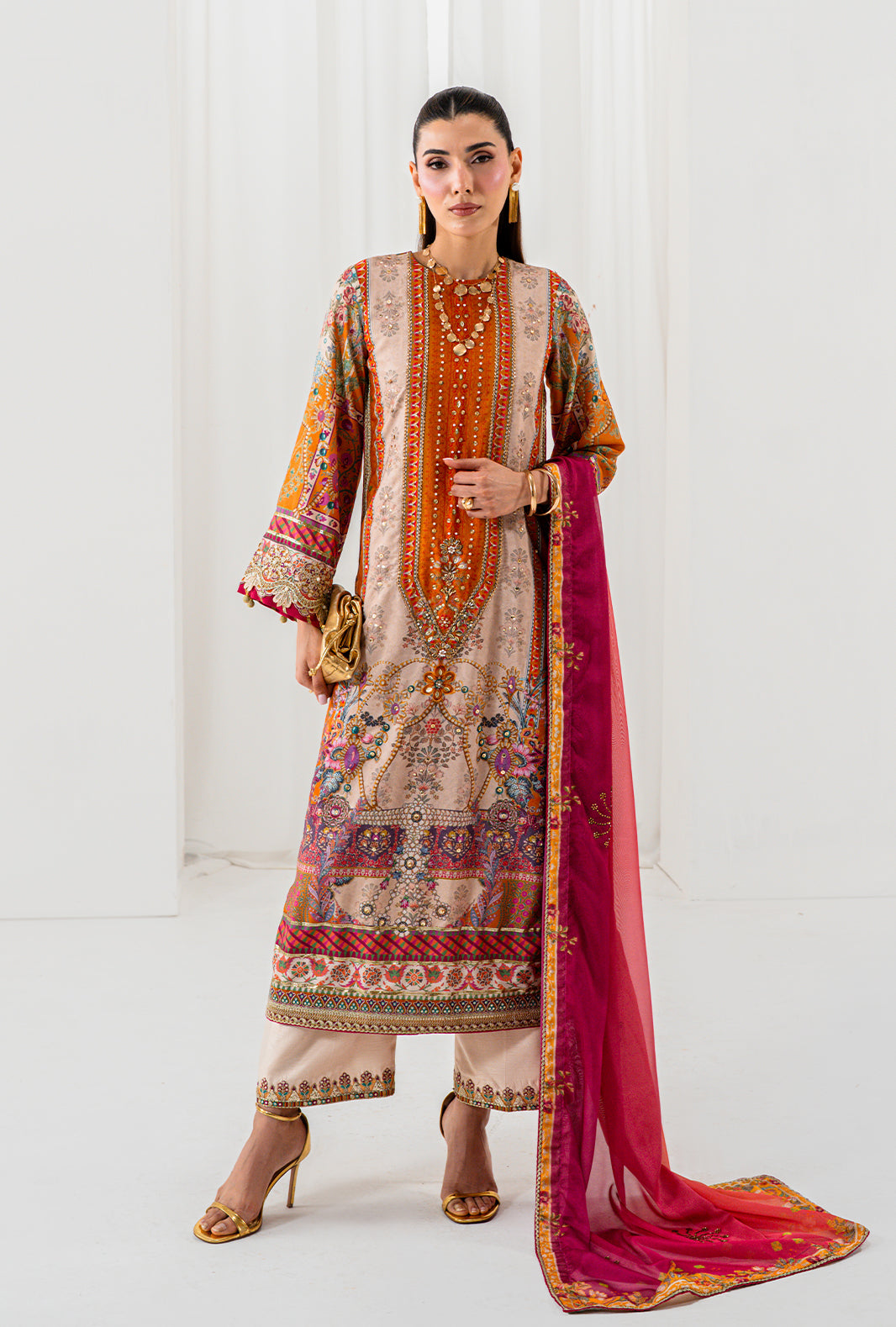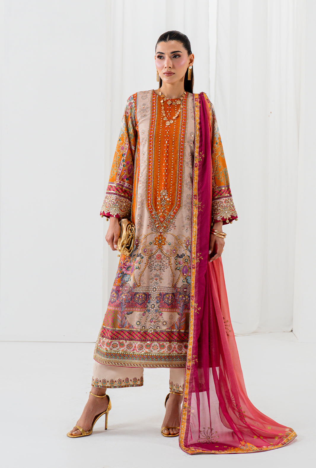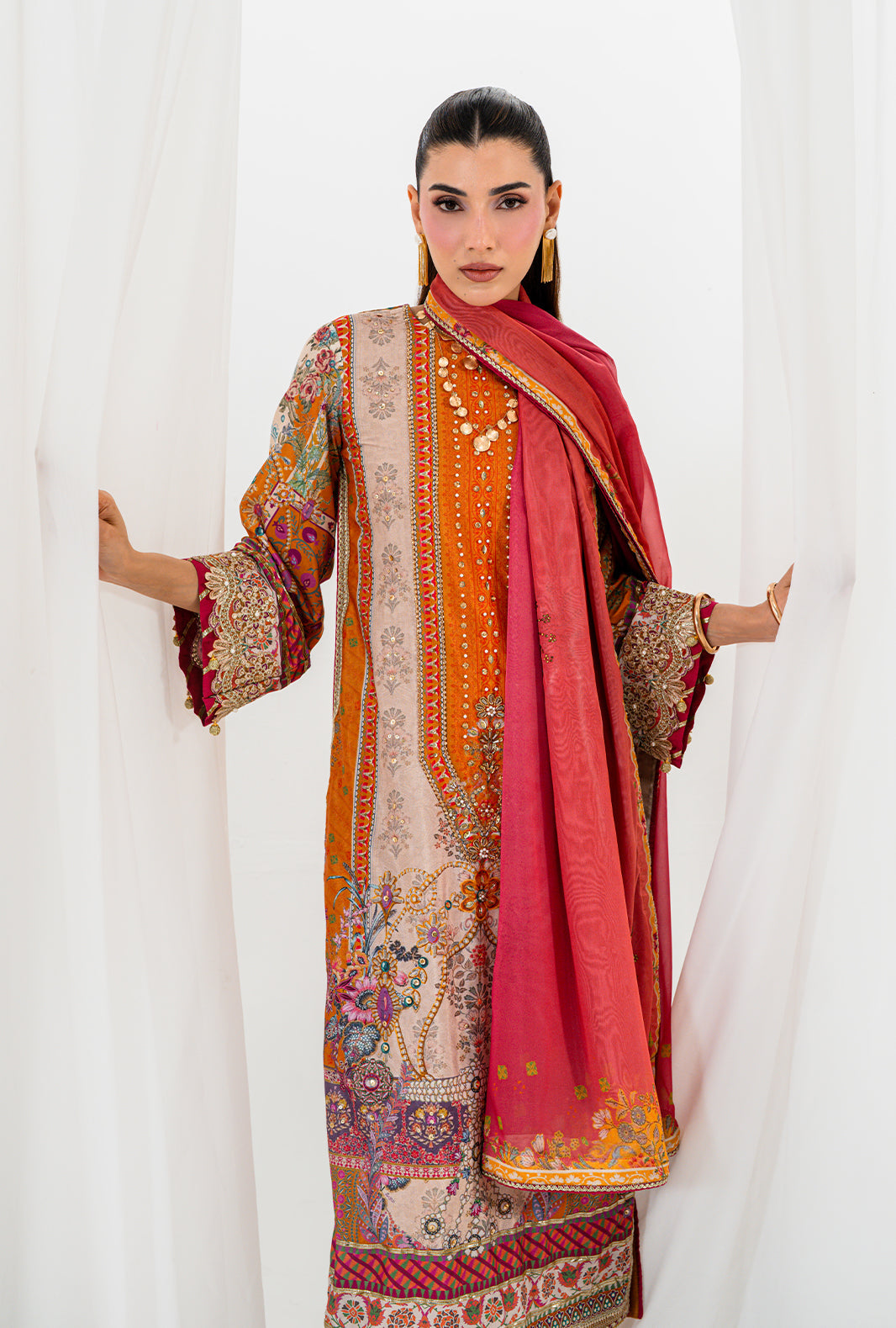 ORLA is pure extravagance in a straight long cut — a printed silk shirt hand embellished with sequin, Swarovski and crystals that catch every light in the room. Scalloped embroidered sleeves with fuchsia pink contrast and gotta details add a deliberate clash that is unmistakably AJR. Dyed raw silk loose pants with embroidered edges complete the silhouette, paired with an ombre silk dupatta scattered with hand applied Swarovski motives allover.
