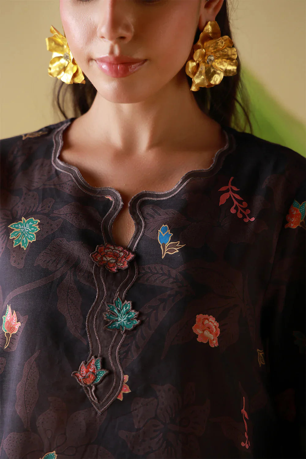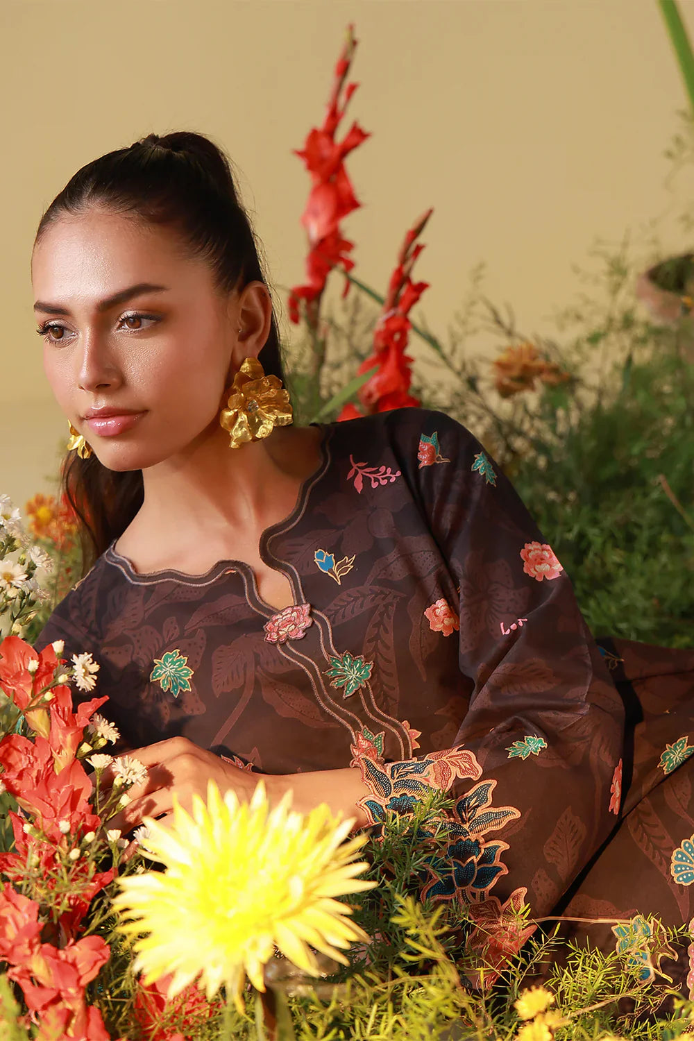 A rich espresso-brown ground adorned with ornate floral motifs in burnished reds and soft aquas. The composition is regal yet grounded, blending heritage-inspired detailing with modern restraint. Ideal for those who favor depth and drama.