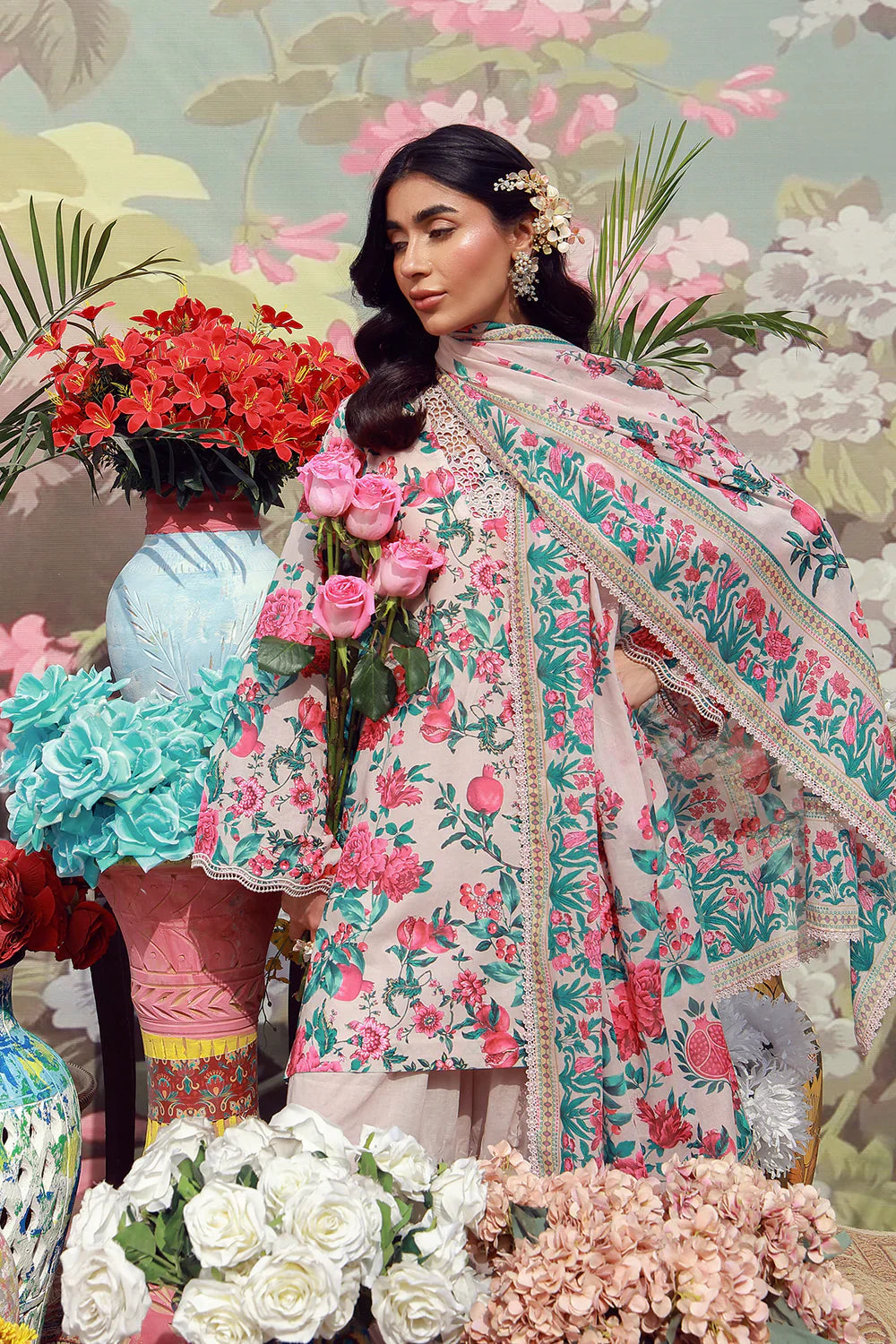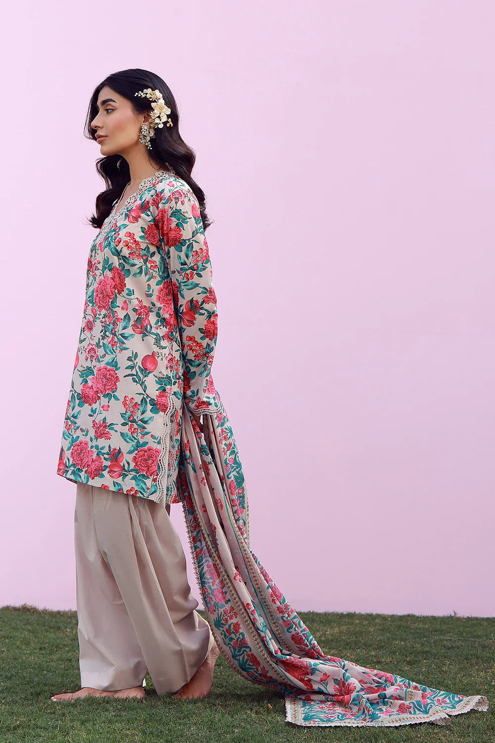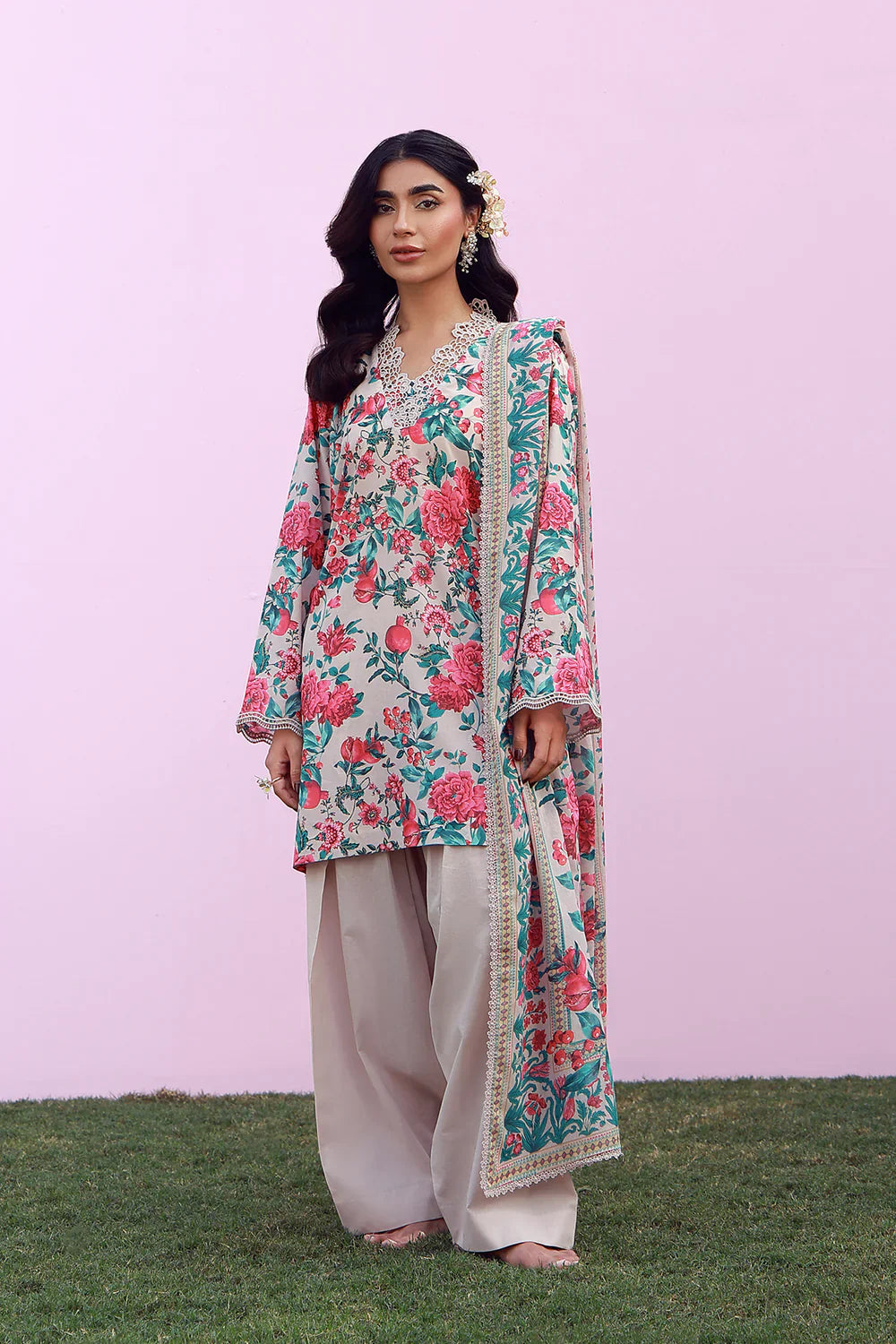 Fabric: A soft ivory base scattered with lively florals in rose, teal, and fresh green. The printed dupatta adds rhythm, while neutral pants keep the look refined. Playful yet polished for everyday elegance. 1-Digital Printed SHIRT (LAWN) -3M 2-Digital Printed DUPATTA (LAWN) -2.5M 3-DYED TROUSER (CAMBRIC) -2.5M |