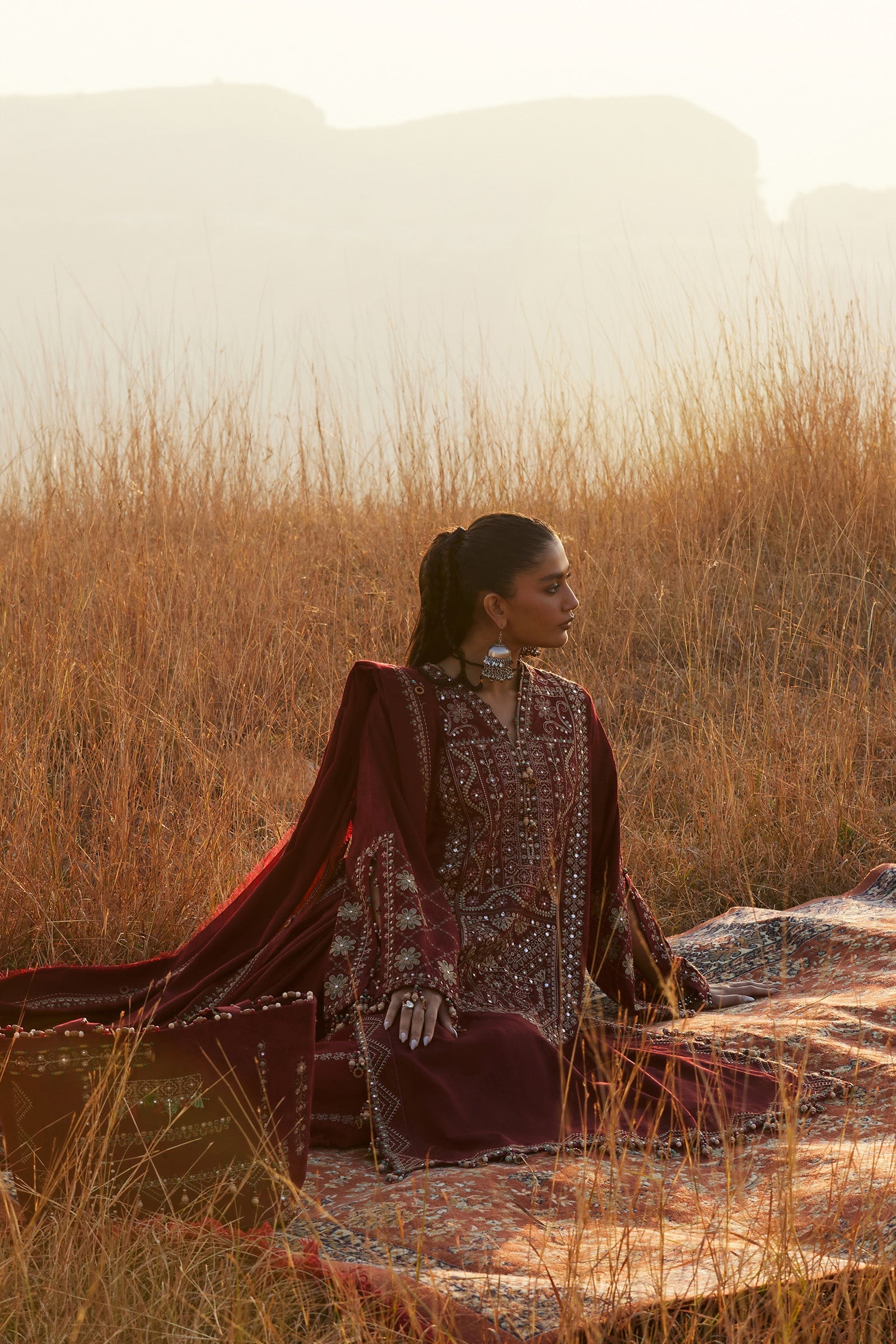 Fabric: Sassi — Winter’s Burgundy RebelSassi — a burgundy tapestry of heritage, stitched with love and carrying whispers of the past. Every thread tells a story, woven from earth, dusk, and winter’s wild heart, alive with tradition yet untamed, moving with the rhythm of the free-spirited Zaha girl.This piece rises from a burgundy jacquard canvas, rich as a winter dusk. Delicate French beige taankas scatter like whispered footprints across frozen earth — intricate, hauntingly light, yet fearless.A dreamlike acrylic shawl drifts around her, embroidered floral borders moving like wild winter blooms caught in a December breeze, untamed and free.The shirt’s elongated tribal neckline, in kaantha stitch, flows in cream, burgundy, and sage — shades borrowed from forest shadows and fading winter light. Sheesha and panni-kissed florals glint like frost at sunrise, alive with movement.Floral embroidered sleeves and a bold tribal motif at the back root the ensemble in heritage — raw, earthy, and unapologetically wild.Paired with tonal pants, Sassi becomes winter armor for the free-spirited Zaha girl, a silhouette that breathes, bends, and roars with the untamed rhythm of the season. SASSI (ZW25-12) - Unstitched Embroidered Front Center Panel (Jacquard) 1 Piece Embroidered Front Right Side Panel (Jacquard) 1 Piece Embroidered Front Left Side Panel (Jacquard) 1 Piece Embroidered Back Center Panel (Jacquard) 1 Piece Embroidered Back Right Side Panel (Jacquard) 1 Piece Embroidered Back Left Side Panel (Jacquard) 1 Piece Embroidered Sleeves Left & Right (Jacquard) 1 Pair Embroidered Dupatta Centre (Acrylic) 2 Meters Embroidered Dupatta Left Pallu (Acrylic) 1 Piece Embroidered Dupatta Right Pallu (Acrylic) 1 Piece Embroidered Trouser (Khaddar) 2.5 Meters Component: Shirt | Dupatta | Trouser Disclaimer: Please note that the color of the item you receive may vary slightly from that shown in the product shoot. This can happen due to the variation in light at the time of product and fashion shoot. This is a concept stitched article and may not contain certain embellishments. Fabric details: Jacquard | Acrylic | Khaddar |