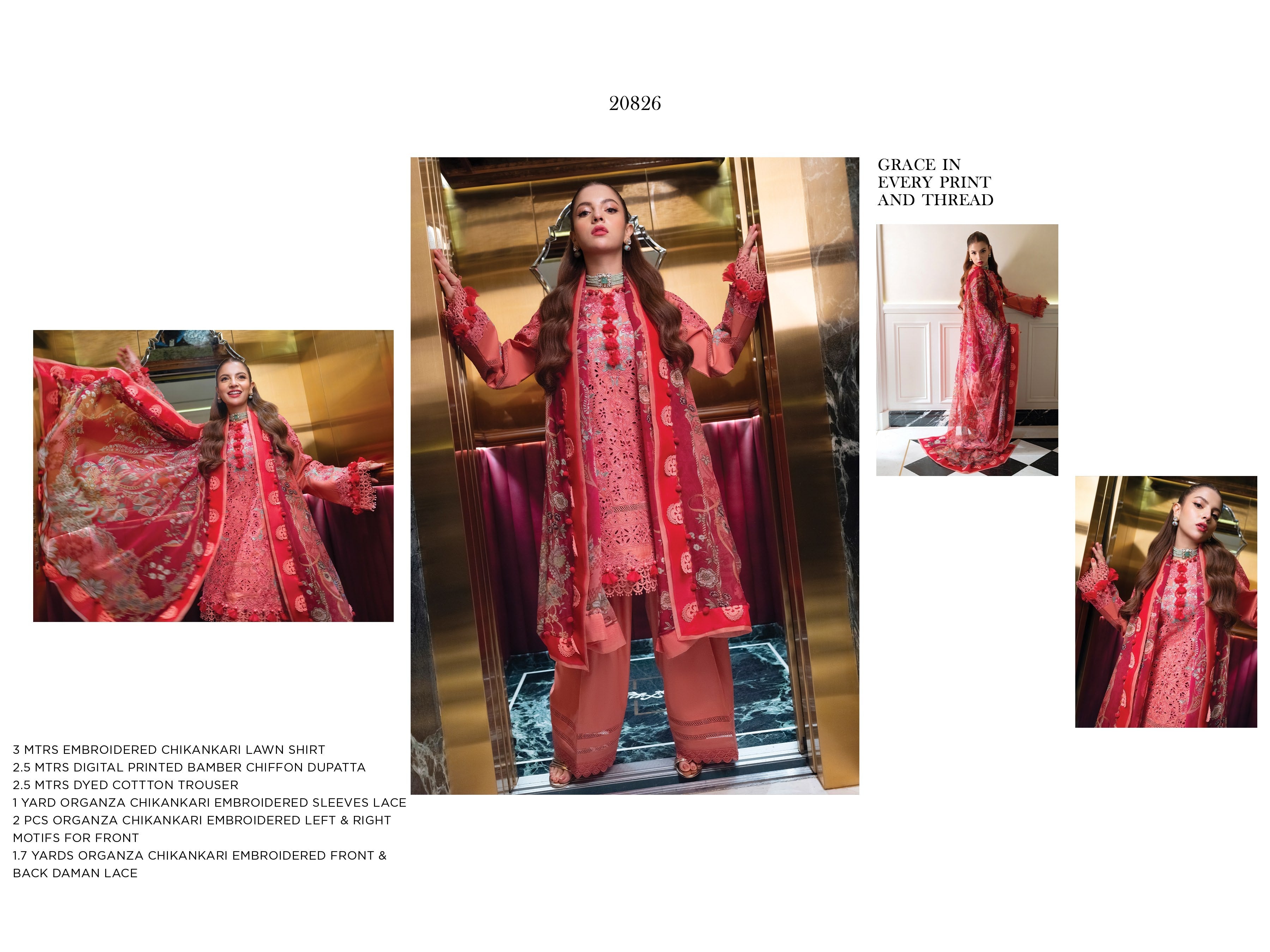 Fabric: 3 MTRS EMBROIDERED CHIKANKARI LAWN SHIRT 2.5 MTRS DIGITAL PRINTED BAMBER CHIFFON DUPATTA 2.5 MTRS DYED COTTON TROUSER 1 YARD ORGANZA CHIKANKARI EMBROIDERED SLEEVES LACE 2 PCS ORGANZA CHIKANKARI EMBROIDERED LEFT & RIGHT MOTIFS FOR FRONT 1.7 YARDS ORGANZA CHIKANKARI EMBROIDERED FRONT & BACK DAMAN LACE |