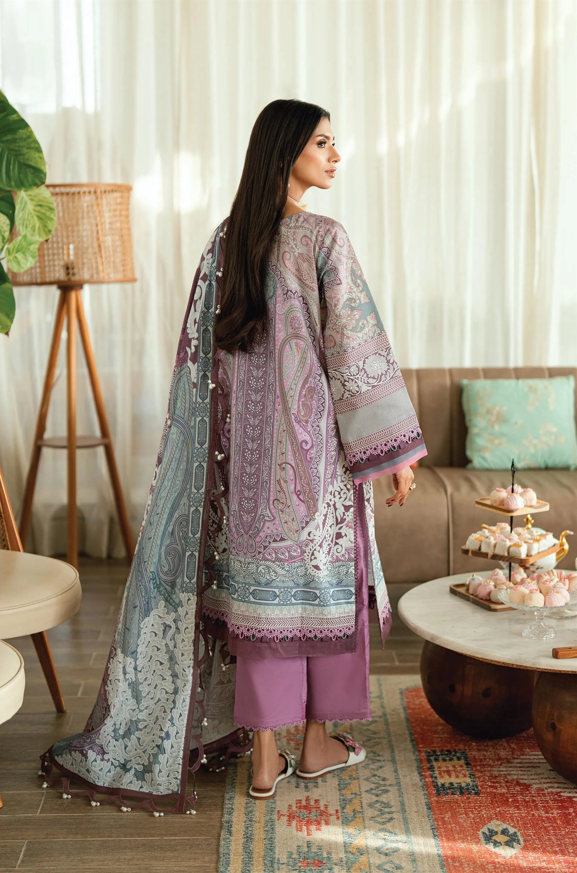 Summary: Embrace summer elegance with this stunning Pakistani suit from the Jade Urbane Lawn Prints collection. The kameez features a sophisticated color palette, with dominant shades of purple and grey creating a graceful visual. Crafted from high-quality, breathable lawn fabric, this outfit is designed for comfort and style during the Spring/Summer season. The intricate print on this Pakistani dress showcases a blend of traditional motifs and modern aesthetics, making it a versatile piece of ethnic wear. This unstitched summer outfit is perfect for creating a chic look for daily wear or casual social gatherings, offering a touch of understated luxury.