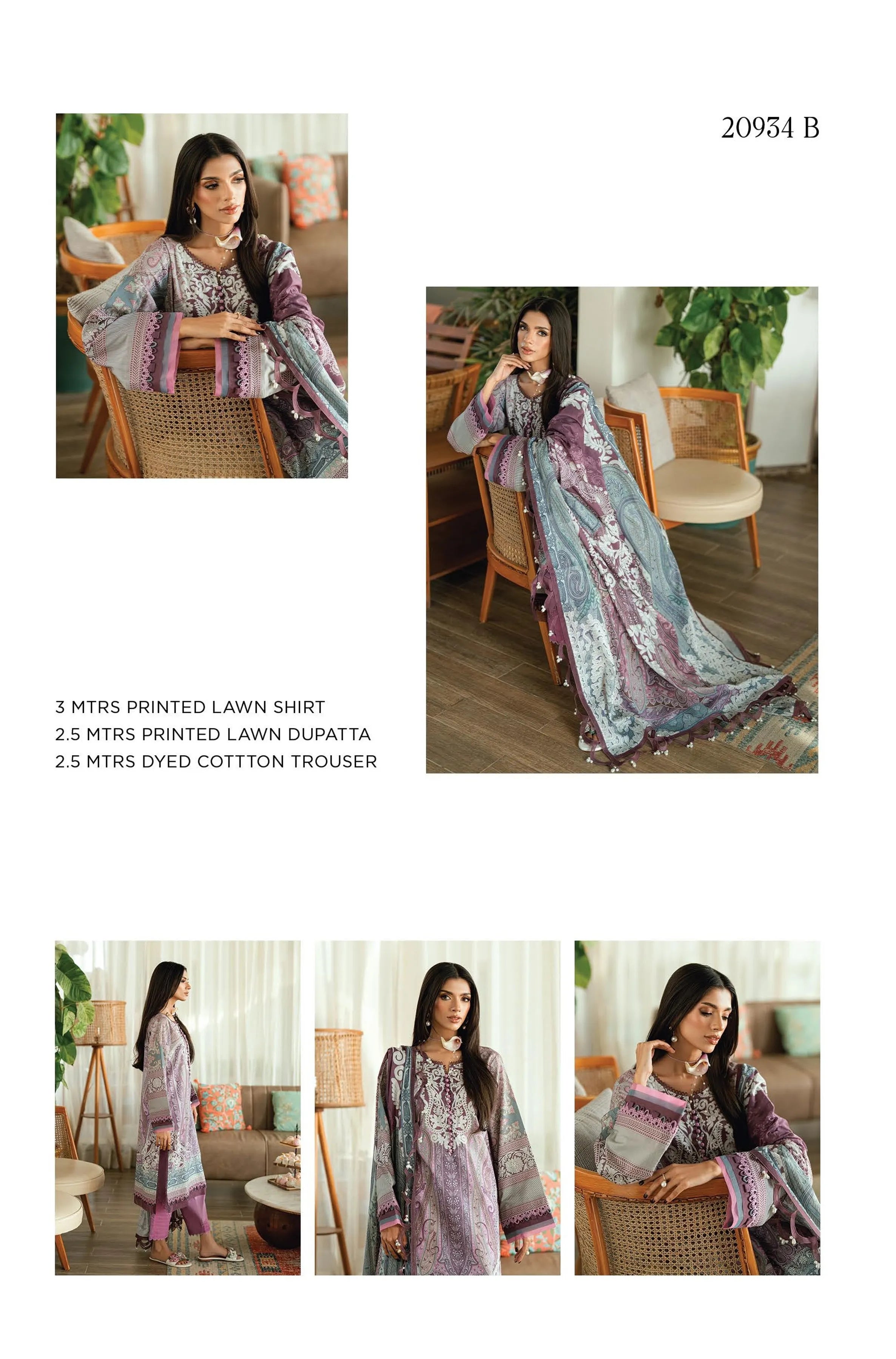 Fabric: Printed Lawn Shirt - 3 Meters Printed Lawn Dupatta - 2.5 Meters Dyed Cotton Trouser - 2.5 Meters |