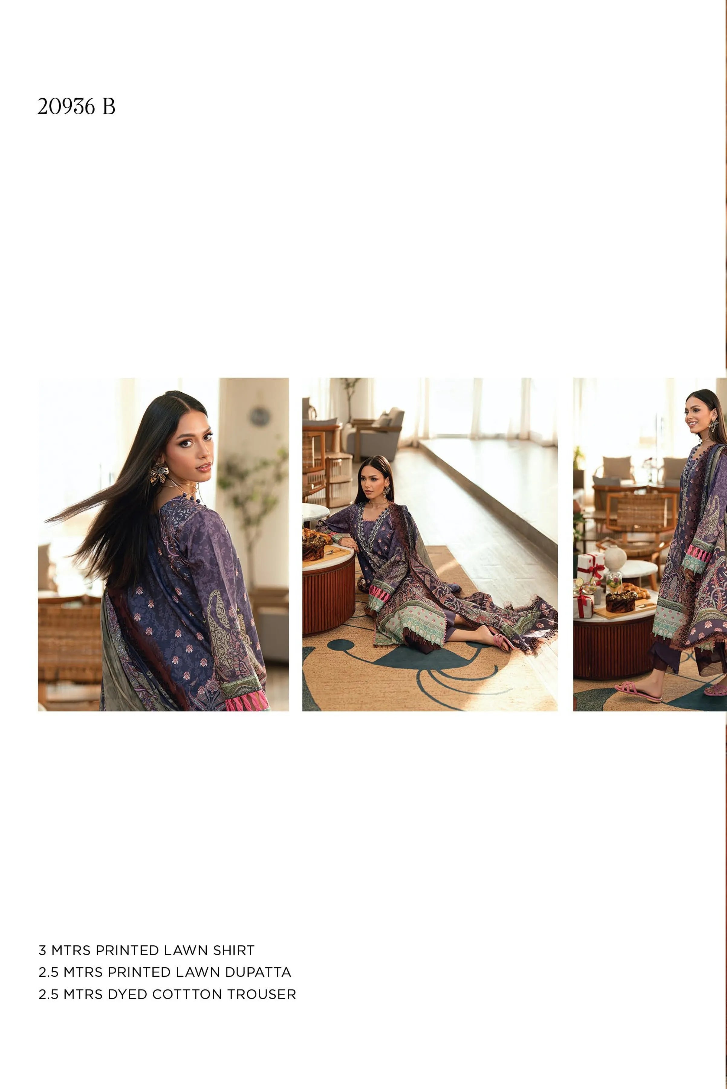 Fabric: Printed Lawn Shirt - 3 Meters Printed Lawn Dupatta - 2.5 Meters Dyed Cotton Trouser - 2.5 Meters |