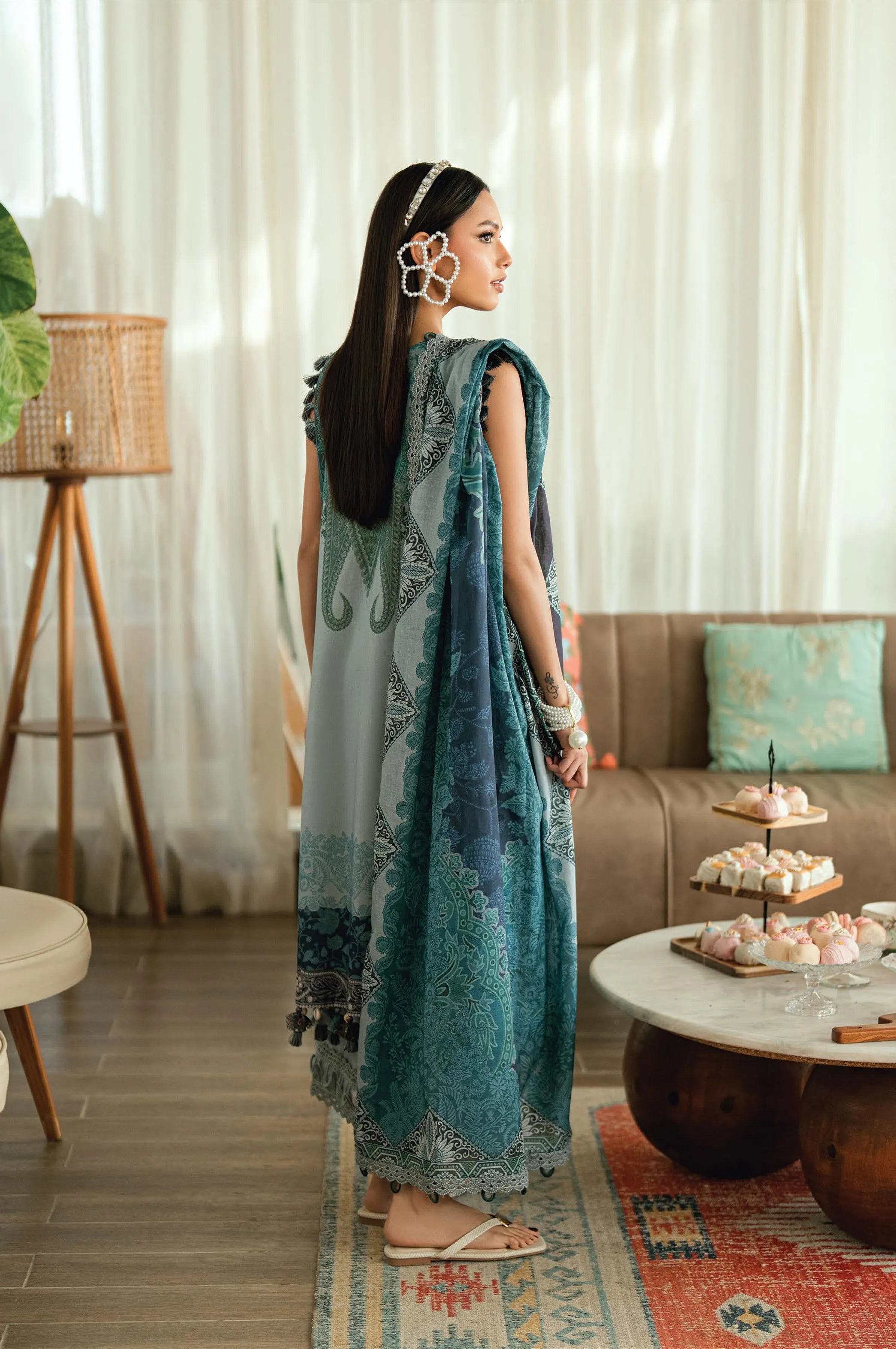 Summary: Embrace summer elegance with this stunning Sea Green Pakistani Lawn suit from Jade's Urbane collection. This unstitched dress material features a beautifully printed Lawn kameez, designed for breathability and comfort during the warmer Spring/Summer months. The shirt showcases an intricate blend of traditional motifs in serene shades of sea green and blue, making it a versatile piece of ethnic wear. Perfect for daily wear or casual gatherings, this summer outfit exudes sophisticated charm. Style this Pakistani dress to your preference for a chic look at an Eid lunch or a casual day out.