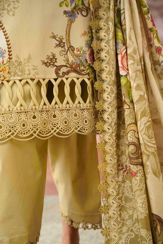 Summary: Embrace timeless elegance with the 'Jade Jal Summer Lawn – Dusk', an exquisite Pakistani suit. This unstitched ensemble features a sophisticated Cream kameez crafted from premium, breathable Lawn fabric, making it a quintessential summer outfit. The shirt is adorned with a delicate digital print, beautifully enhanced by intricate lace and cutwork detailing on the sleeves and hemline. This Pakistani Lawn Dress seamlessly blends comfort with style, offering a graceful silhouette. Ideal for elevated daily wear, daytime gatherings, or as a chic Eid outfit, this ethnic wear piece is a must-have for your festive wardrobe.