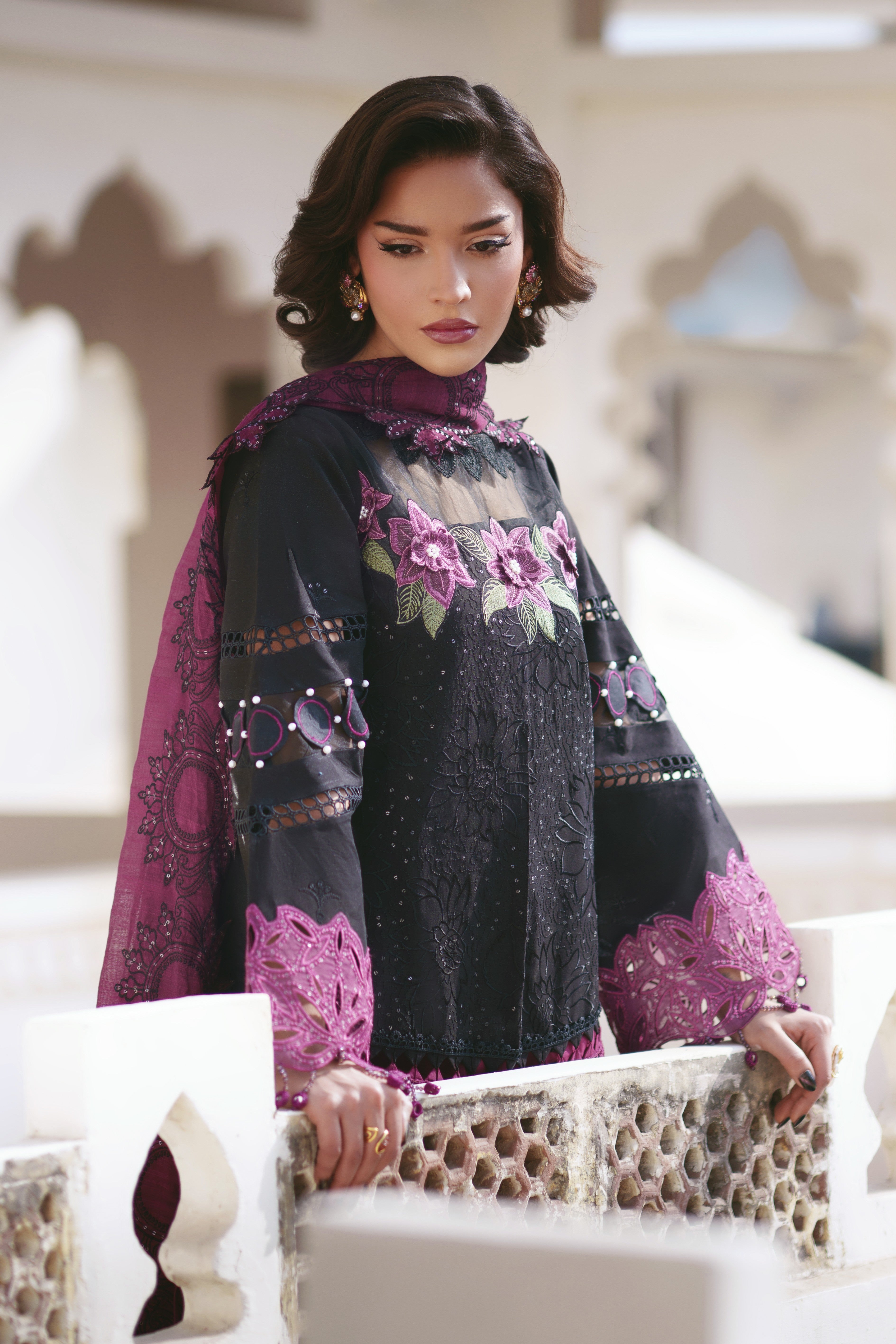 Summary: Embrace timeless elegance with this black Pakistani Lawn suit from the Parishay Shangrila Summer collection. This unstitched ethnic wear masterpiece is crafted from breathable lawn, making it ideal for warmer seasons. The kameez is a canvas of intricate art, featuring a heavily embroidered front, a distinct neckline, a detailed daman (hem), and ornate sleeves adorned with a 3D flower set. As a sophisticated piece of festive clothing, this black Pakistani dress is a perfect choice for evening functions and party wear, offering a blend of traditional craftsmanship and modern style. This outfit is an ideal selection for Eid gatherings or wedding festivities.