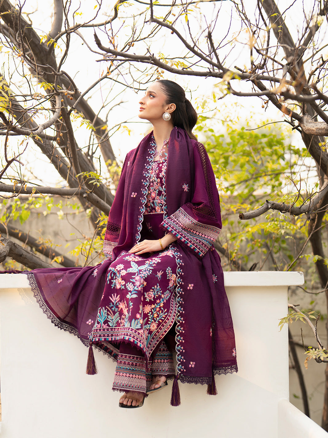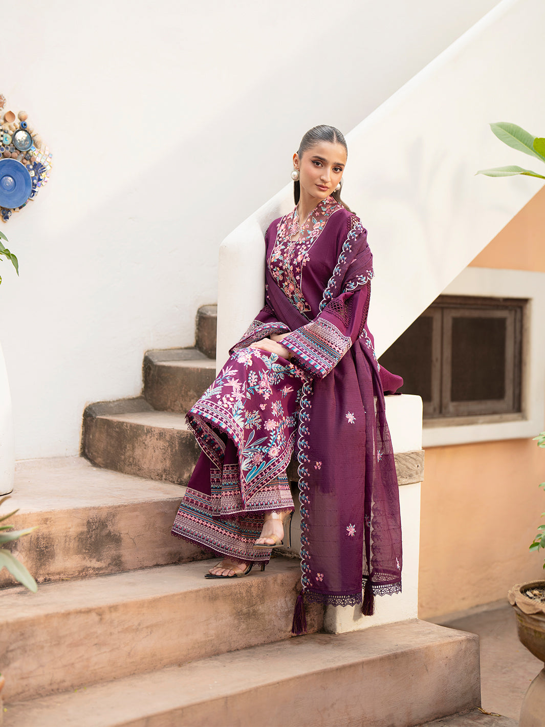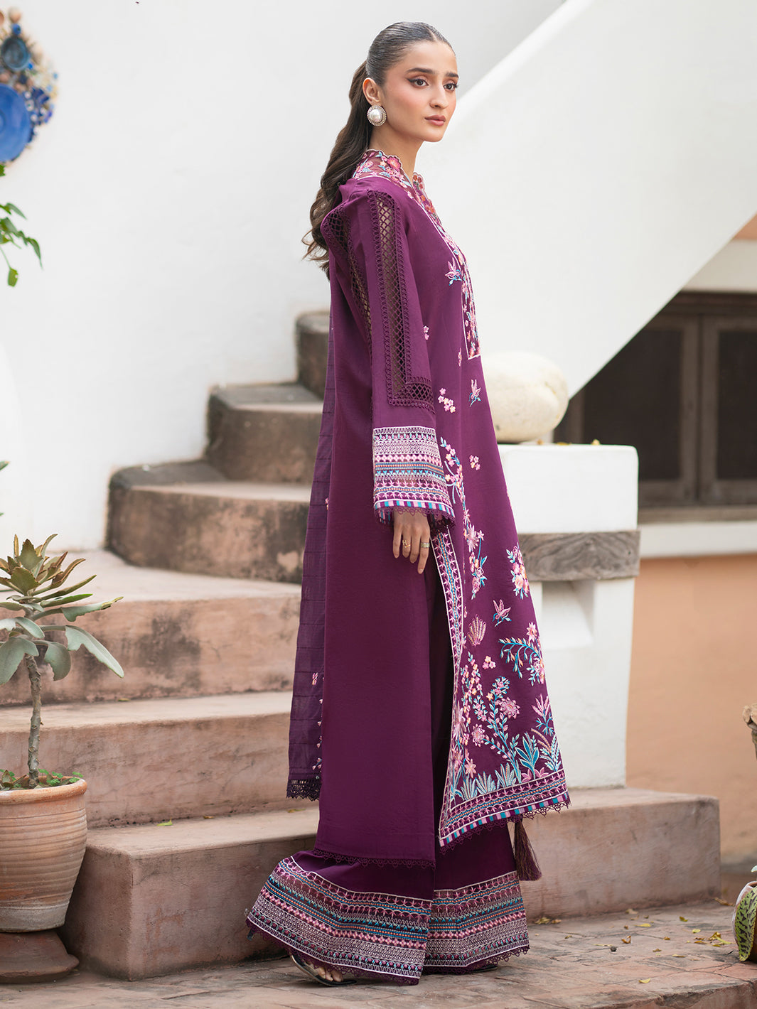 Summary: Elevate your summer wardrobe with this stunning purple Pakistani lawn suit from the Mahnur Angan collection (AN-008). The unstitched ensemble highlights a premium lawn shirt featuring intricate floral embroidery in vibrant pinks and blues across the neckline and front, creating a sophisticated contrast against the deep purple fabric. Paired with a breathable fancy Munarik net dupatta and dyed cambric trousers, this dress perfectly balances traditional elegance with modern style. Ideal for the Spring/Summer season, its lightweight texture ensures comfort, while the detailed craftsmanship makes it a perfect choice for Eid, garden parties, and festive gatherings. Embrace the charm of Pakistani ethnic wear with this chic purple outfit that promises a graceful silhouette. Shop this exquisite festive lawn dress online to complete your seasonal look.