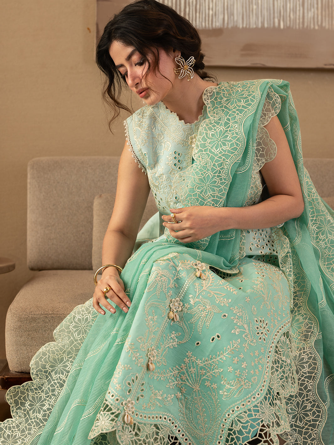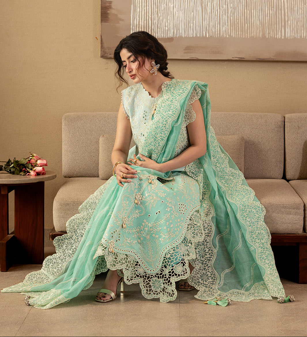 Summary: Elevate your summer wardrobe with the Mahnur Sirene Luxury Lawn S-08, beautifully modeled by Sajal Aly. This exquisite Pakistani suit features a refreshing Sea Green Lawn kameez adorned with intricate embroidery and delicate cutwork, offering breathable comfort for the warm season. Paired with a lavishly embroidered Net dupatta featuring scalloped borders, this unstitched ensemble radiates festive sophistication. Perfectly suited for Eid gatherings, daytime weddings, or formal lunches, this sea green dress blends traditional craftsmanship with modern pastel aesthetics. Shop this luxury lawn outfit online for a timeless ethnic look.