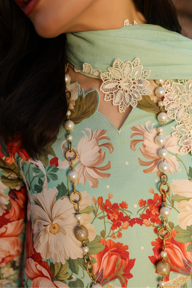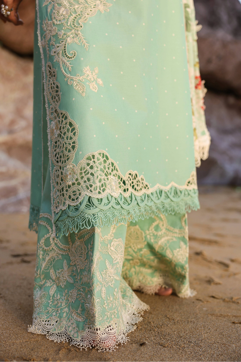 Fabric: Marina is a floral delight on an ocean turquoise base, a 3-piece outfit bringing spellbinding seasonal freshness. The digitally printed lawn shirt in bold tangerine florals features organza cutwork patches and a charismatic embroidered on hem and trouser fabric. Being the highlight, the meticulously detailed crème embroidery on the cambric trouser base is paired with a digitally printed voile dupatta, making it a pretty & unique choice for your summer wardrobe. COLOR: TURQUOISE |