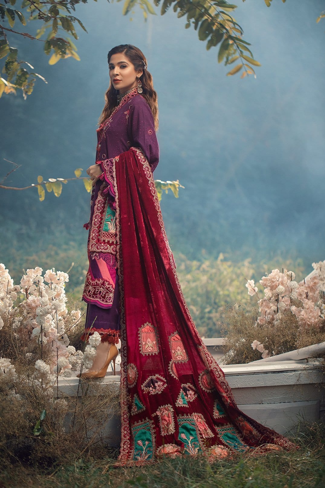 Velvet Embroidered shawl with the appliqué of silk 2.5MTR