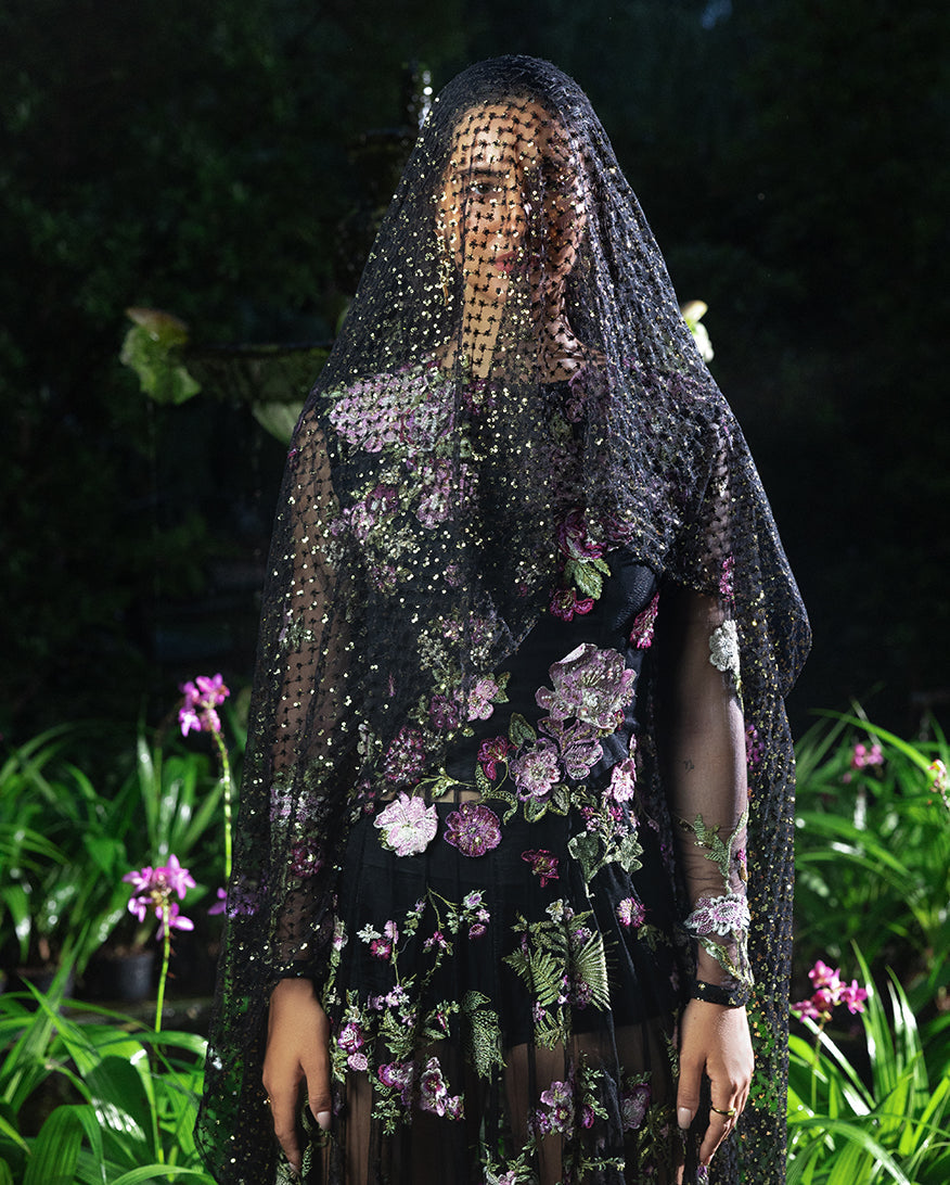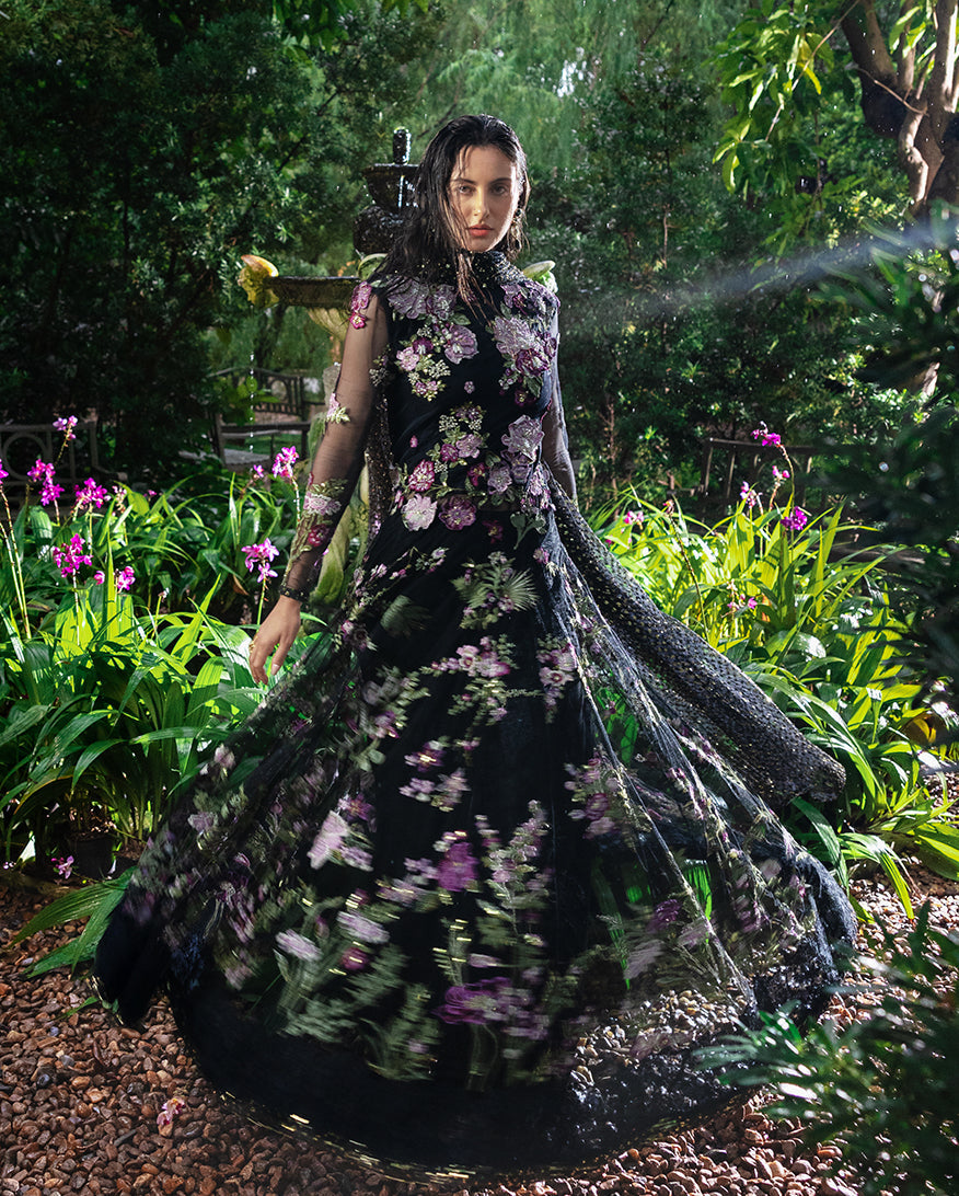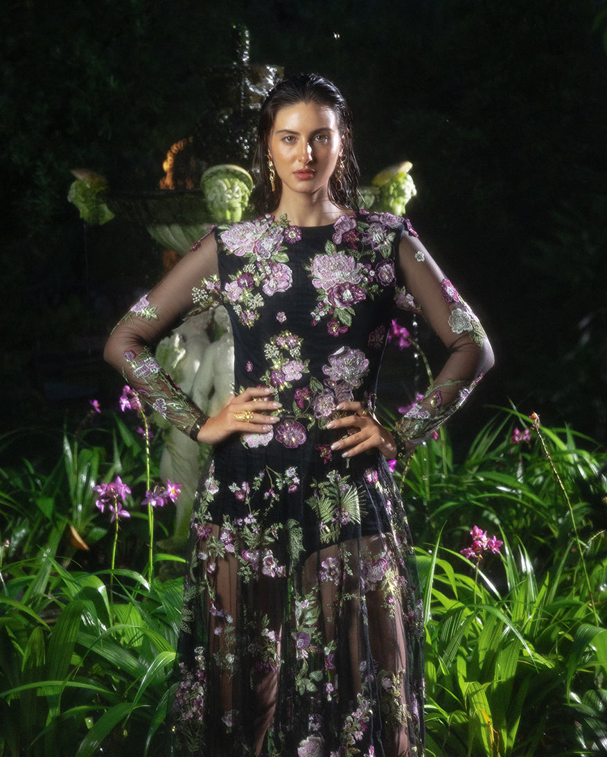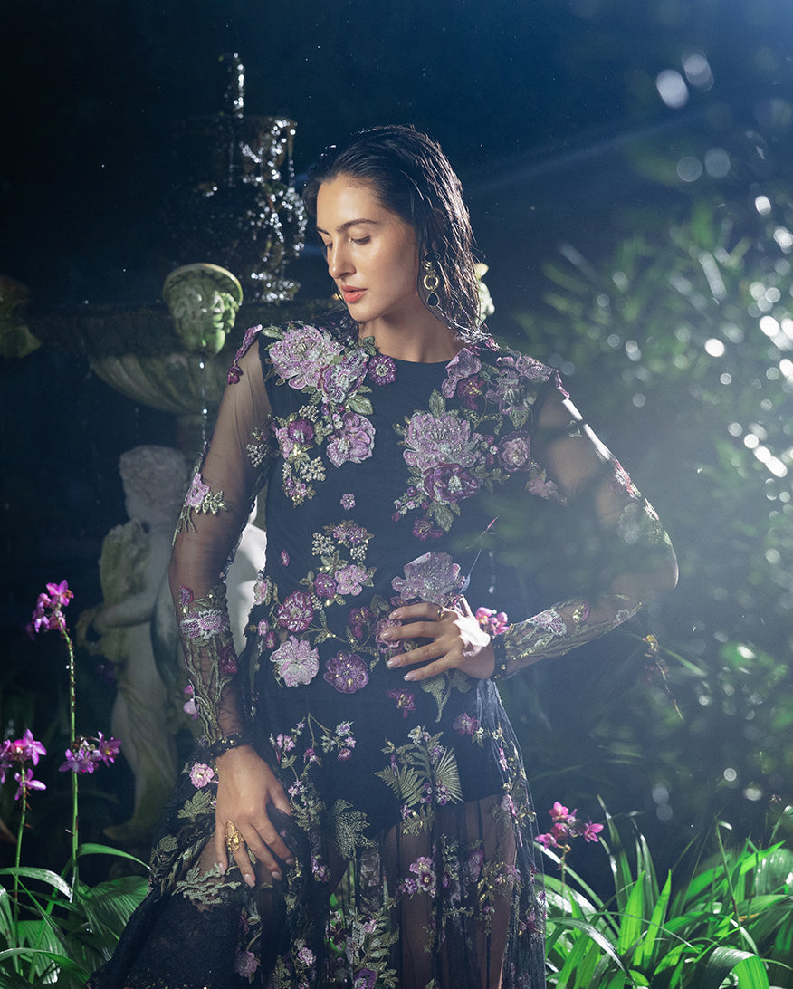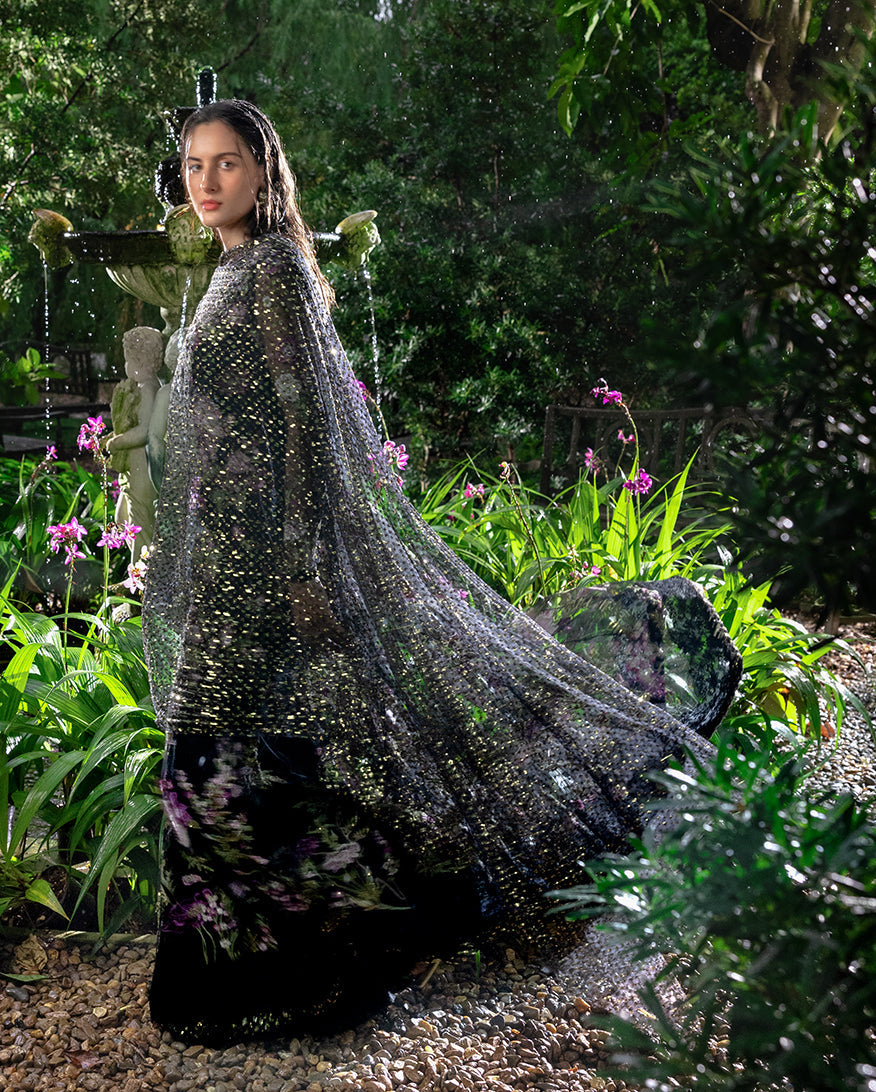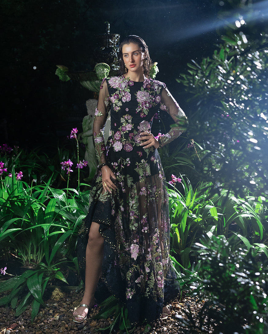 Fabric: Shirt: • Hand-embellished front yoke (net) • Embroidered, sequined back yoke (net) • Embroidered, sequined front & back panels (net) – 1 • Embroidered, sequined front & back panels (net) – 2 • Embroidered, sequined front & back panels (net) – 3 • Embroidered, sequined front & back panels (net) – 4 • Embroidered, sequined front & back panels (net) – 5 • Embroidered, sequined front & back panels (net) – 6 • Embroidered, sequined front & back panels (net) – 7 • Embroidered, sequined front & back panels (net) – 8 • Embroidered, sequined front & back panels (net) – 9 • Embroidered, sequined front & back panels (net) – 10 • Embroidered, sequined front & back panels (net) – 11 • Embroidered, sequined front & back panels (net) – 12 • Embroidered, sequined sleeves (net) • Embroidered, sequined front & back daman border (net) Dupatta: • Sequined net dupatta Undershirt: • Dyed undershirt Trouser: • Dyed raw silk trouser |