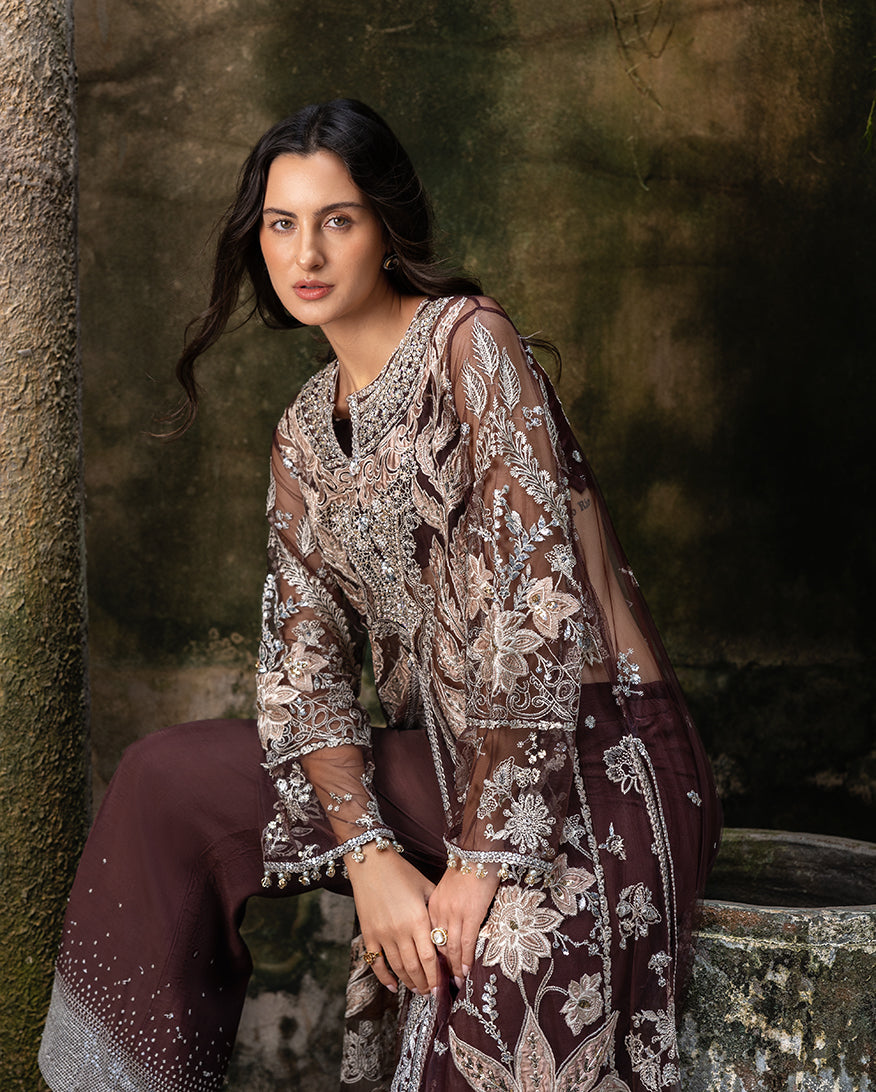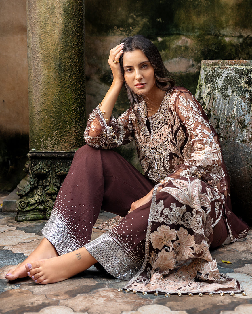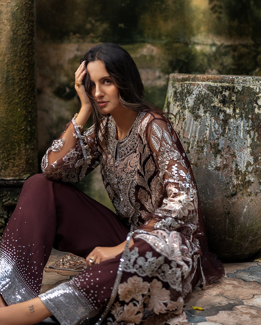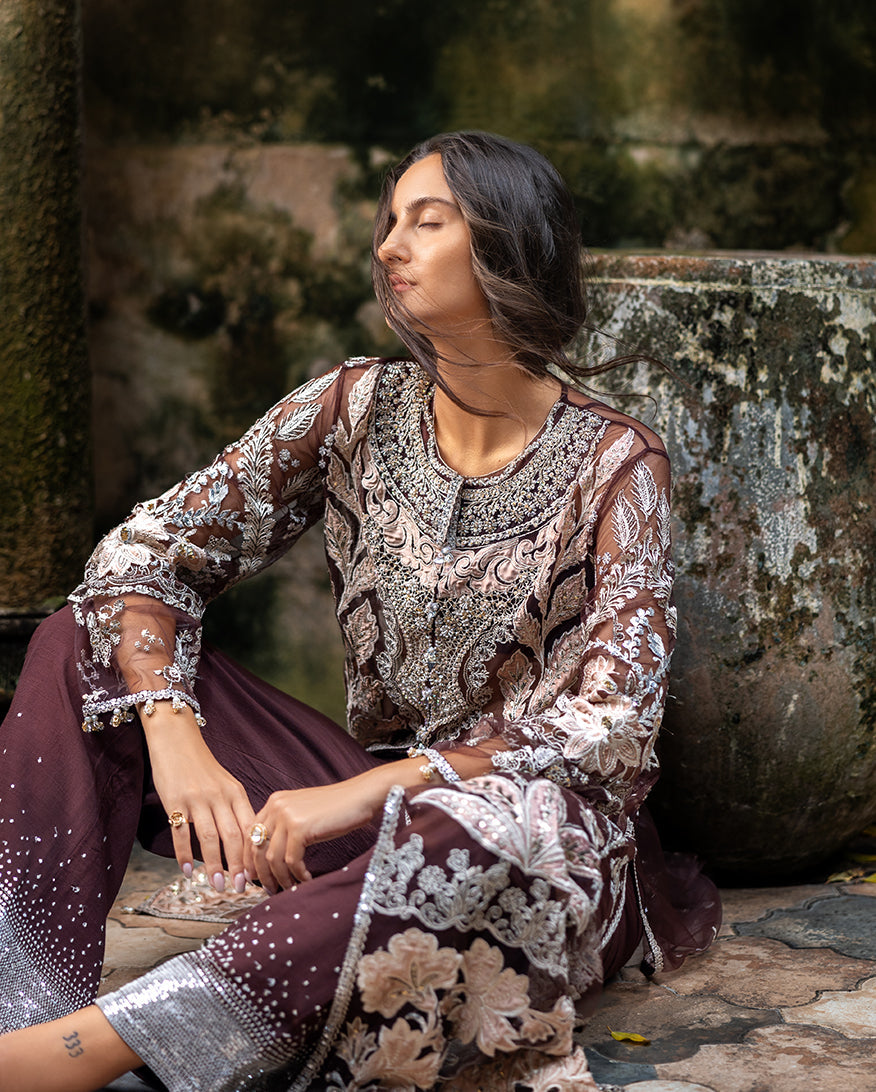 Fabric: Shirt: • Hand-embellished & appliquéd left panel • Hand-embellished & appliquéd right panel • Embroidered, sequined side panel (net) • Embroidered, sequined & appliquéd sleeves (net) • Embroidered, sequined & appliquéd daman motif (net) • Embroidered, sequined back motif (silk) • Embroidered, sequined back (net) • Embroidered, sequined sleeves border (net) • Embroidered, sequined finishing lace (organza) 1 • Embroidered, sequined finishing lace (organza) 2 • Hand-made tassels for neckline • Hand-made tassels for front & back daman Dupatta: • Sequined net dupatta • Sequined net dupatta border Trouser: • Embroidered, sequined trouser Undershirt: • Dyed undershirt |