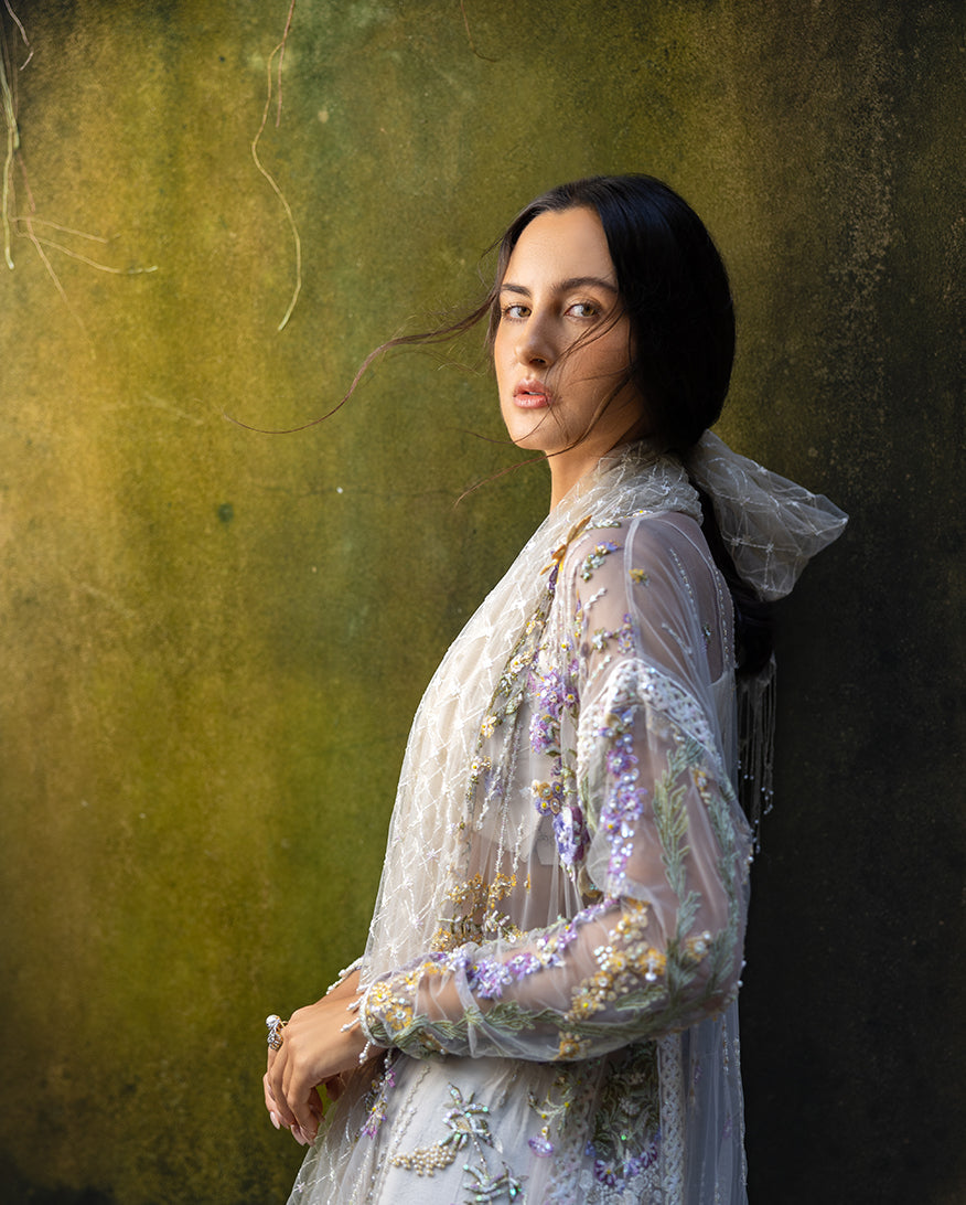 Fabric: Shirt: • Hand-embellished front left panel (net) • Hand-embellished front right panel (net) • Hand-embellished side left panel (net) • Hand-embellished side right panel (net) • Hand-embellished sleeves (net) • Hand-embellished front daman border (net) • Embroidered, sequined back (net) • Embroidered, sequined back daman border (net) • Embroidered, sequined finishing lace (organza) 1 • Embroidered, sequined finishing lace (organza) 2 • Pearls for finishing • Hand-made tassels for sleeves Dupatta: • Sequined net dupatta Trouser: • Printed silk trouser Undershirt: • Dyed undershirt |
