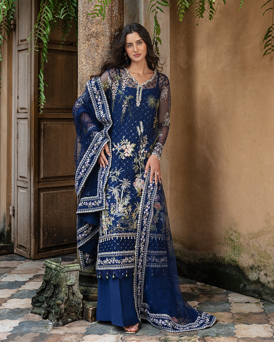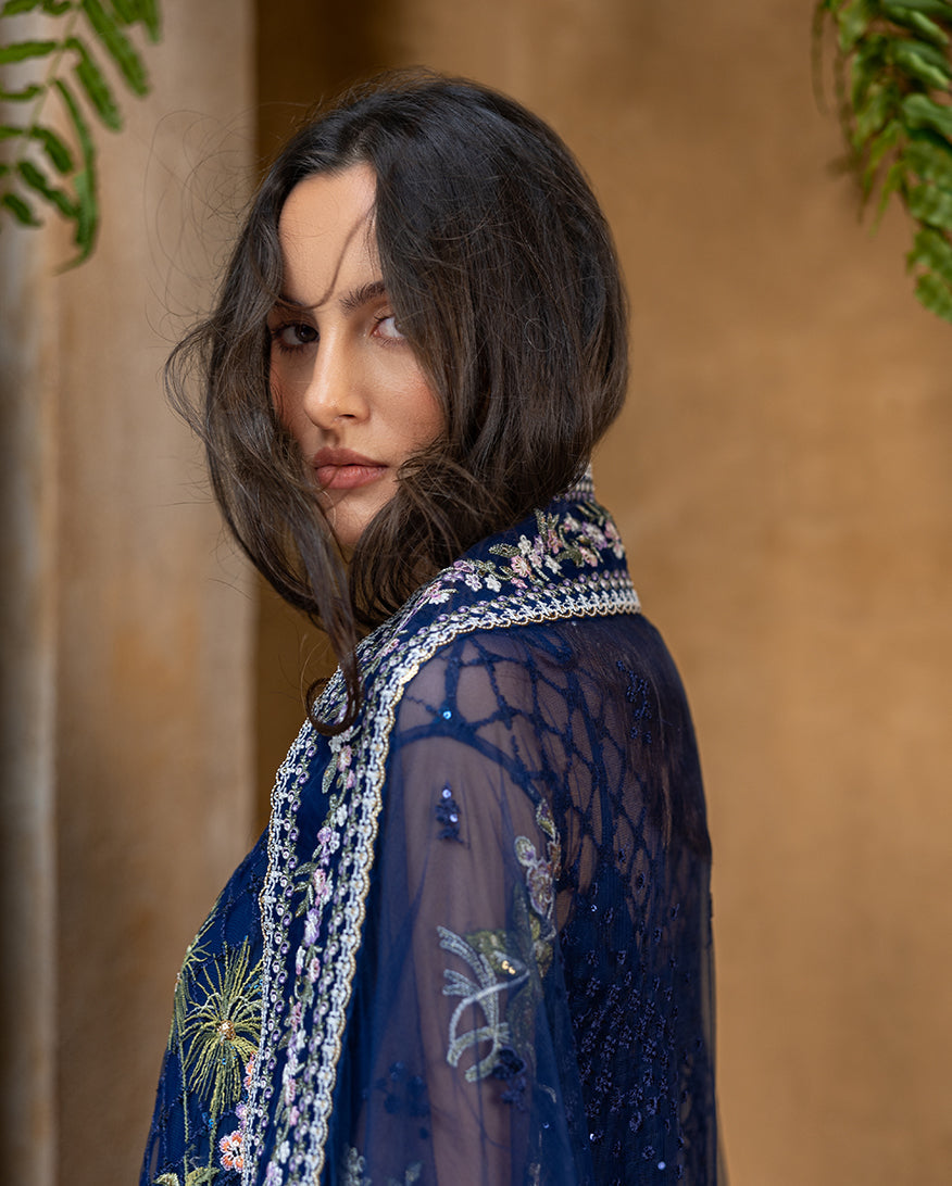Fabric: Shirt: • Hand-embellished front neckline (organza) • Hand-embellished back neckline (organza) • Hand-embellished front, back & sleeves border (organza) • Embroidered, sequined front panel (net) • Embroidered, sequined left panel (net) • Embroidered, sequined right panel (net) • Embroidered, sequined back (net) • Embroidered, sequined sleeves (net) • Hand-embellished embroidered, sequined front & back daman border (net) • Embroidered, sequined front & back daman lace (organza) • Embroidered, sequined finishing lace (organza) • Hand-made tassels for front, back & sleeves • Hand-made tassels for front & back daman Dupatta: • Sequined net dupatta • Sequined dupatta border (organza) Undershirt: • Dyed undershirt Trouser: • Dyed raw silk trouser |