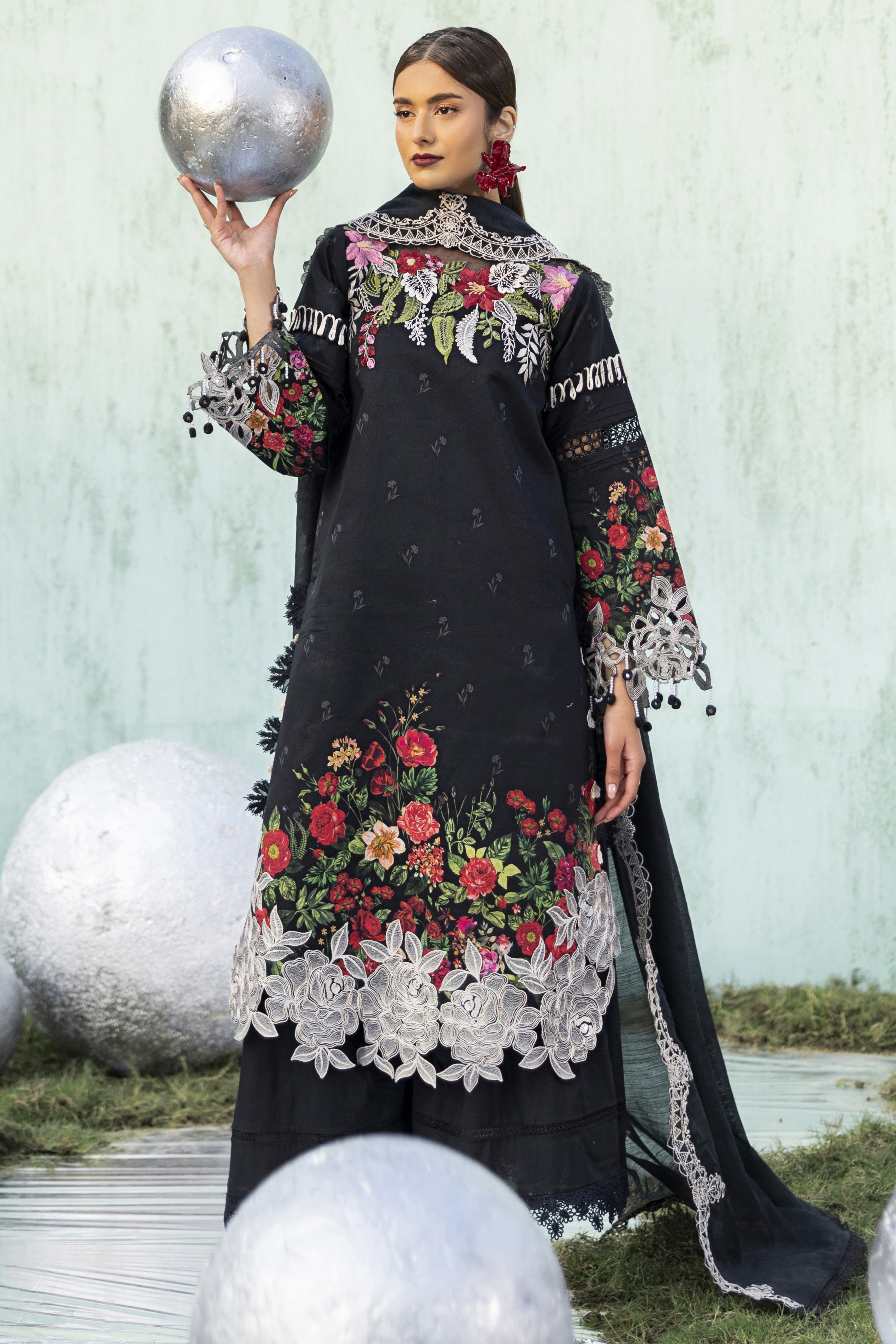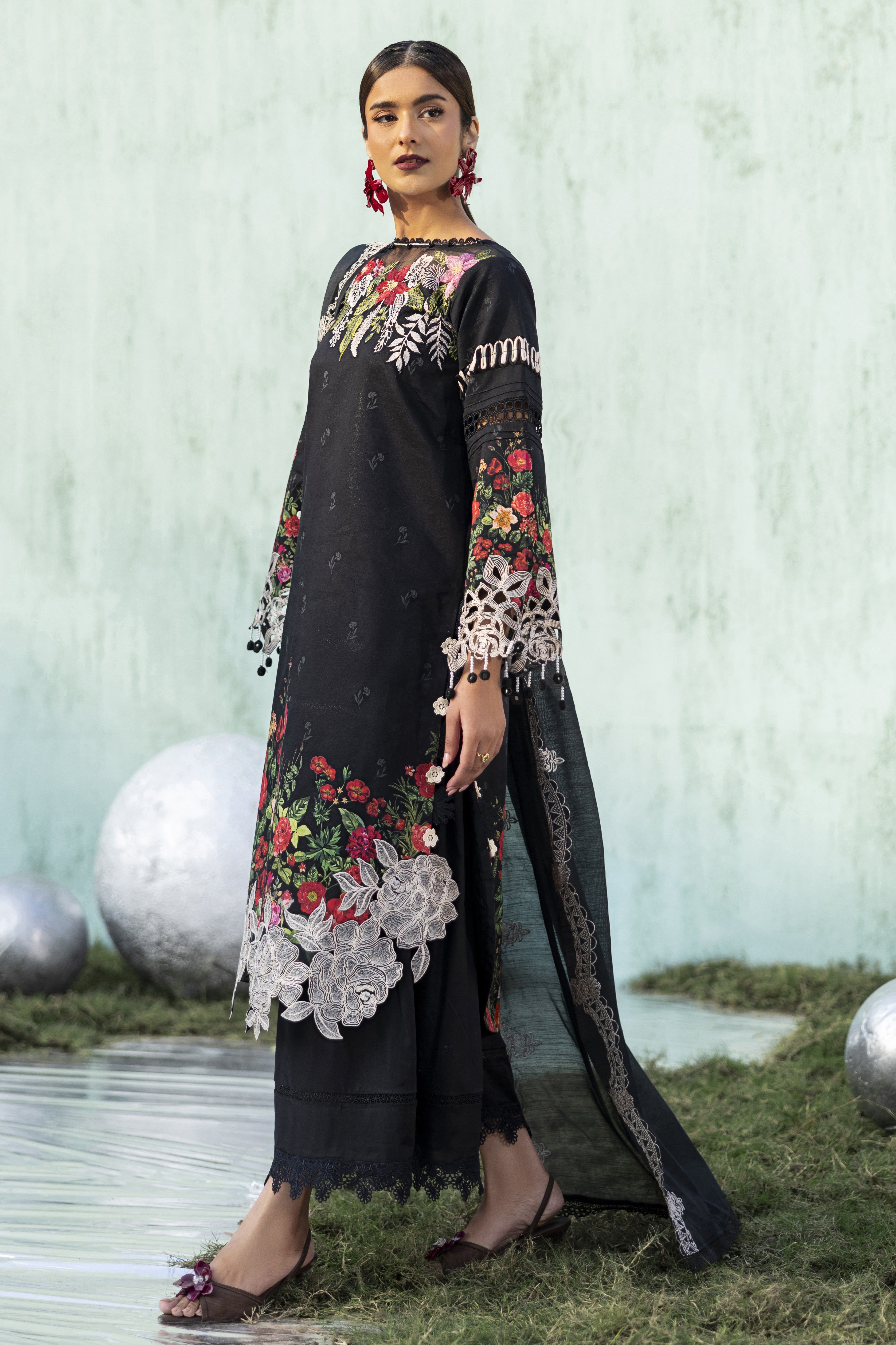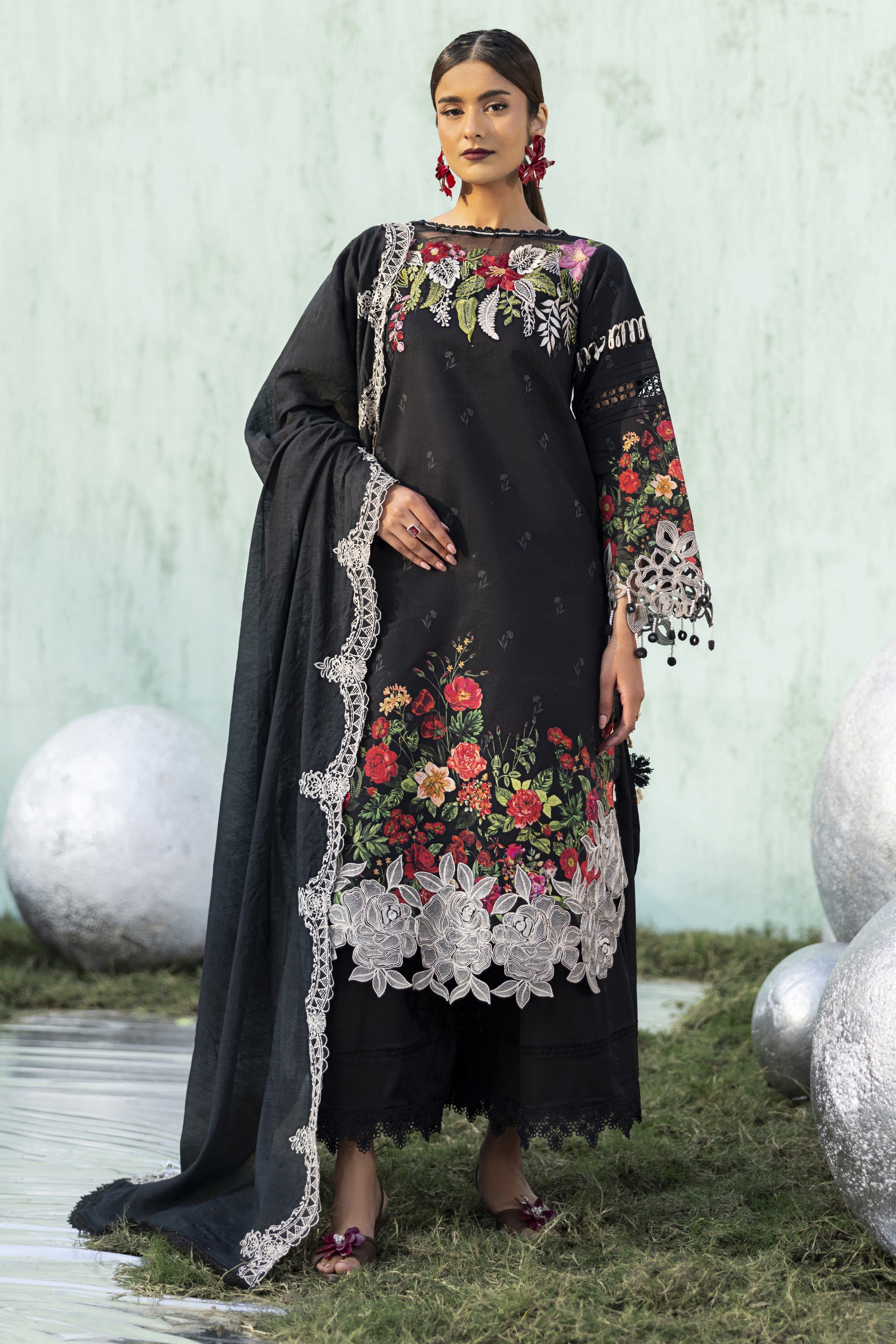 Summary: Elevate your summer wardrobe with this stunning Black Parishay Ivy Bloom Lawn suit (IB-02). This unstitched Pakistani suit features a premium digital printed lawn shirt serving as a sophisticated canvas for vibrant floral blooms in red and green. Detailed with an embroidered neckline, intricate cutwork hem borders, and sleeve accents, it perfectly blends casual comfort with festive elegance. The look is completed with a dyed cambric trouser and a beautifully embroidered Munaar dupatta that adds a layer of texture and grace. Ideal for evening gatherings, Eid festivities, or semi-formal events, this black lawn dress captures the essence of luxury ethnic wear. Shop this chic ensemble for a timeless statement.