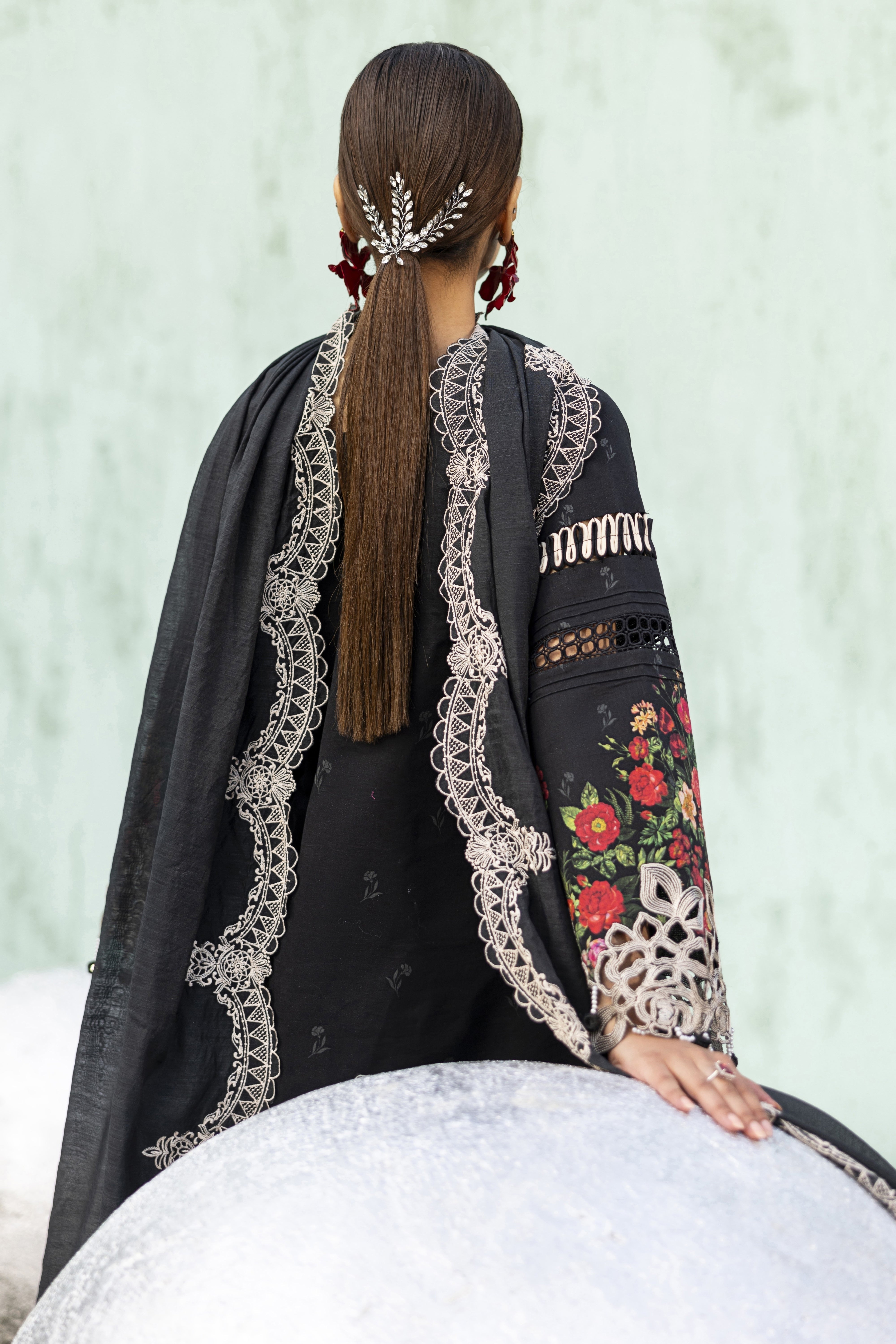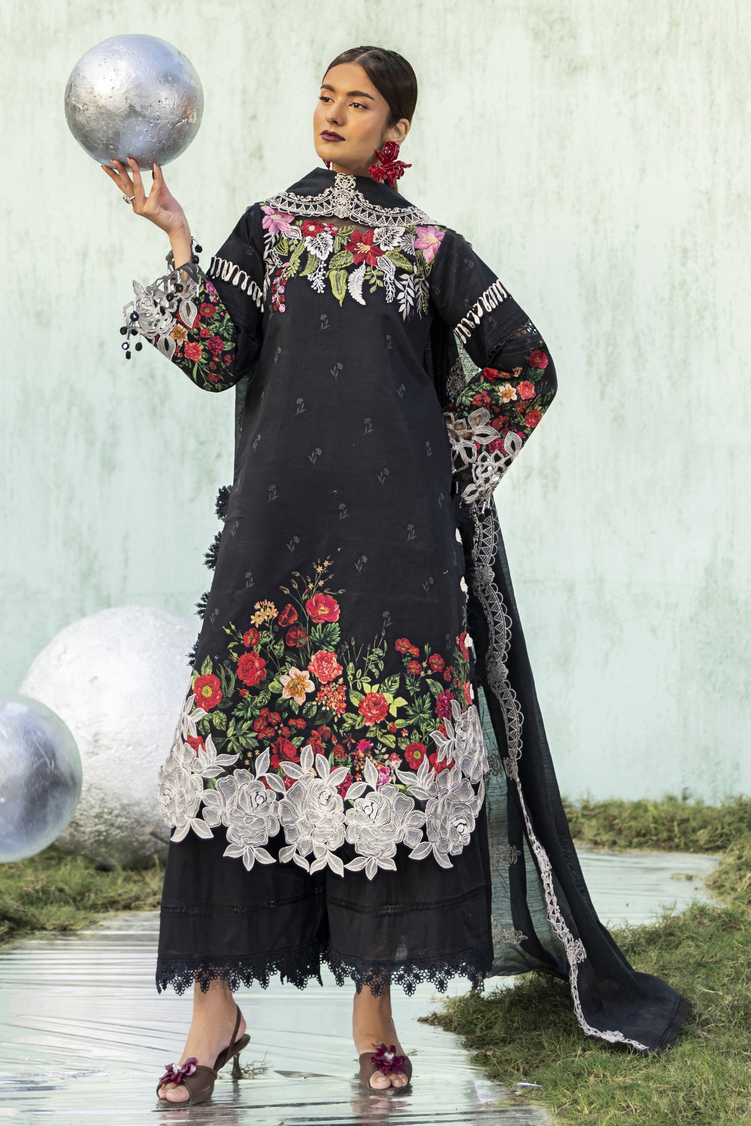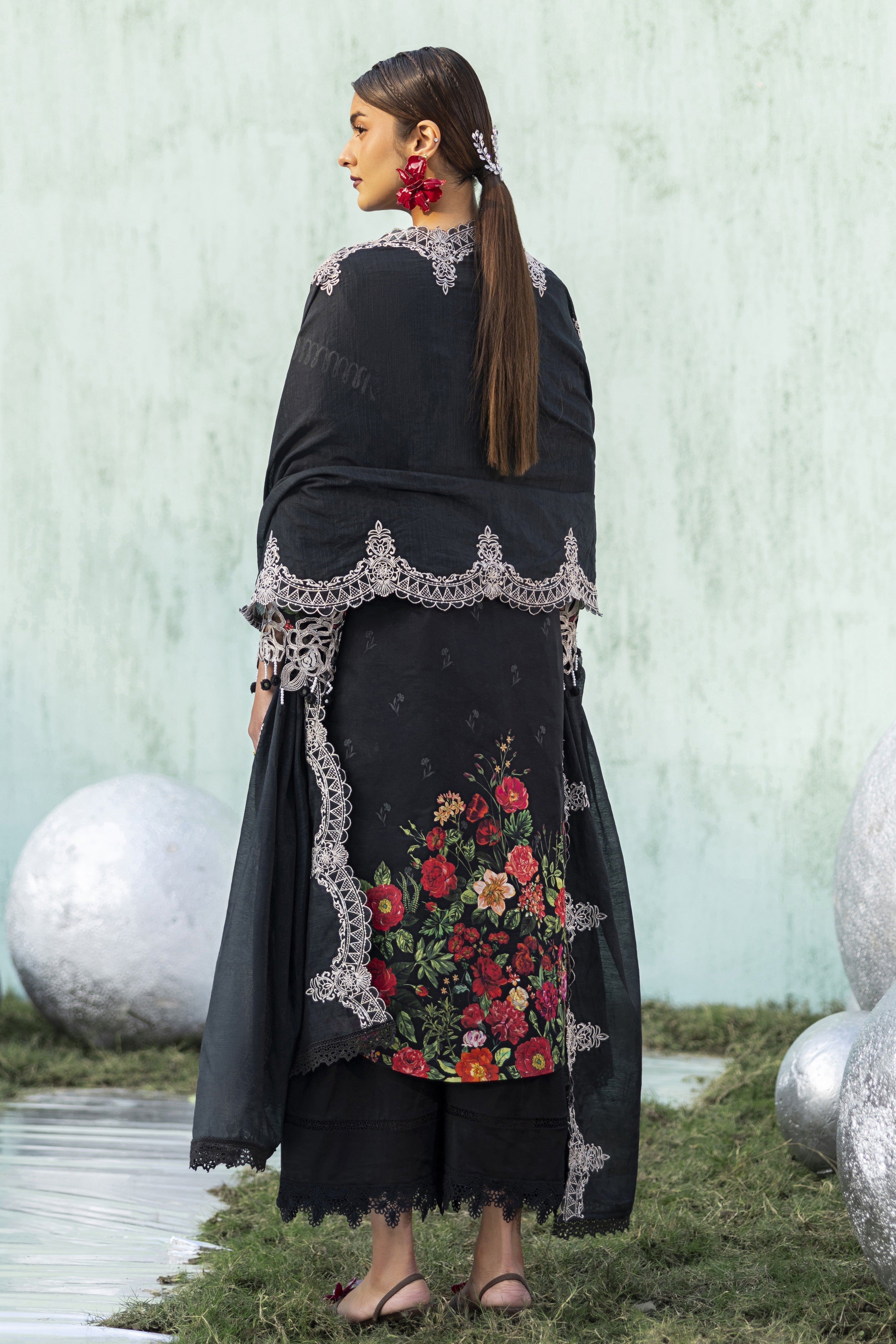 Summary: Elevate your summer wardrobe with this stunning Black Parishay Ivy Bloom Lawn suit (IB-02). This unstitched Pakistani suit features a premium digital printed lawn shirt serving as a sophisticated canvas for vibrant floral blooms in red and green. Detailed with an embroidered neckline, intricate cutwork hem borders, and sleeve accents, it perfectly blends casual comfort with festive elegance. The look is completed with a dyed cambric trouser and a beautifully embroidered Munaar dupatta that adds a layer of texture and grace. Ideal for evening gatherings, Eid festivities, or semi-formal events, this black lawn dress captures the essence of luxury ethnic wear. Shop this chic ensemble for a timeless statement.