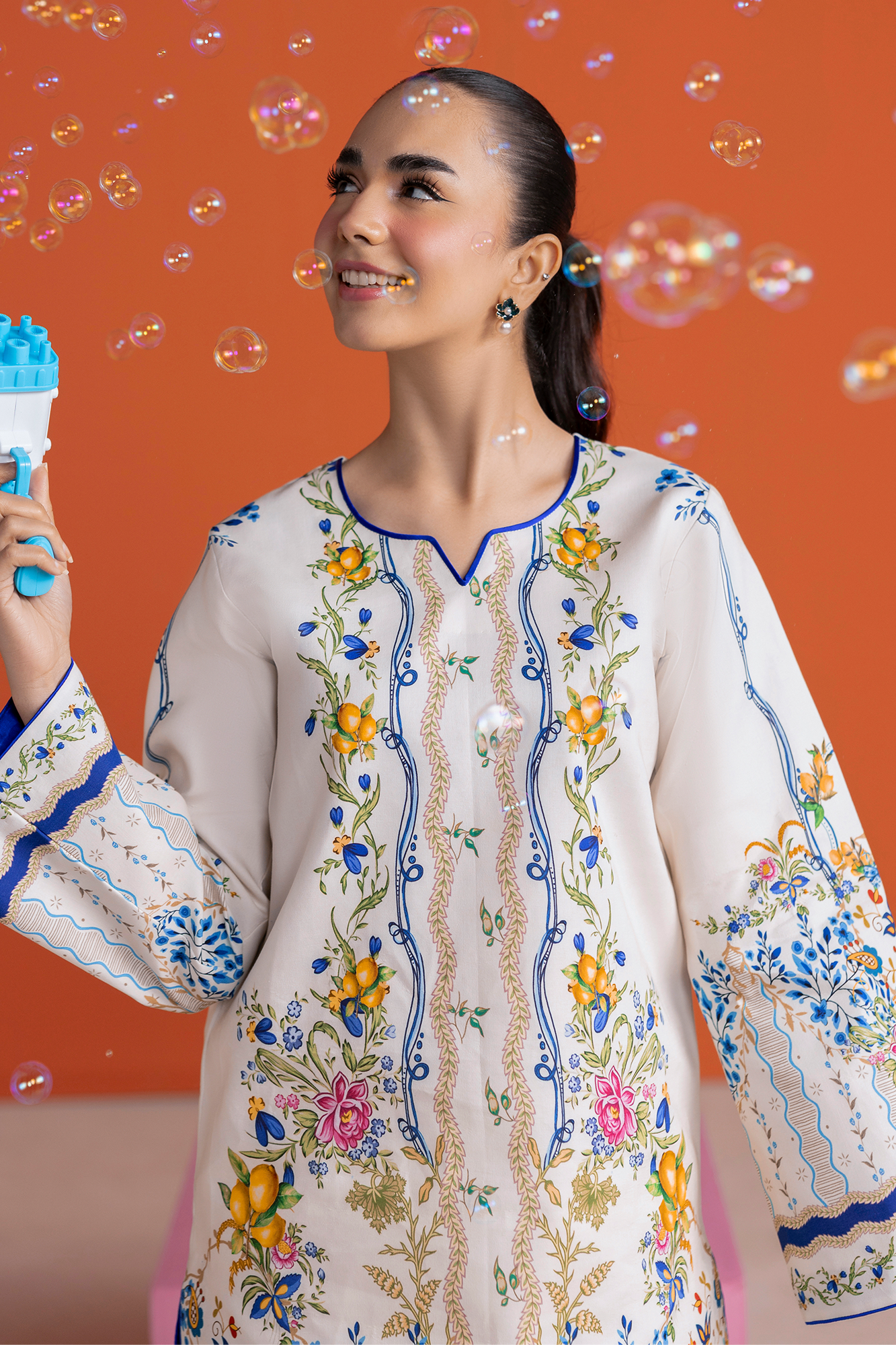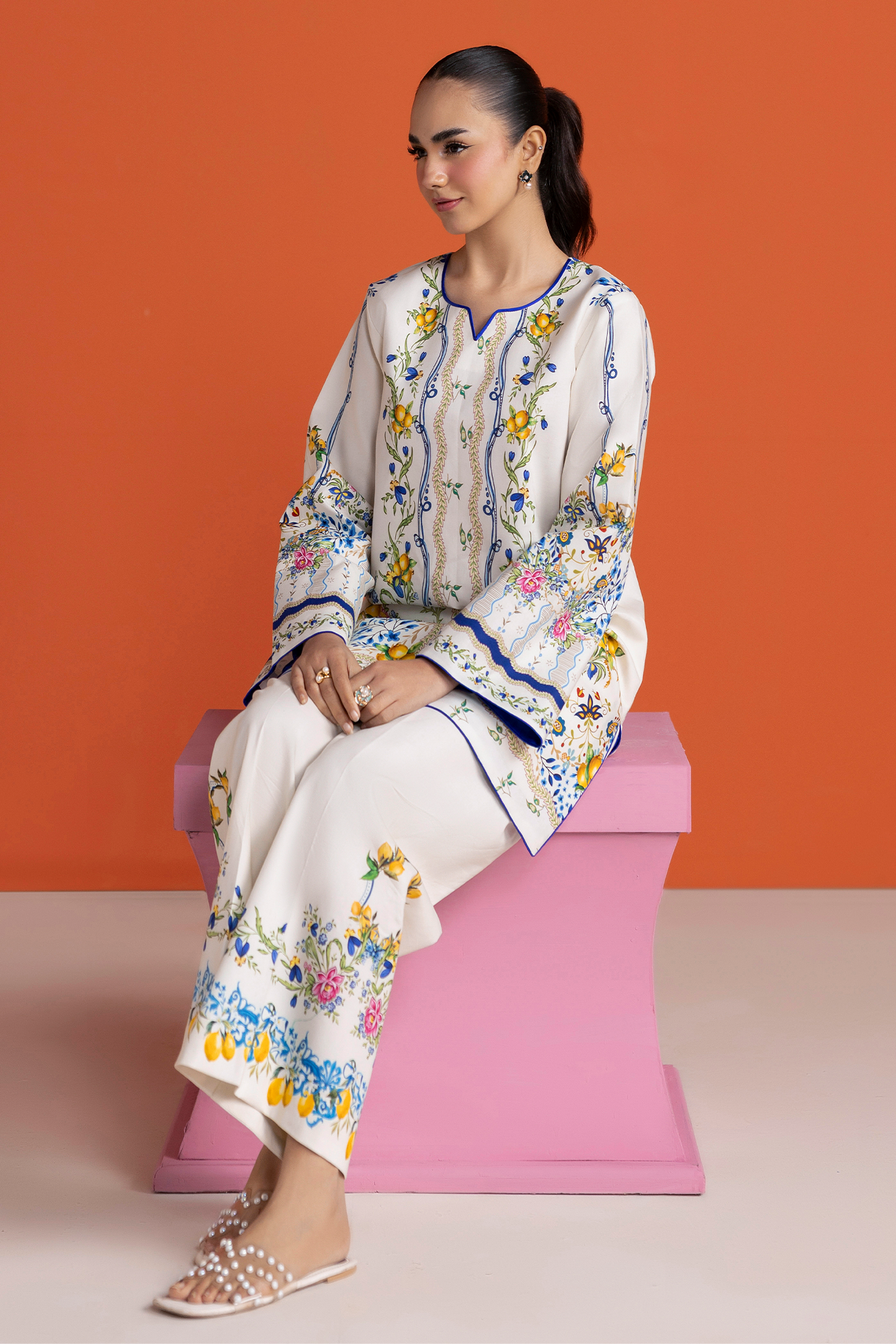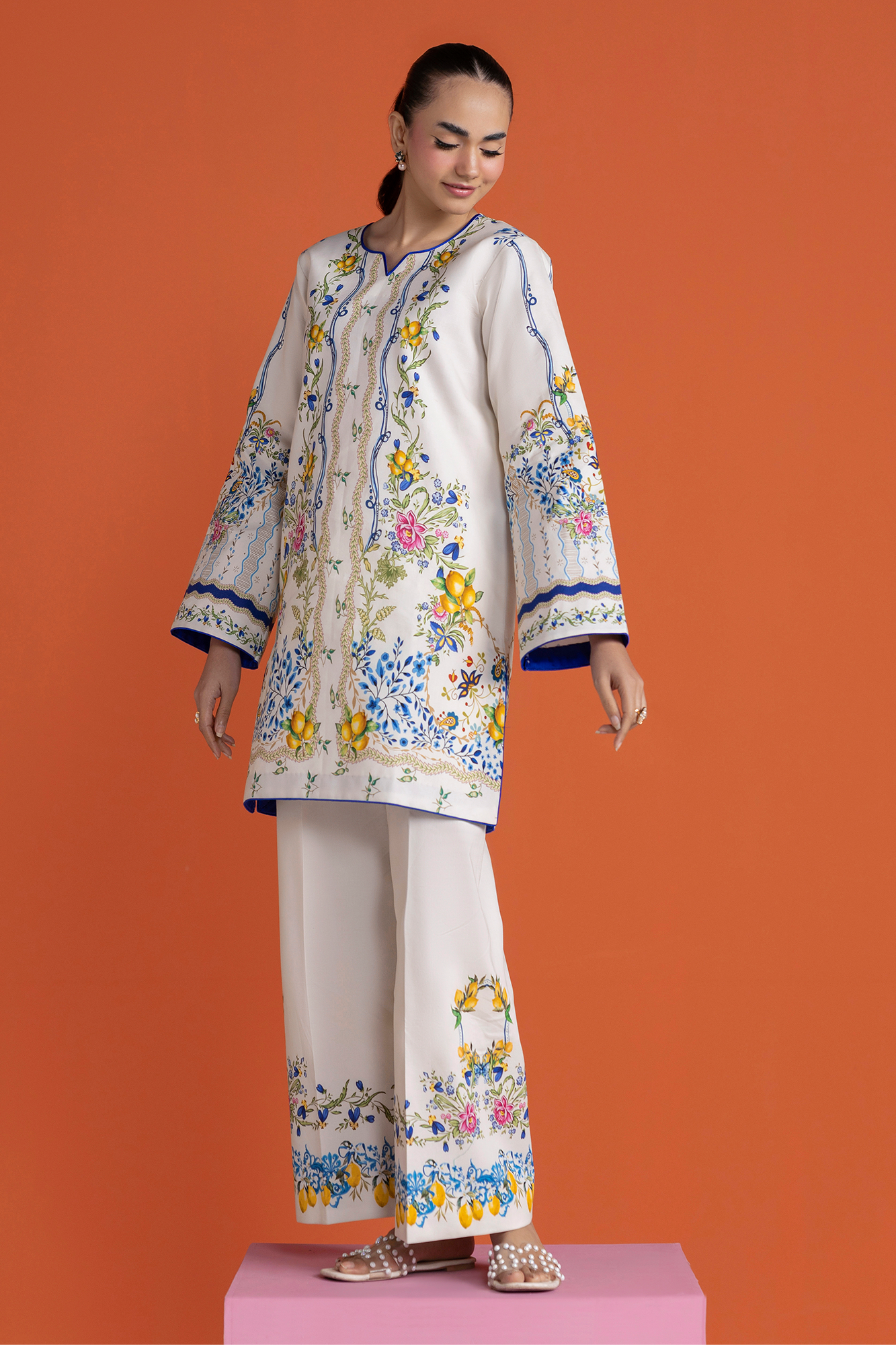 Summary: Embrace summer elegance with the RajBari Amal Summer Prints D-03, a stunning 2-piece Pakistani co-ord set. This unstitched suit features a premium lawn shirt in a pristine off-white shade, serving as a canvas for a vibrant digital print. Delicate floral vines and citrus motifs in shades of blue and yellow adorn the kameez, creating a fresh, botanical look. The breathable lawn fabric makes this ethnic wear exceptionally comfortable for the warmer Spring/Summer months. This Pakistani lawn dress is perfect for daily wear or casual gatherings, offering a blend of traditional design and contemporary style. An ideal choice for your summer wardrobe.