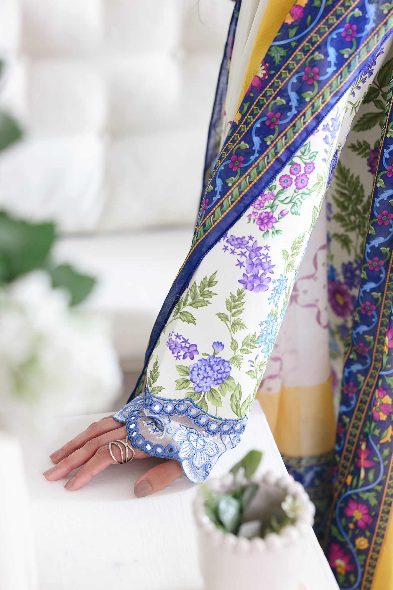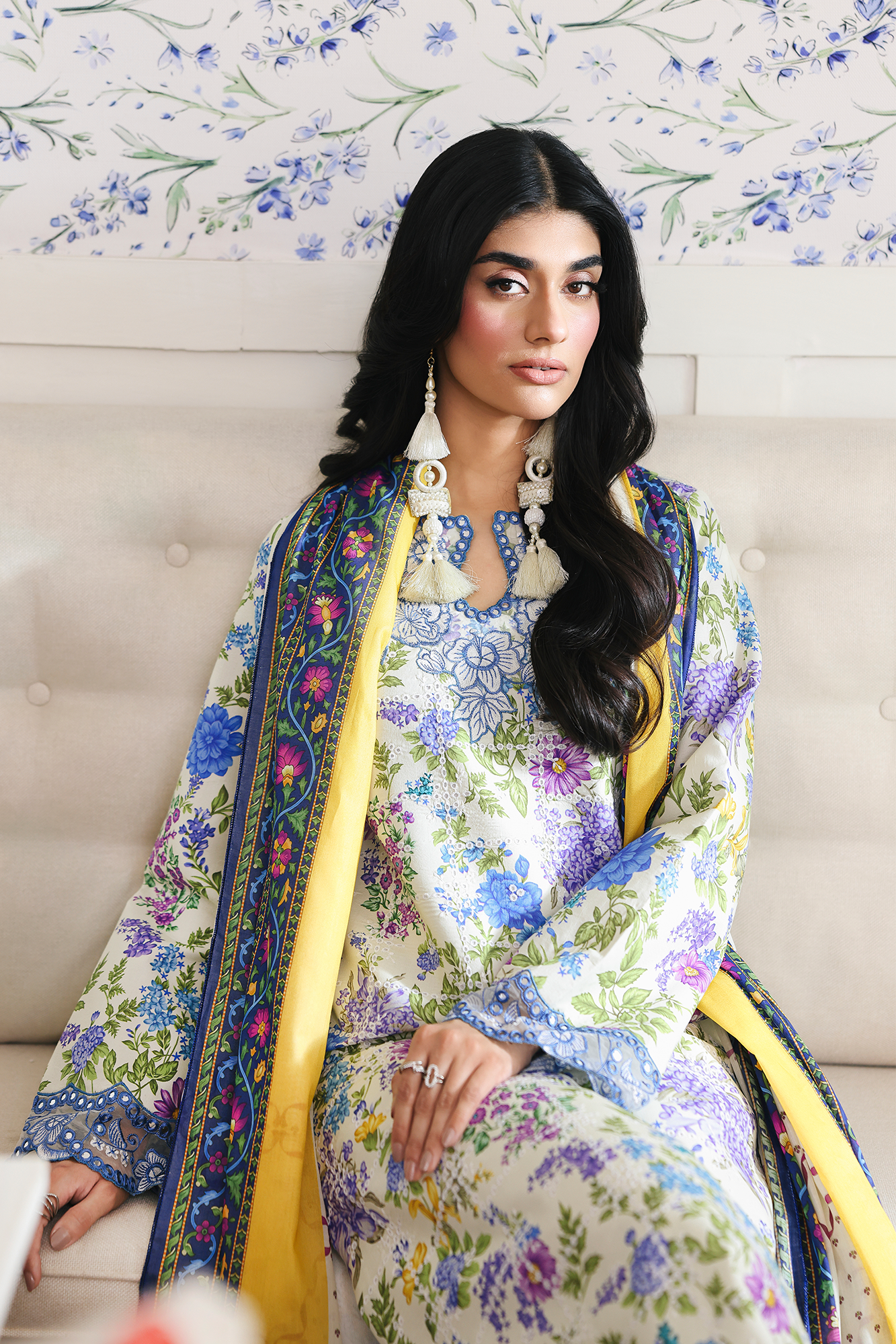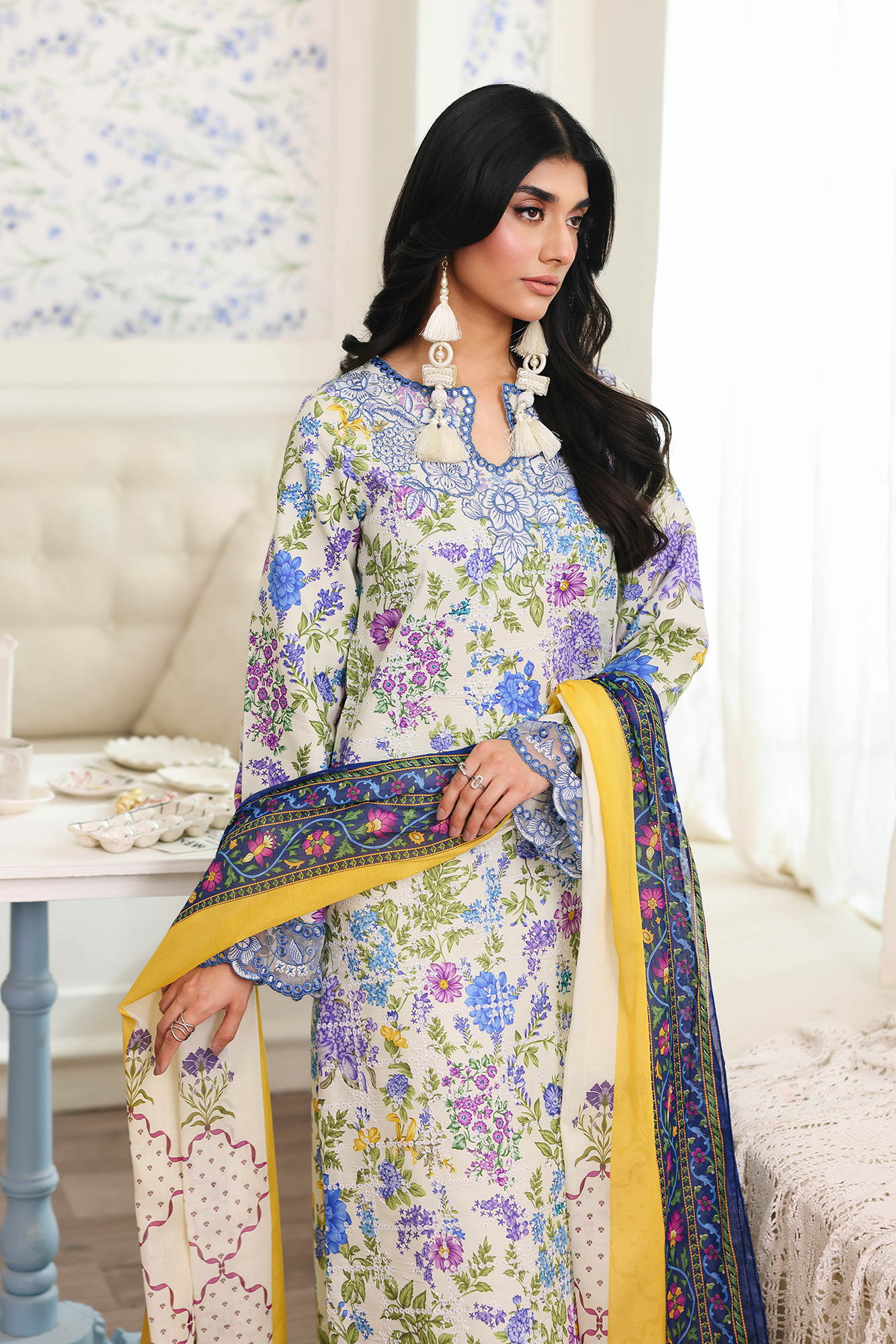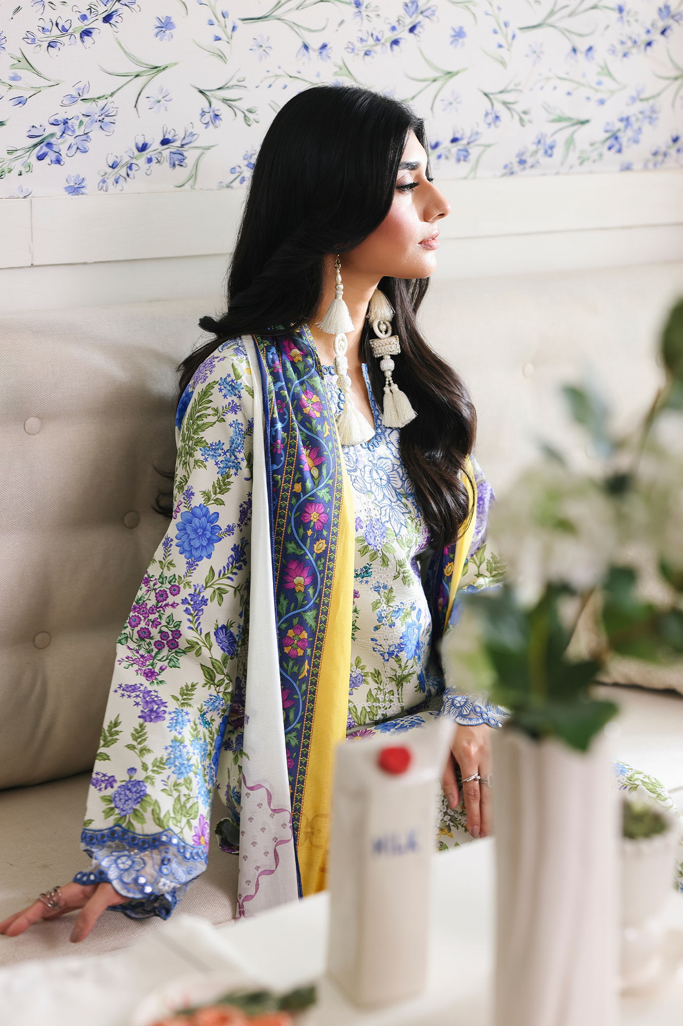 Fabric: Chikan Embroidered & Printed Lawn Front Digital Printed Lawn Sleeves & Back Embroidered Border for sleeves Embroidered Hem Border Embroidered Neckline on Organza Dyed cotton Trouser Digital Printed Primium Voil Dupatta |