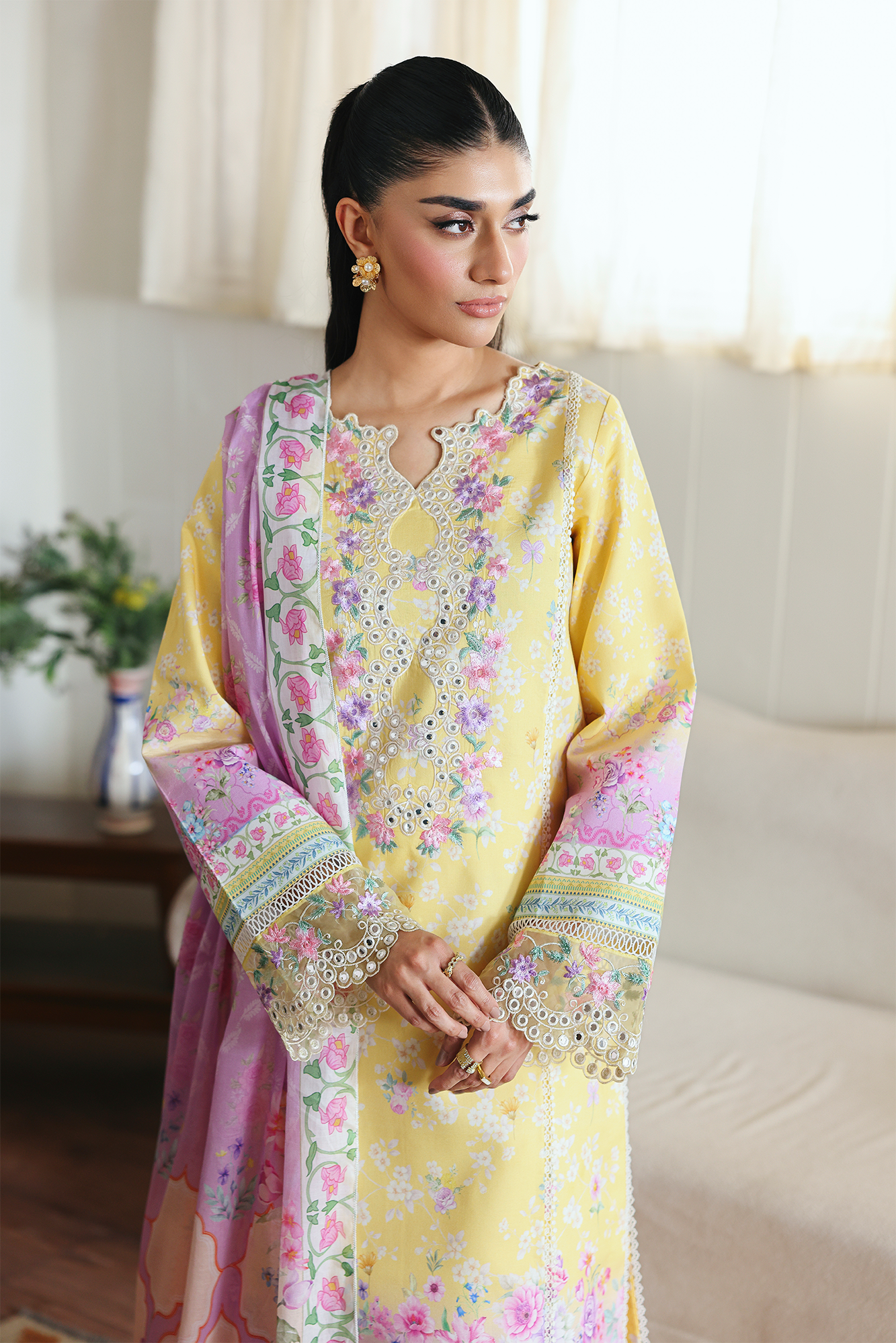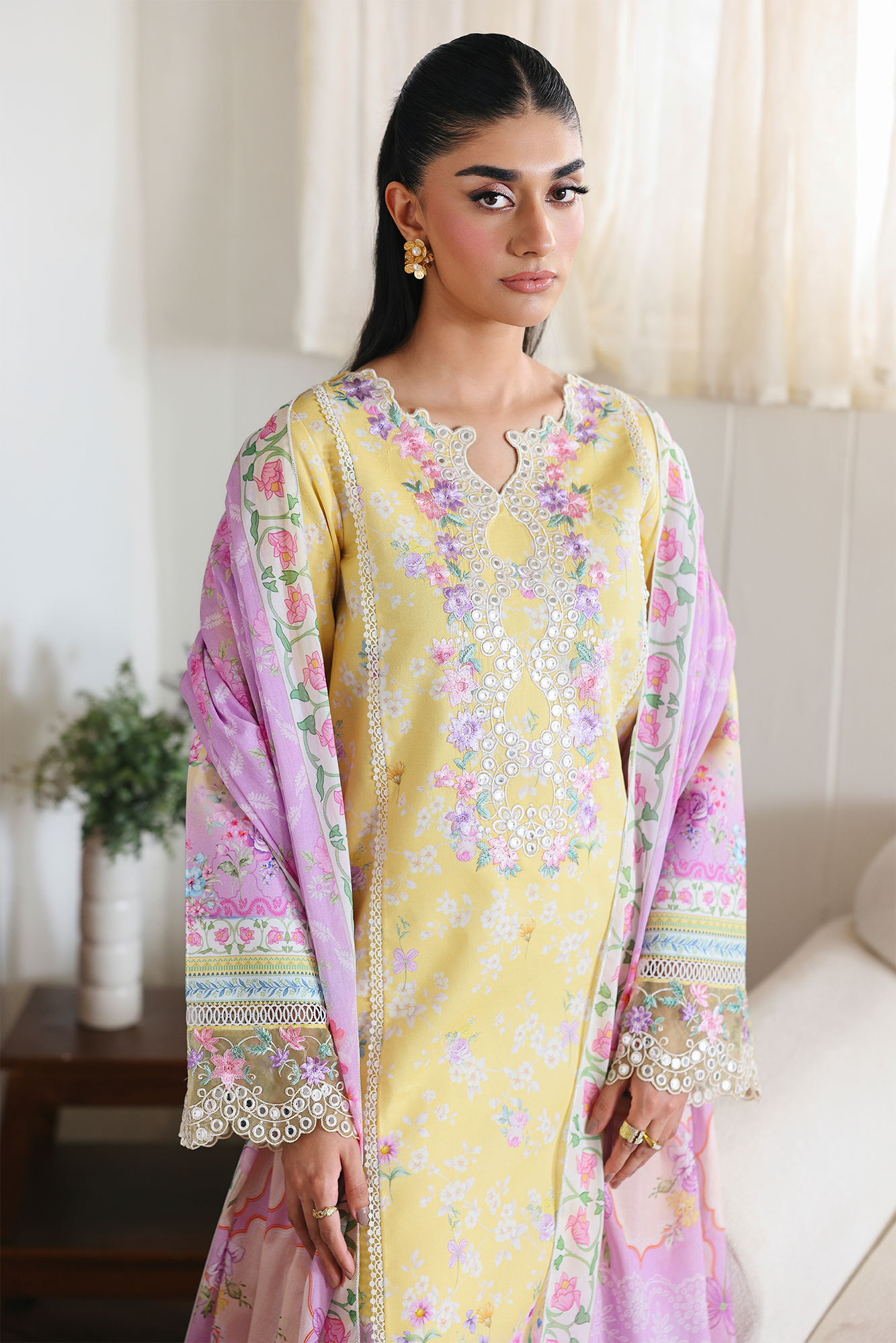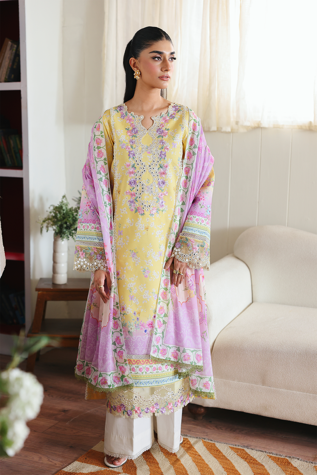 Fabric: Embroidered & Printed Lawn Front Digital Printed Lawn Sleeves & Back Embroidered Border for sleeves Embroidered Hem Border Dyed cotton Trouser Digital Printed Primium Voil Dupatta |