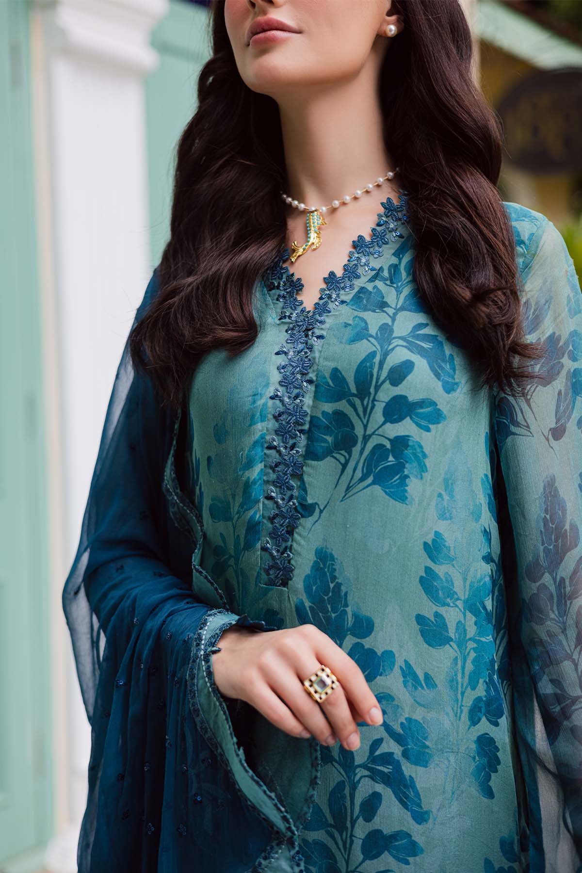 Summary: Embrace timeless elegance with this stunning teal Pakistani suit from the Nureh Ballerina Luxury Formals collection. This exquisite ethnic wear features a beautifully printed and embroidered chiffon shirt, offering a graceful and airy silhouette perfect for the Spring/Summer season. The kameez is adorned with a sophisticated floral print in a deeper shade of blue, complemented by intricate embroidery along the V-neckline and cuffs. As a premium Pakistani dress, its lightweight chiffon fabric ensures comfort without compromising on style, making it an exceptional choice for festive clothing. Ideal for formal wear, this outfit is perfect for wedding guests, Eid celebrations, or any upscale party.