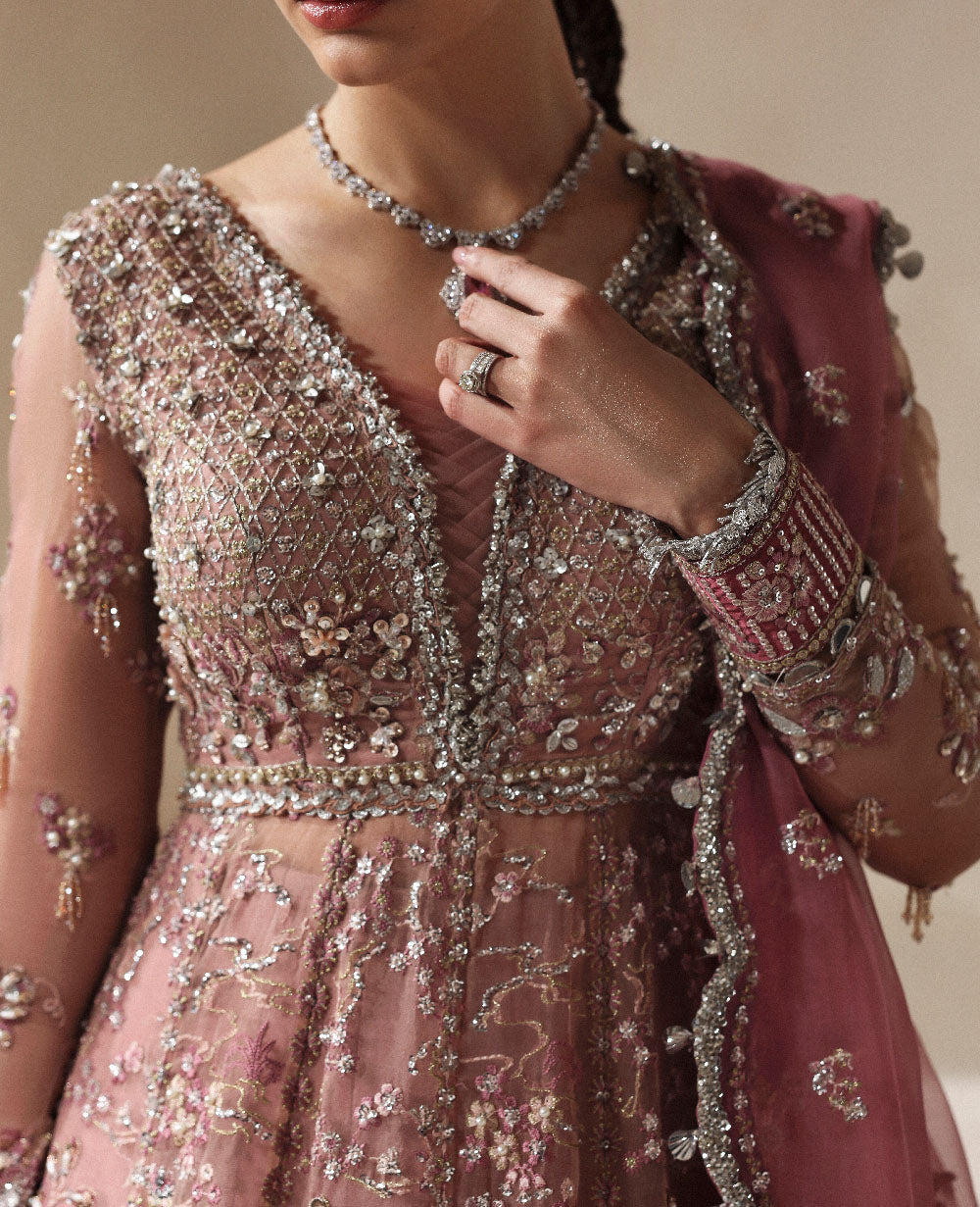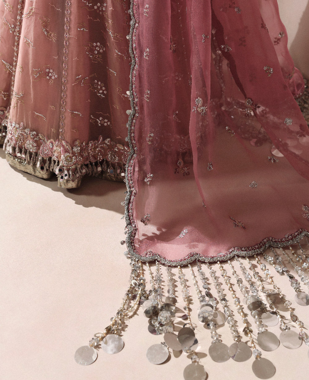 Fabric: In dreamy dusty peach, this organza paneled pishwas captures the essence of feminine grace. The bodice shimmers with an intricate silver sequin jaal, while cascading panels bloom with delicate floral embroidery framed in soft pink satin for a whisper of refinement. Paired with an ethereal pink organza dupatta, the ensemble exudes quiet grandeur, a perfect harmony of charm and sophistication, designed to leave a graceful impression wherever you go. Front Bodice Left+Right Embellished (Organza) 1-PC Front Left Panels Embellished (Organza) 3-PC Front Right Panels Embellished (Organza) 3-PC Sleeves Embellished (Organza) 22"" Back Bodice Embroidered (Organza) 1-PC Back Left Panels Embroidered (Organza) 3-PC Back Right Panels Embroidered (Organza) 3-PC Sleeves Border Embroidered (satin) 1-PC Dupatta Embroidered (Organza) 1-PC Dupatta Pallu Border Embroidered (Organza) 2-MTR Slip (Raw Silk) 1.5 MTR Trousers (Raw Silk) 4.5-MTR  |