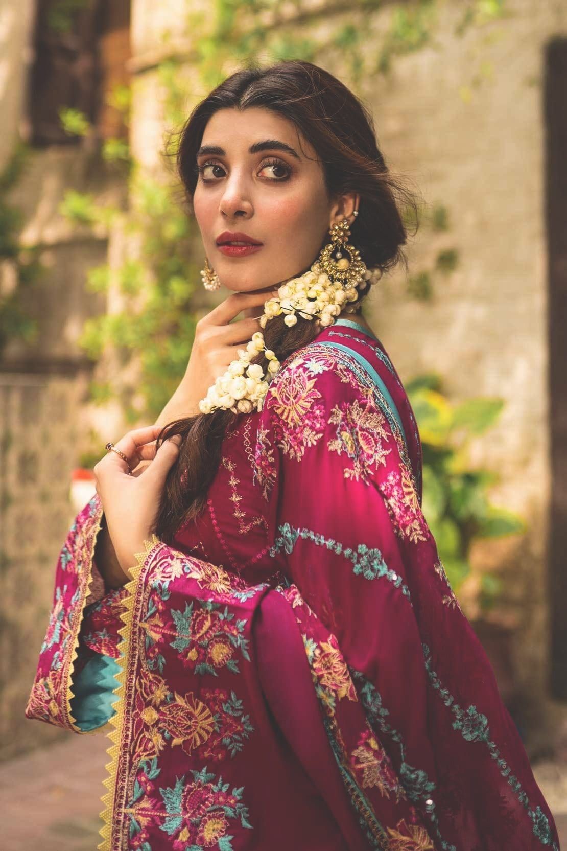 Fabric: Shirt Front Embroidered on Karandi 1.10 yards Shirt Back Embroidered on Karandi 1.10 yards Shirt Sleeves Embroidered on Karandi 0.70 yards Shirt Front Emroidered Border on Karandi 30" 01 piece Shirt Front Emroidered Border on Karandi 30" 01 piece Embroidered Bamber Chiffon Dupatta 2.65 yards Dyed Karandi Trouser 2.65 yards |