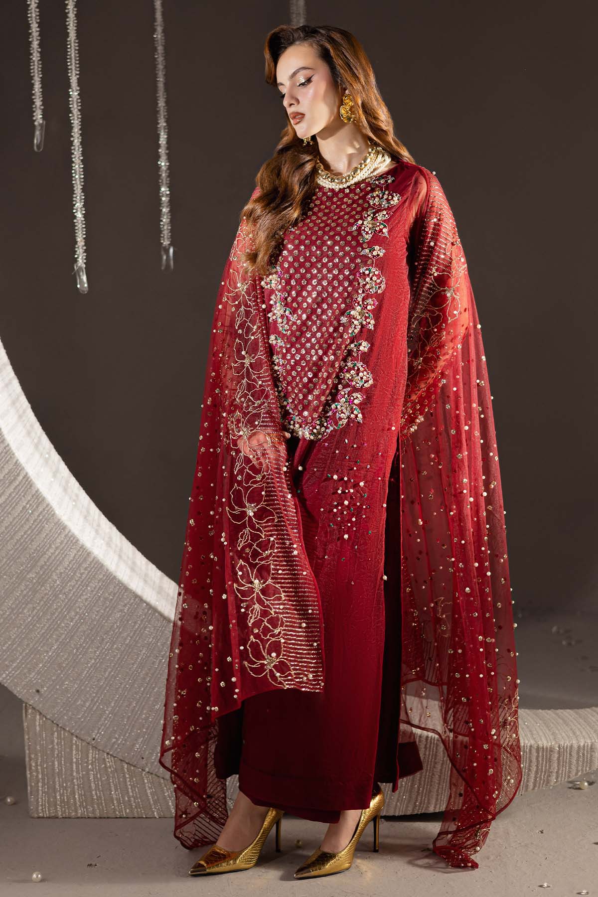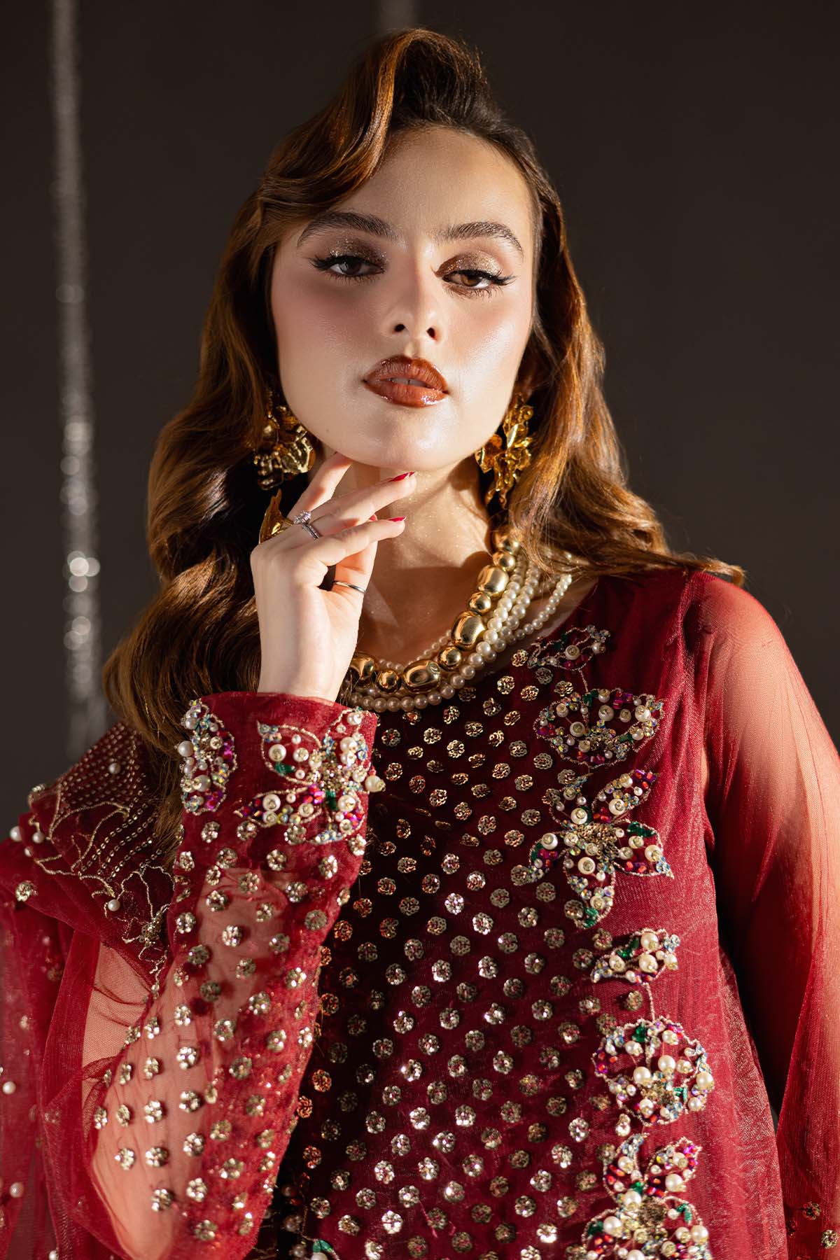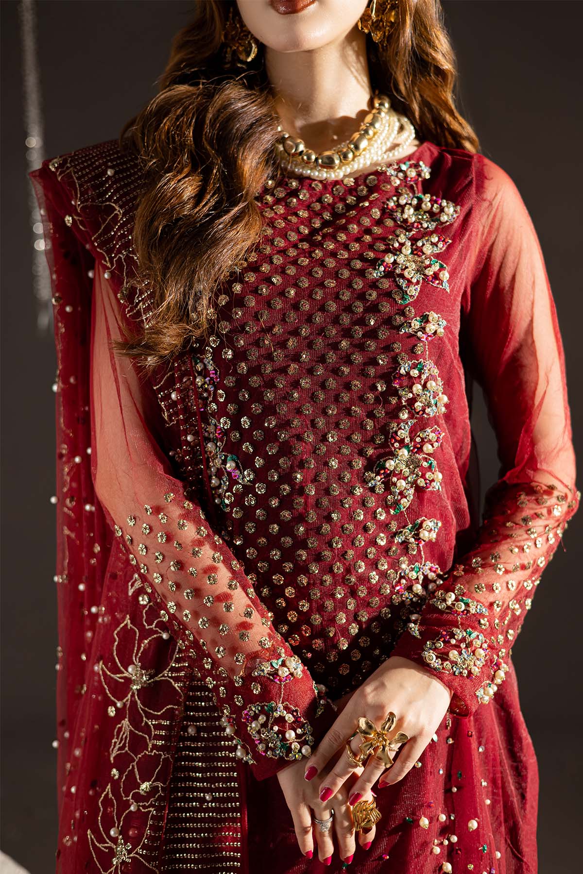 Summary: Embrace regal elegance with this stunning maroon Pakistani suit from Nureh's formal collection. The long shirt is crafted from delicate net, a perfect choice for Spring/Summer events, offering both grace and comfort. The kameez features intricate hand embellishments across the bodice and sleeves, creating a dazzling display. The deep maroon hue is traditionally associated with Pakistani wedding wear, making this formal dress an exceptional choice for a wedding guest, a Barat ceremony, or any grand festive occasion. As a piece of classic ethnic wear, this outfit is designed to make a statement, making it the ideal choice when you want to buy a luxurious Pakistani dress online for your next celebration.