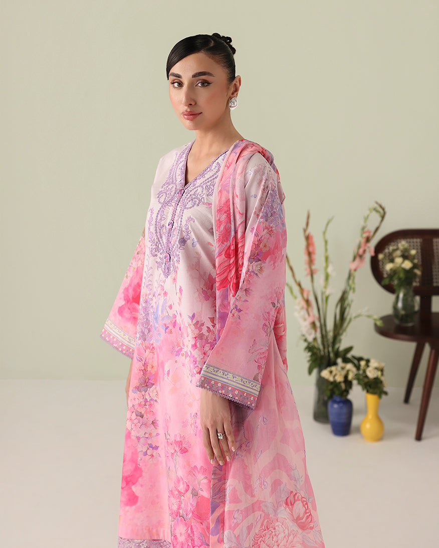 Summary: Discover the delicate charm of the Roheenaz Rosette 'Petal Whispers' Pakistani Lawn Suit. This unstitched ensemble is a masterpiece of summer fashion. The kameez, in a soft and inviting shade of pink, is crafted from high-quality lawn fabric, ensuring breathability and comfort during the warmer months. It showcases an exquisite floral print, reminiscent of a blooming garden. A standout feature is the intricately embroidered neckline on organza, adding a touch of formal elegance to the otherwise breezy design. This beautiful Pakistani dress is perfect for daily wear, festive gatherings, or an elegant Eid outfit.