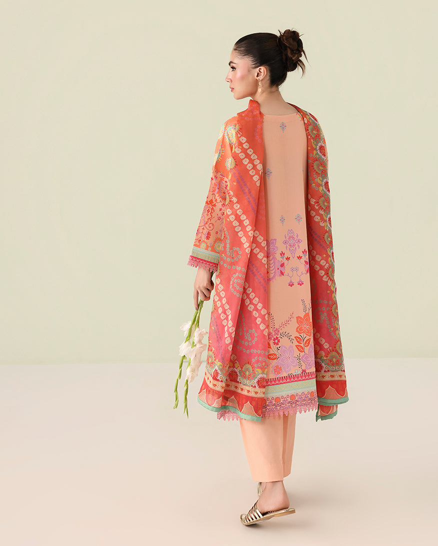 Summary: Step into summer with the Roheenaz 'Warm Horizon' Pakistani Lawn Suit. Cast in a stunning peach shade, this unstitched dress is crafted from high-quality, breathable lawn, making it perfect for the Spring/Summer season. The ensemble features a digitally printed lawn shirt, enhanced with an exquisitely embroidered organza neckline that adds a touch of sophistication. This elegant Pakistani dress is a versatile addition to your ethnic wear collection, seamlessly blending traditional prints with modern grace. It is an ideal choice for daytime events, Eid gatherings, or as chic party wear.