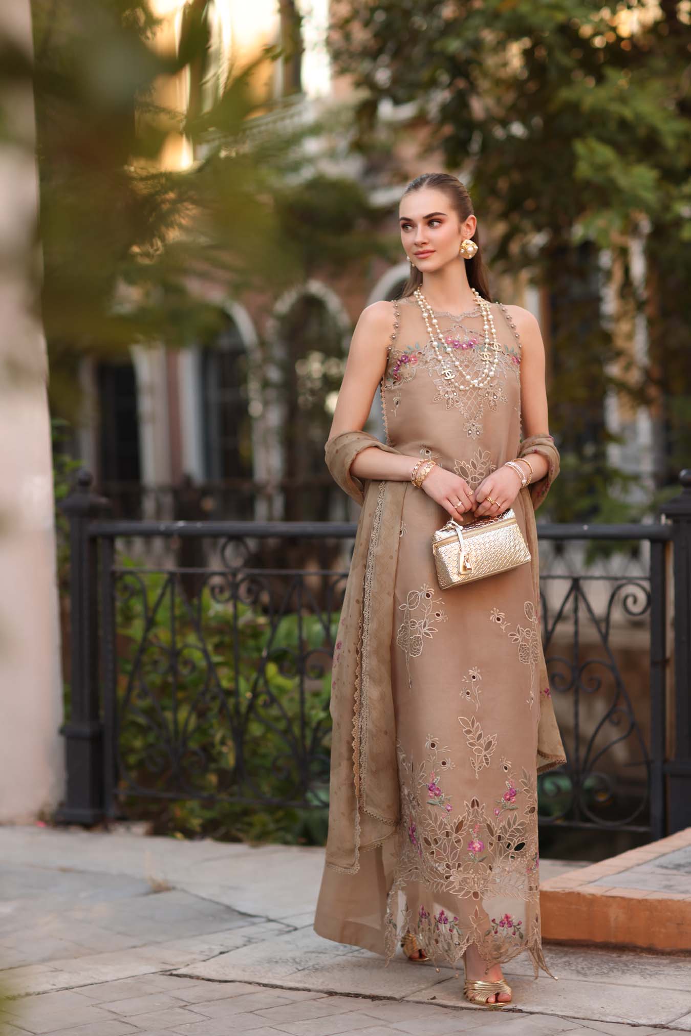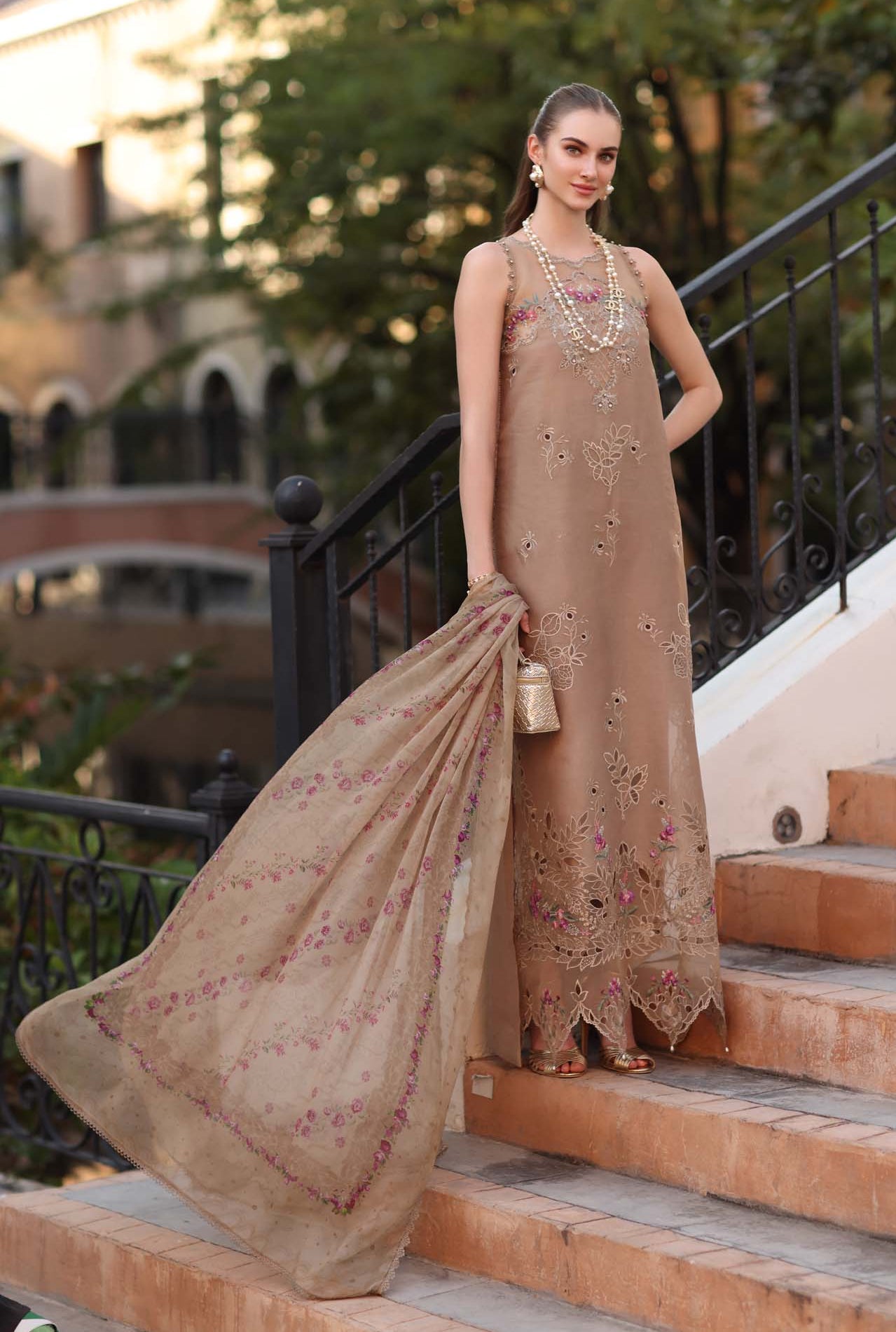 Summary: Embrace elegance with this exquisite beige Pakistani lawn suit, perfectly crafted for your summer festive wardrobe. The breathable lawn kameez is beautifully adorned with intricate schiffli embroidery across the front, offering a luxurious texture. Its showstopper is the heavily embroidered hemline, featuring a refined scalloped cutwork border that exudes sophistication. Paired with a light, digitally printed chiffon dupatta, this Pakistani summer dress ensures you stay cool during warm-weather celebrations. Ideal for Eid gatherings, daytime formal events, or chic parties, this stunning ethnic outfit promises a graceful look. Shop online to elevate your seasonal style today!