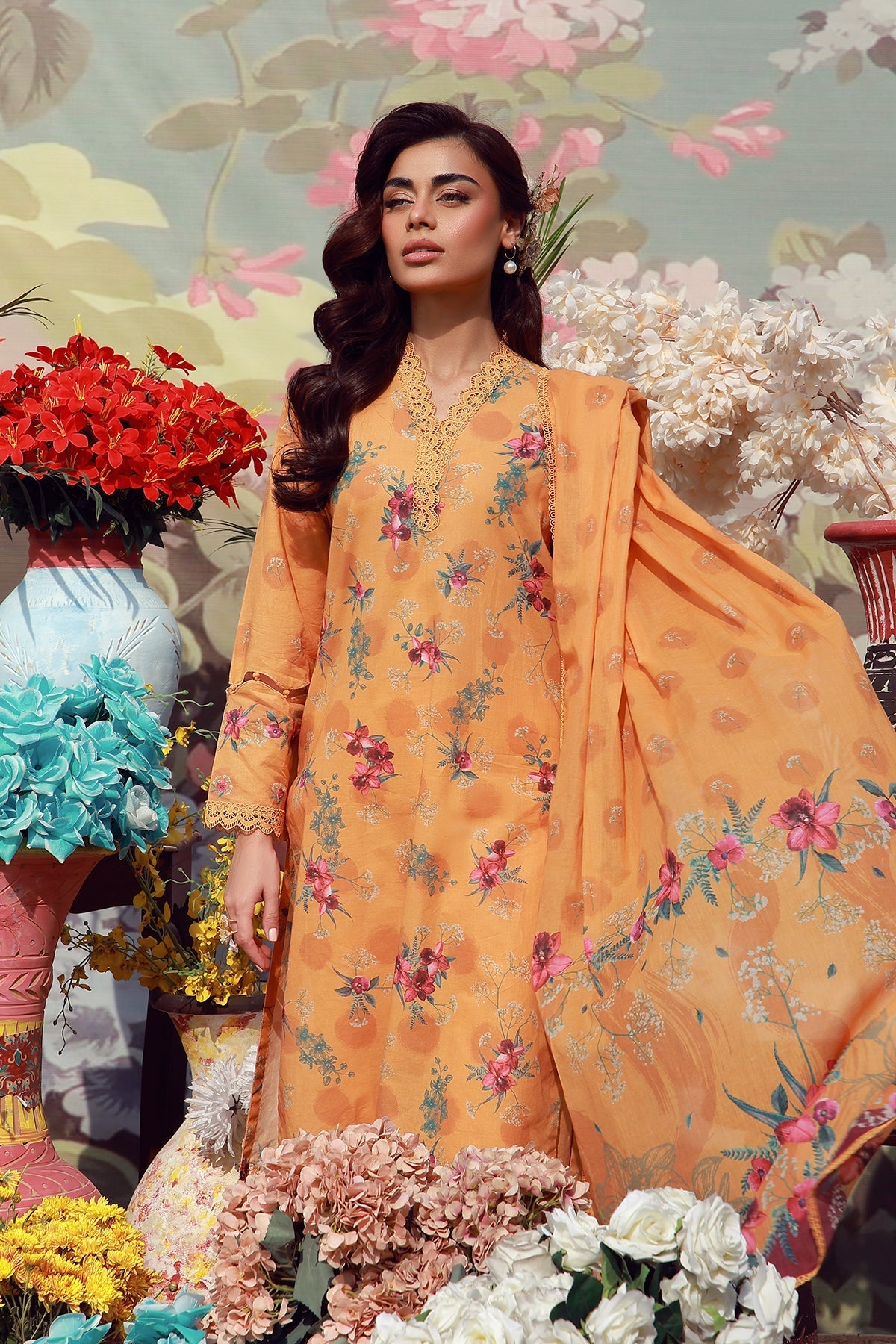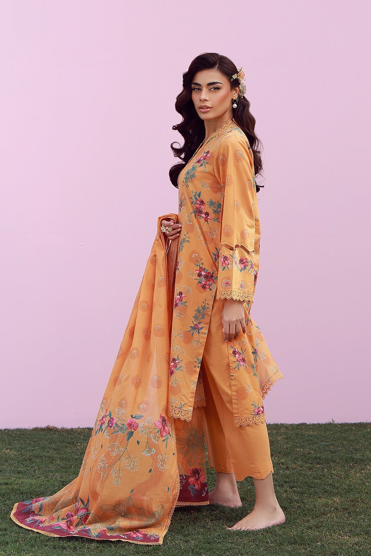 Summary: Embrace the warmth of the season with the Sahar Mirha "Marigold Mist," a captivating **Orange Pakistani Lawn Suit** that embodies summer radiance. Crafted from premium, breathable **Lawn** fabric, this unstitched kameez features a soft marigold base illuminated by dainty floral digital prints in shades of pink and green, creating a gentle yet vibrant aesthetic. Ideally suited for **Spring/Summer**, the lightweight texture ensures cool comfort, making it a quintessential choice for **Daily Wear** and casual daytime gatherings. This ensemble represents the finest in **Pakistani ethnic wear**, blending traditional modesty with contemporary floral artistry. The sunny orange tones offer a refreshing vibe, perfect for brightening up your workwear rotation or adding a splash of color to a weekend brunch. As a versatile **Pakistani dress**, it allows for customized tailoring to suit your personal style. Shop this exquisite floral lawn outfit online to experience the perfect fusion of elegance and summer practicality.