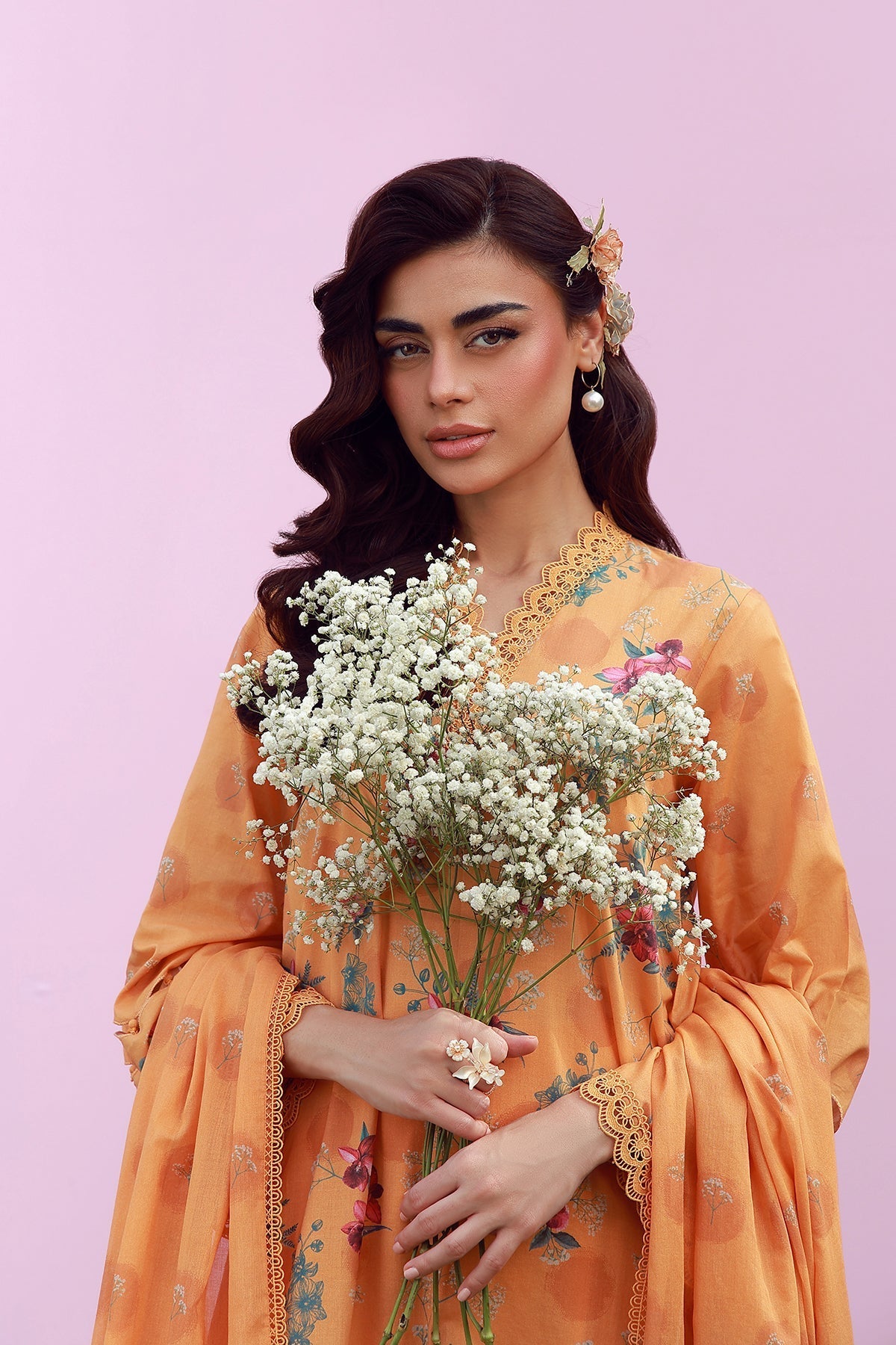 Soft marigold hues adorned with dainty florals for a gentle, radiant look. The coordinated dupatta completes the story, paired with tonal pants. Warm, feminine, and timelessly appealing.