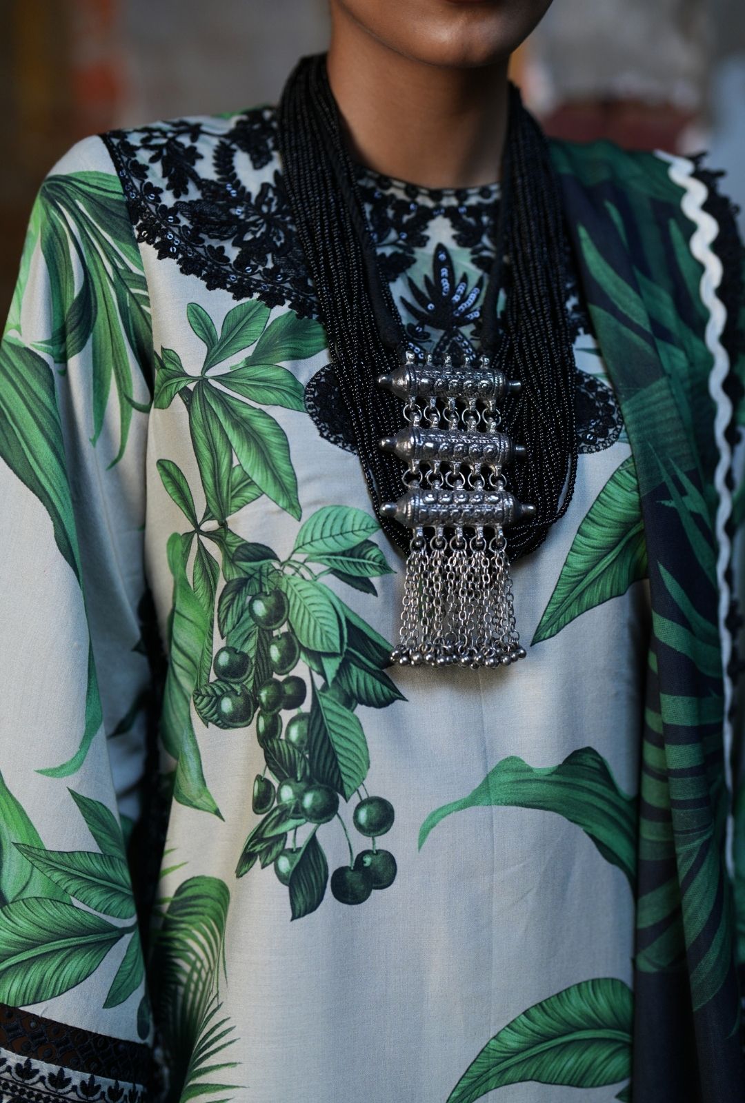 Summary: Embrace winter elegance with 'Gulbahar' from AJR Couture's Sard Sham Winter collection. This stunning Pakistani suit features a sophisticated off-white linen shirt, brought to life with a lush green digital botanical print. The breathable yet warm linen fabric makes this an ideal Fall/Winter outfit. The design is elevated with an intricately embroidered organza neckline and delicate sleeve borders, adding a touch of formal grace. Paired with a cozy woolen shawl, this ethnic wear ensemble is a perfect blend of comfort and high fashion, making it a stellar choice for formal dinners or sophisticated winter parties.