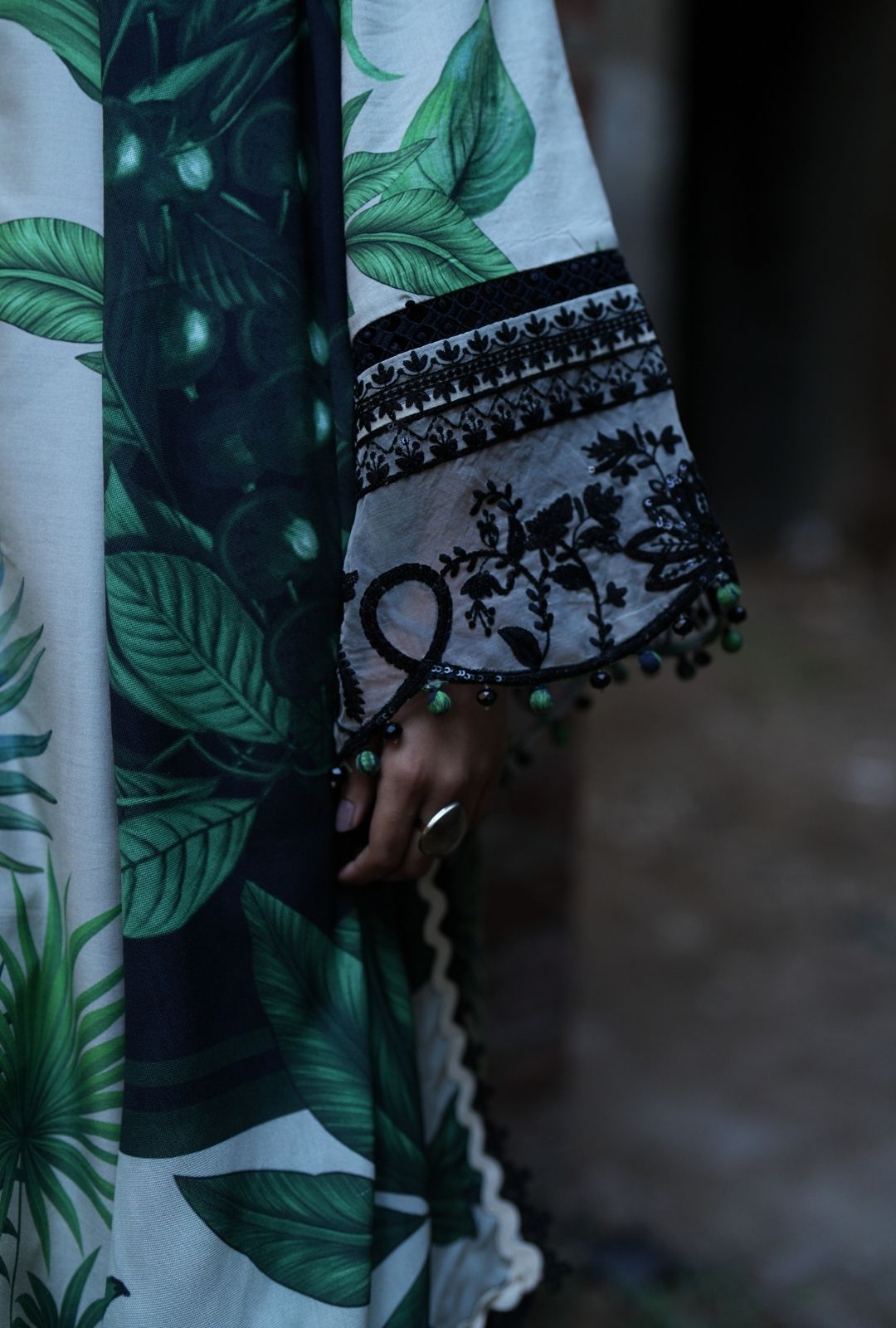 Fabric: A digitally printed linen shirt paired with a coordinated printed linen trouser, creating a symphony of comfort and sophistication. The look is elevated with an embroidered organza neckline, flowing into delicately embroidered shirt finishings and organza sleeve borders — every stitch whispering grace. Wrapped in a woolen printed shawl, Gulbahar blooms with timeless charm and winter warmth. Digital printed linen shirt Digital printed linen trouser Woolen printed shawl Embroidered organza neckline Embroidered organza shirt finishing patti Embroidered organza sleeves border |