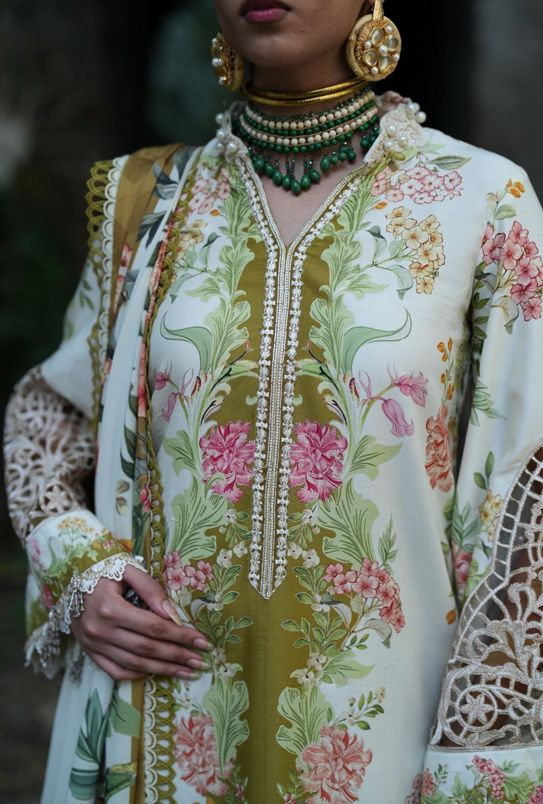 Fabric: A digitally printed shirt paired with a matching printed trouser, designed to capture effortless sophistication in every thread. The look is elevated with an embroidered organza neckline patti, delicate sleeves border, and an intricately embroidered daman border — a true celebration of detail and artistry. Wrapped in a woolen printed shawl, Gulrukh blooms with elegance, warmth, and timeless allure. Digital printed linen shirt Digital printed linen trouser Woolen printed shawl Embroidered organza neckline patti 1 Embroidered organza neckline patti 2 Embroidered organza daman border Embroidered organza sleeves motives |