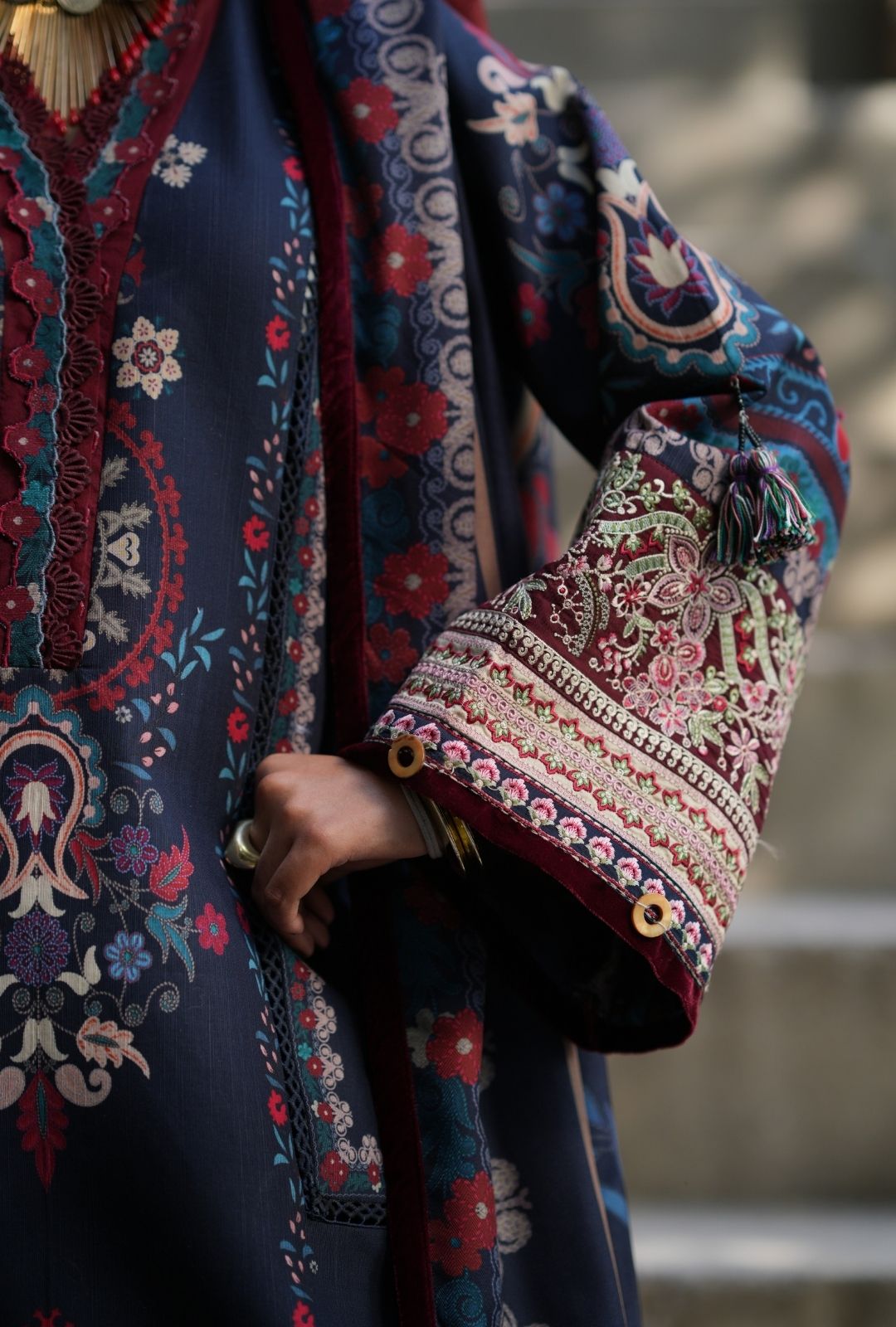 Fabric: A digitally printed khaddar shirt paired with a matching printed khaddar trouser, brought to life in soft textures and timeless hues. The artistry unfolds through embroidered silk sleeve borders — 1, 2, and 3 — each telling its own story of craftsmanship and detail. An embroidered silk daman border adds the final touch of sophistication, while the herringbone printed shawl drapes the look in effortless elegance. Nilofer — where tradition meets refined modernity. Digital printed khaddar shirt Digital printed khaddar trouser Herringbone printed shawl Embroidered silk sleeves border 1 Embroidered silk sleeves border 2 Embroidered silk sleeves border 3 Embroidered silk shirt daman border |