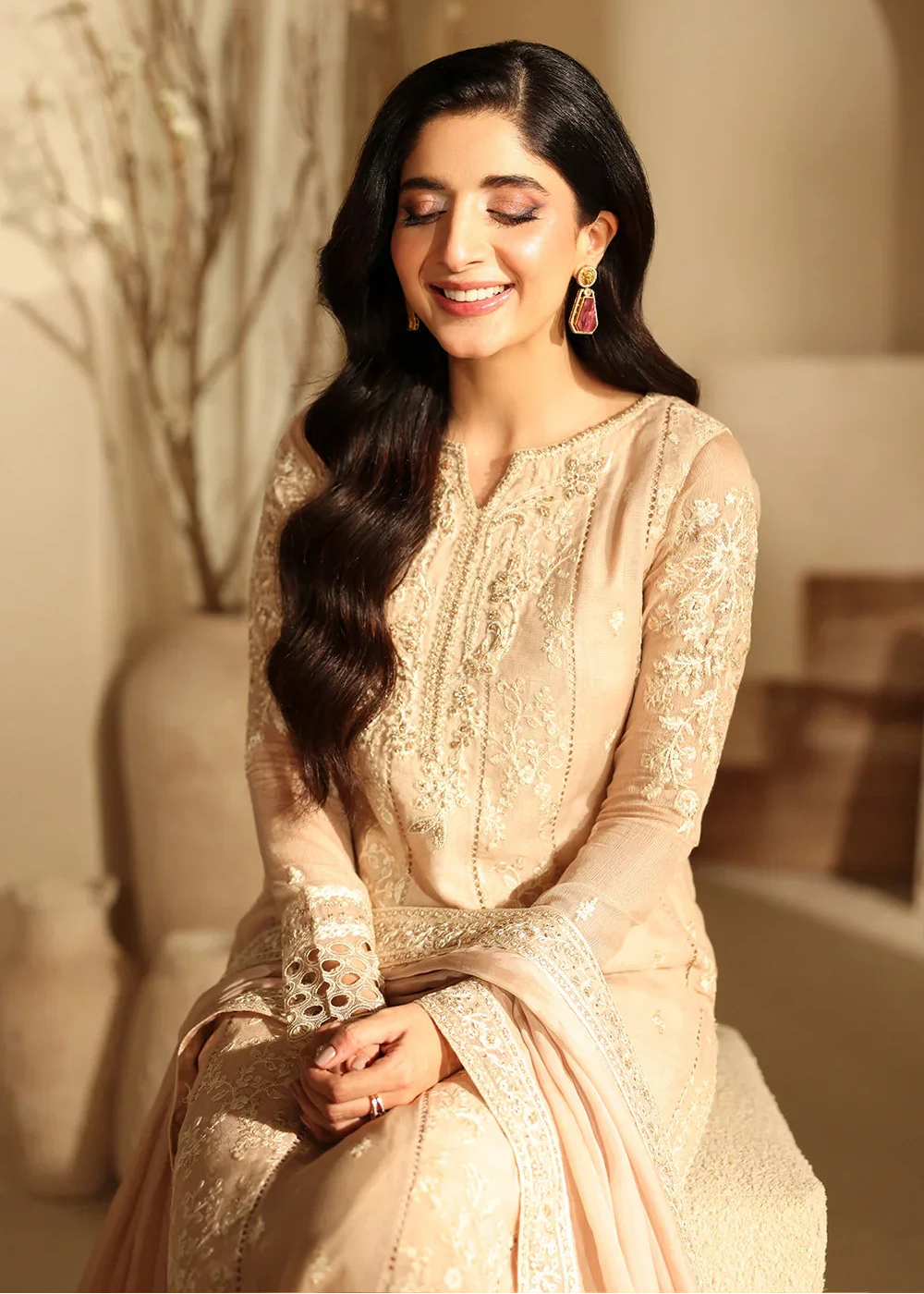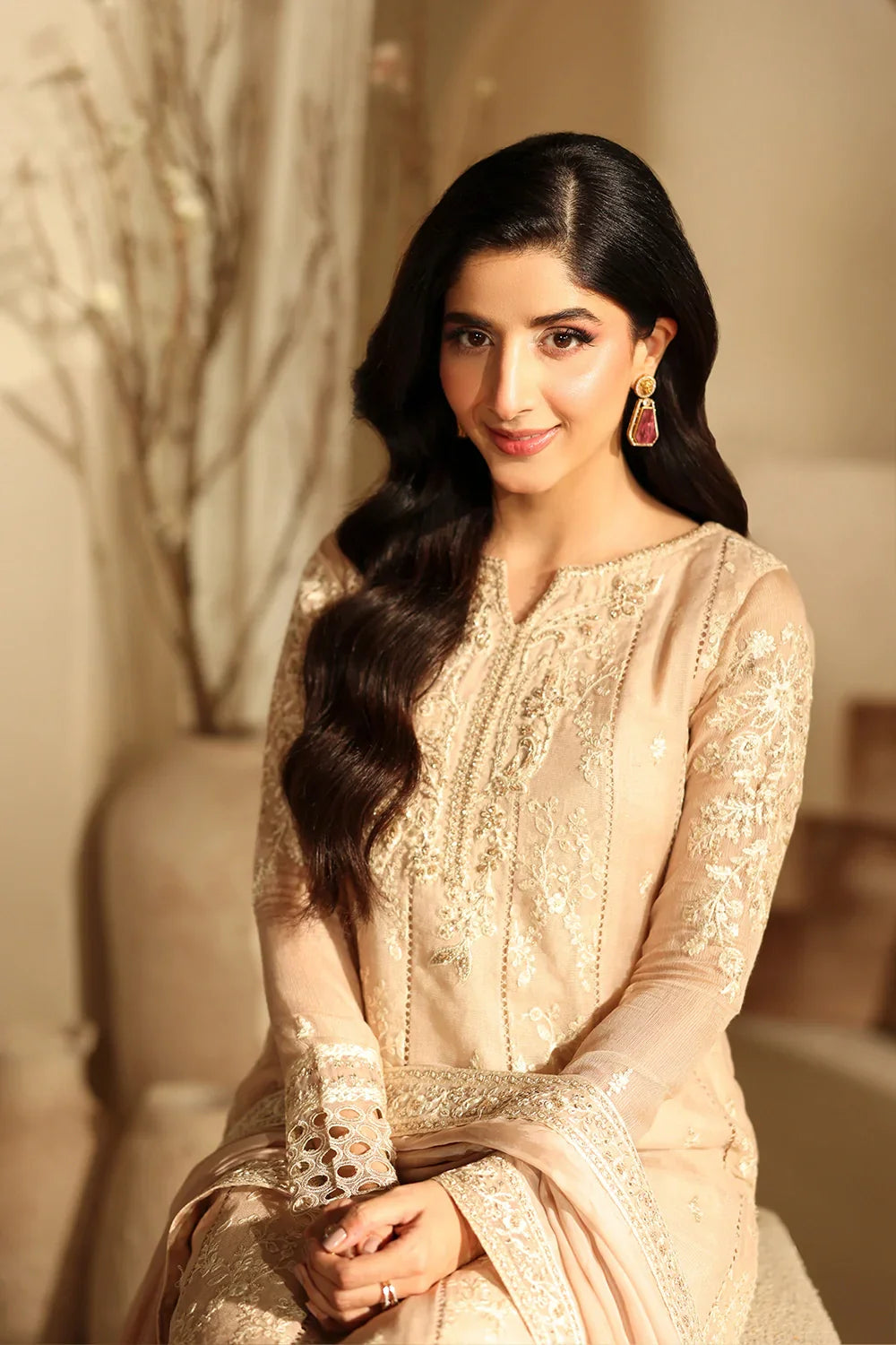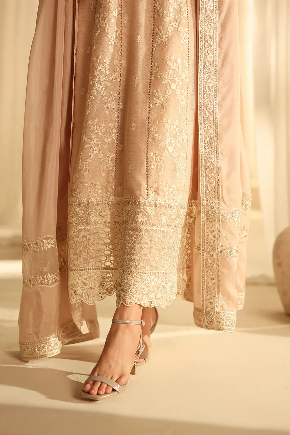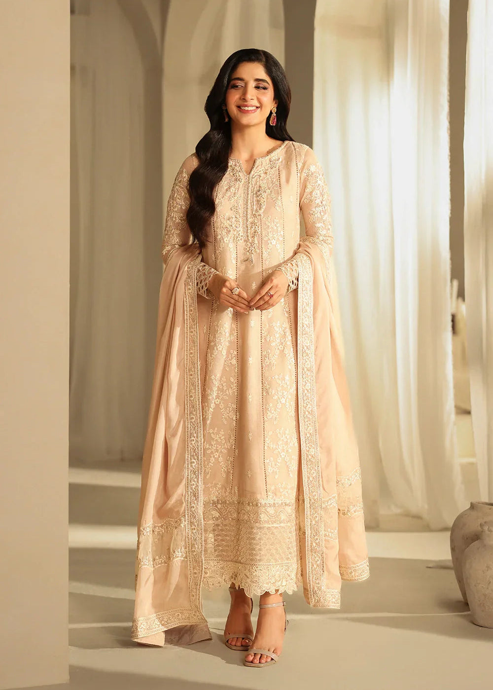 Summary: Embrace timeless elegance with this stunning beige Pakistani Suit from the 'Azure Luxe Festive Formals' collection. Crafted from delicate Khaddi Net, this ethnic wear is perfect for the Spring/Summer season. The long kameez features exquisite all-over sequin embroidery and a meticulously hand-embellished organza front patch, creating a look of sheer sophistication. Multiple layered organza borders on the daman add a graceful flair. This festive clothing, in its serene beige shade, is an impeccable choice for weddings, Eid celebrations, or formal gatherings, ensuring you radiate polished grace. A perfect addition to your formal wear wardrobe.