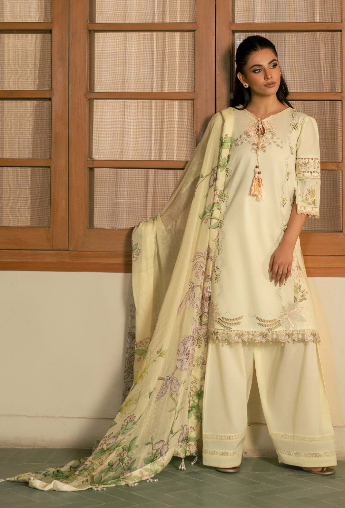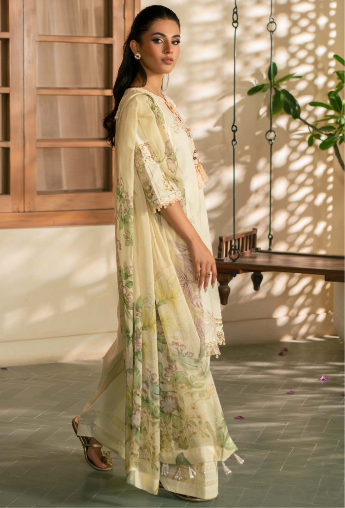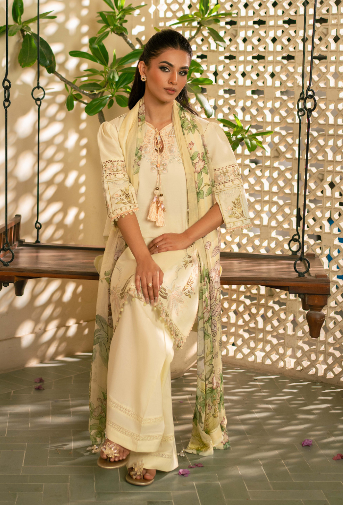 Summary: Radiate elegance this season with this stunning Yellow Pakistani Lawn Suit from the Humdum Mehrmaa collection. This unstitched ensemble features a finely embroidered lawn shirt showcasing intricate floral artistry, perfectly blending traditional craftsmanship with modern aesthetics. The look is complemented by a printed slub chiffon dupatta that drapes beautifully, offering breathable comfort ideal for the Spring/Summer heat. Paired with plain dyed cotton trousers, this luxury outfit is a versatile choice for Eid celebrations, daytime parties, or a stylish Haldi ceremony. Experience the charm of authentic Pakistani fashion with this sophisticated dress. Shop online today to add this timeless piece to your festive wardrobe.