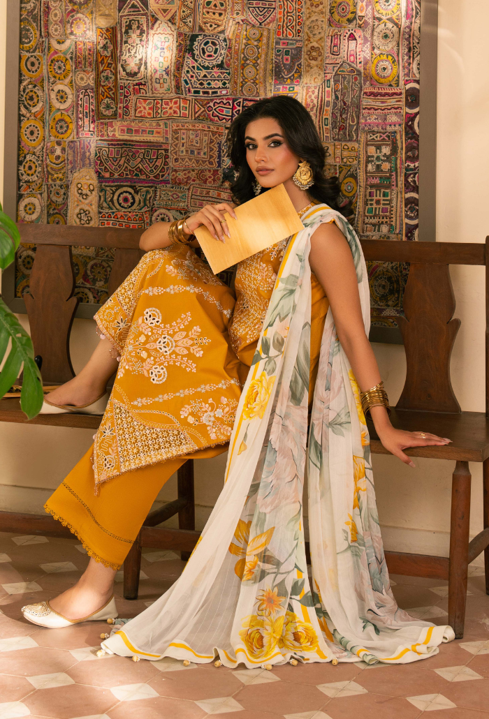 Summary: Embrace the warmth of the season with the Humdum Mehrmaa Lawn D03 Hoor, an exquisite unstitched Pakistani suit. The ensemble features a radiant Mustard embroidered Lawn shirt, adorned with delicate white threadwork and cutwork details on the hem, perfectly capturing the essence of summer elegance. A soft, floral printed Chiffon dupatta complements the vibrant kameez with fresh botanical motifs, making it an ideal choice for a Haldi ceremony or festive Eid celebration. Designed for breathability and style, this Pakistani dress offers a sophisticated look for sunny days. Upgrade your wardrobe with this timeless ethnic festive wear. Shop online for casual elegance.
