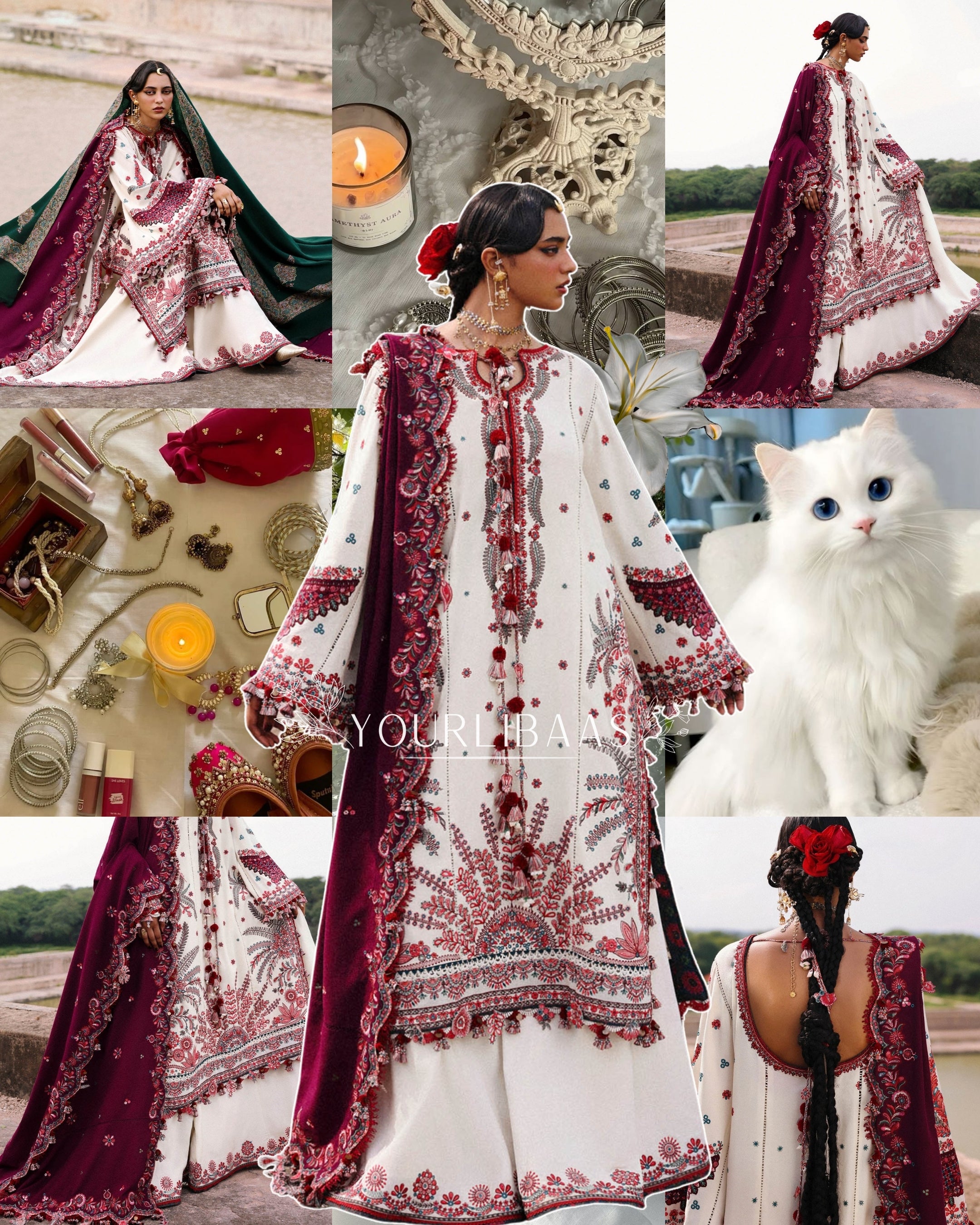 Summary: Experience timeless elegance with the Hussain Rehar 'Afsaneh' winter suit. This formal wear masterpiece is crafted in a sophisticated off-white hue from luxurious karandi fabric, ideal for the colder season. The shirt is a canvas of intricate, delicate embroidery and exquisite borring details, presenting a look of refined grace. As a classic Pakistani suit, its warm fabric and detailed craftsmanship make it a perfect choice for weddings, festive gatherings, and formal parties. This ethnic wear ensemble is designed for those who appreciate captivating style and traditional artistry in their winter wardrobe.