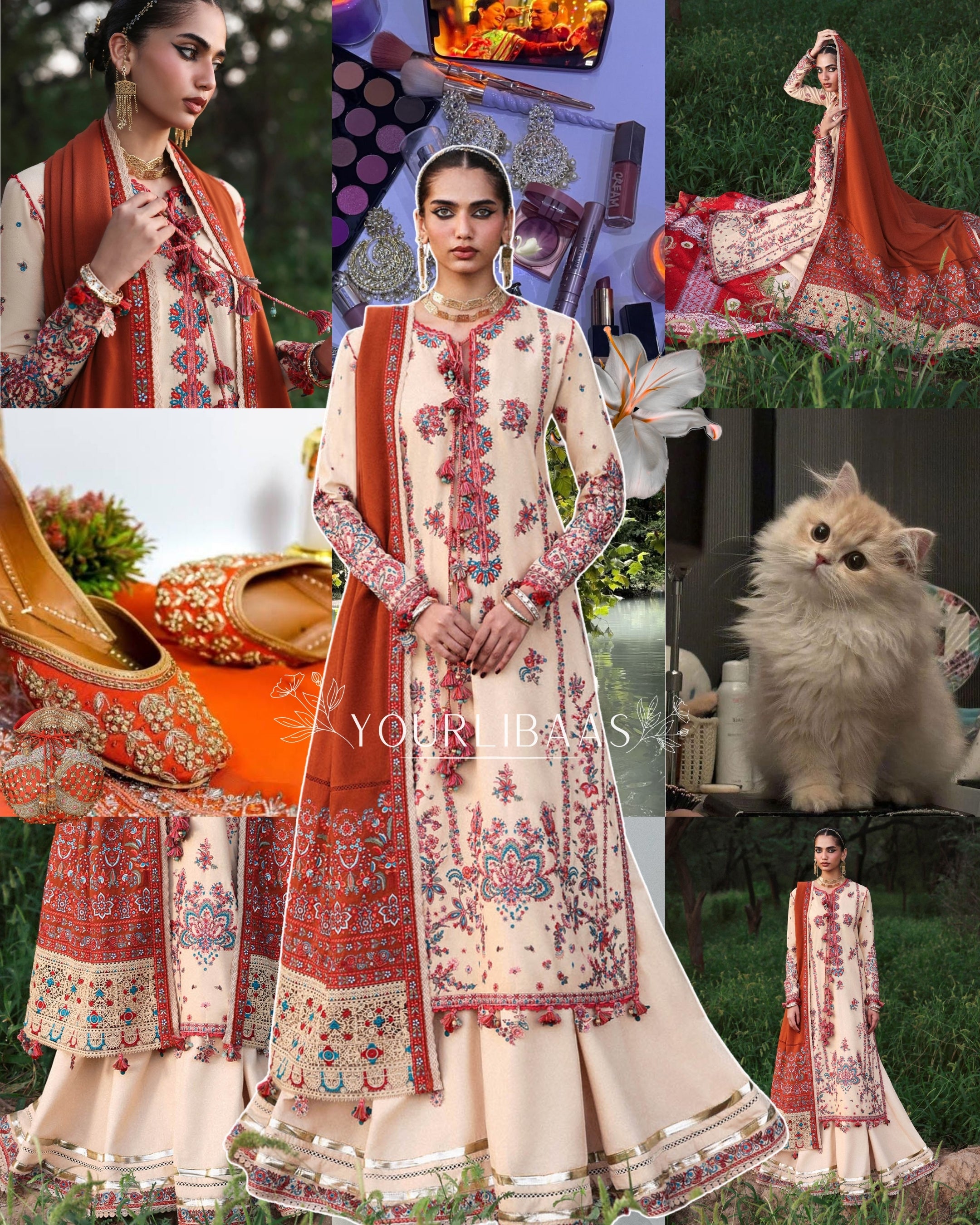 | Fabric: Colour: Beige Product Description: A vision of subtle sophistication, this unstitched beige ensemble redefines the classic karandi silhouette. The shirt is exquisitely rendered with intricate delicate embroidery and borring details. It achieves a striking counterpoint with the rust-colored embroidered karandi shawl, which features an elegant cut-work border in a complementary beige hue. The look is completed by a matching beige shalwar enhanced with tasteful embroidery accents, crafting an outfit designed to inspire effortless grace. Fabric Details:
