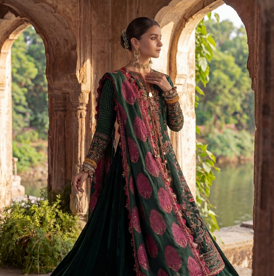 Summary: Discover the elegance of this Hussain Rehar Pakistani Suit in a deep, enchanting green. Crafted from premium Karandi fabric, this unstitched dress is perfect for the Fall/Winter season, offering both warmth and style. The kameez is a masterpiece of design, featuring intricate embroidery on the front panels, back, and sleeves, creating a sophisticated texture. This green ethnic wear is a stunning choice for formal events and wedding festivities, particularly as a Mehndi outfit. Shop this exquisite Pakistani dress online to command attention with effortless grace at your next celebration.