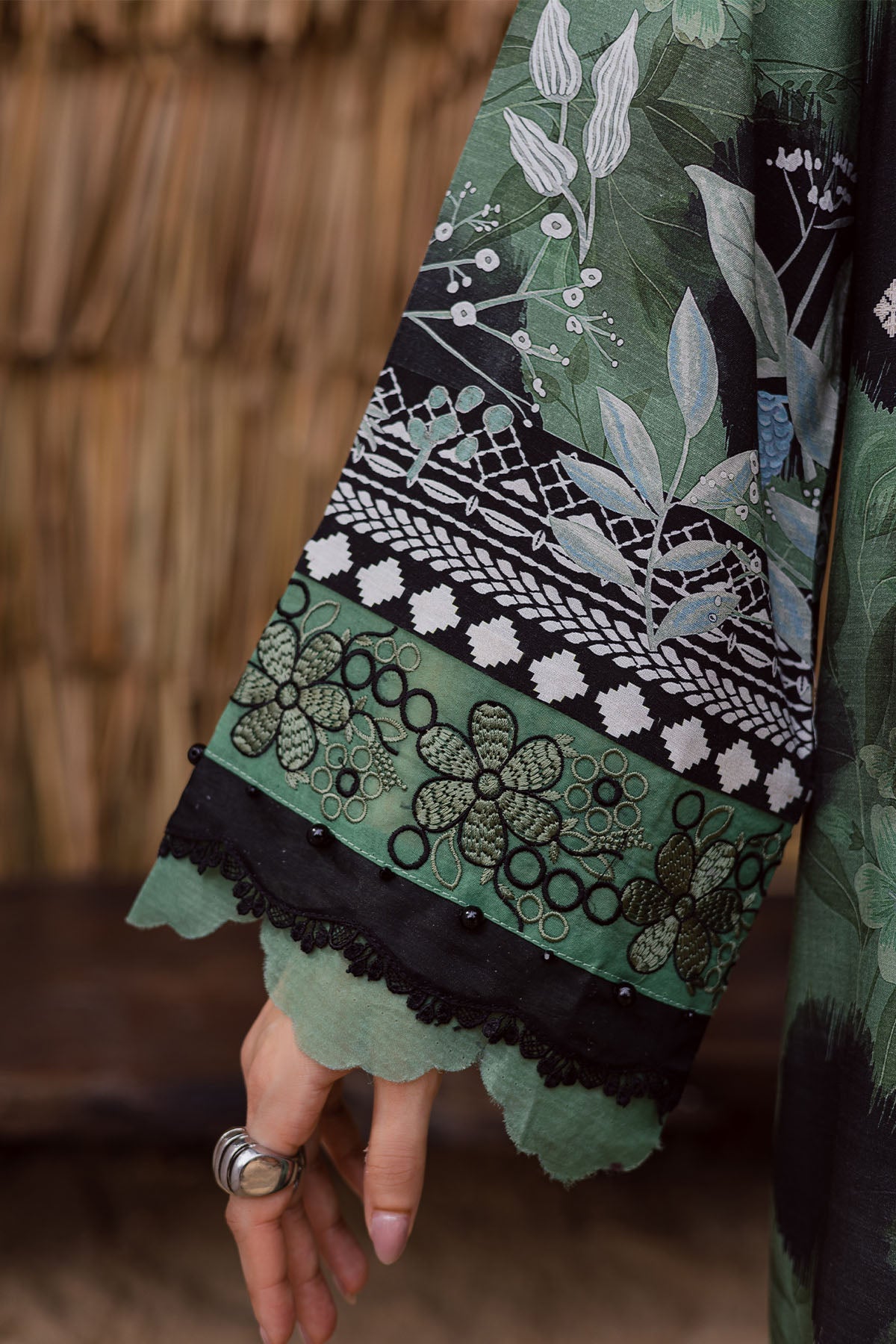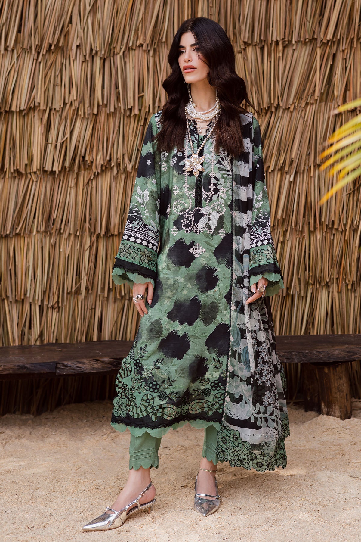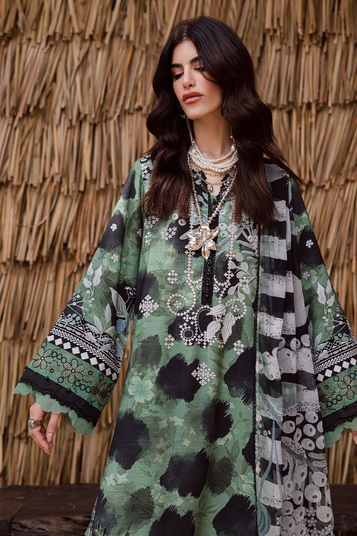 Summary: Embrace timeless elegance with the Nureh Gardenia Pakistani suit. This outfit features a sophisticated green kameez crafted from premium Viscose Slub Linen, an ideal fabric for the cooler Fall/Winter season. The shirt showcases a beautiful blend of contemporary prints and delicate embroidery around the neckline and hem, offering a graceful silhouette. As an unstitched Pakistani dress, it allows for bespoke tailoring. This versatile ethnic wear is perfect for formal gatherings and festive occasions, making it a standout addition to your wardrobe. Ideal for creating a chic, memorable look at any formal event.