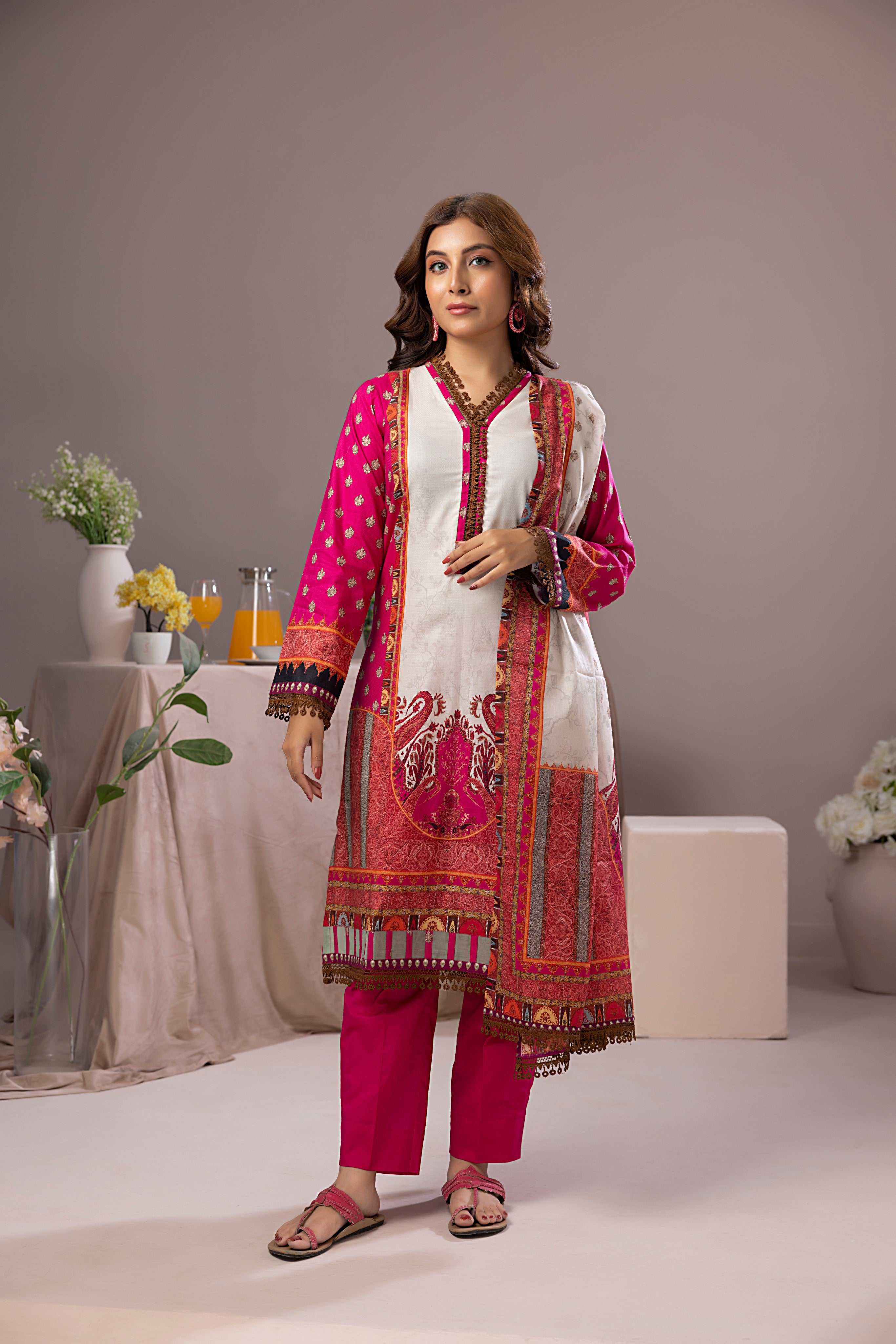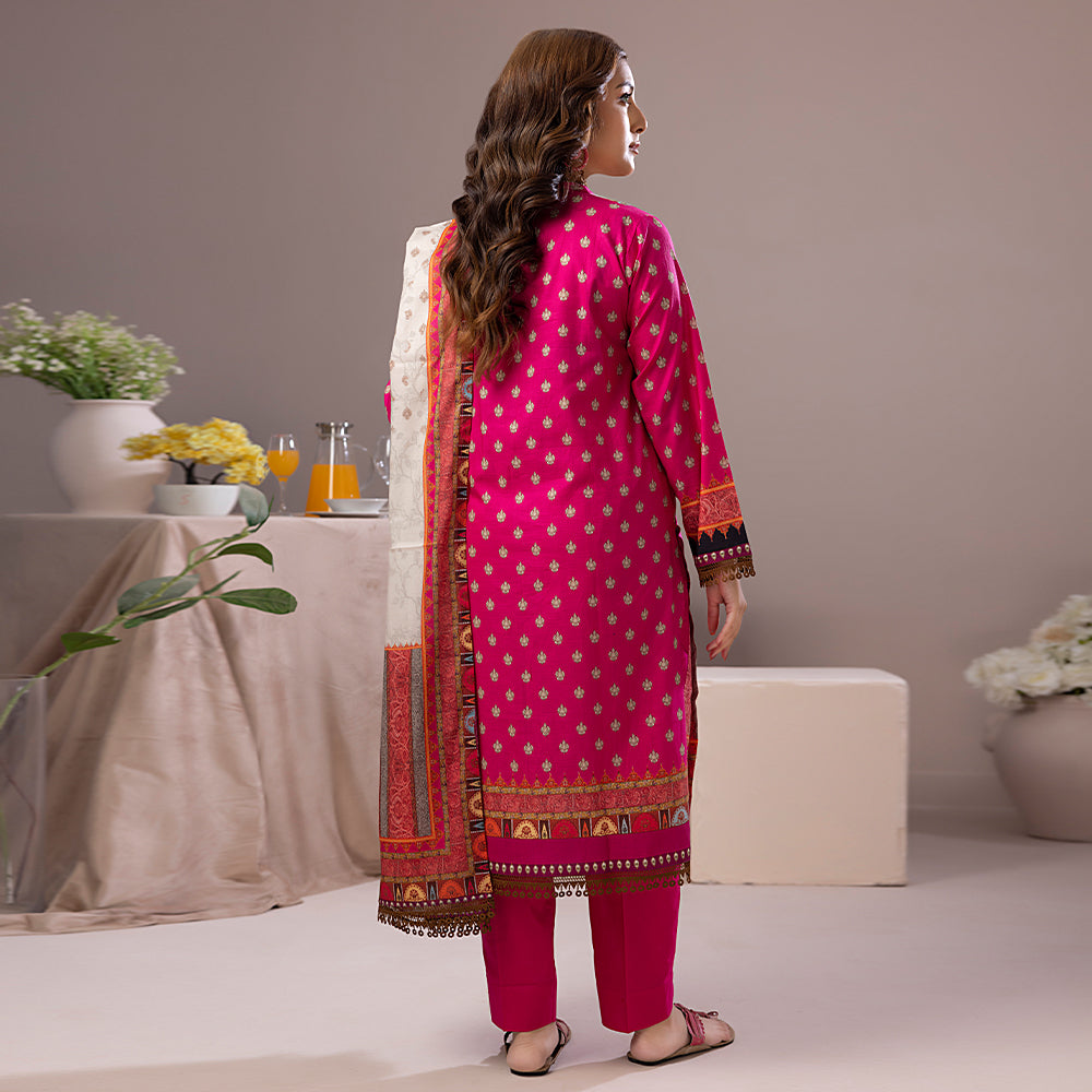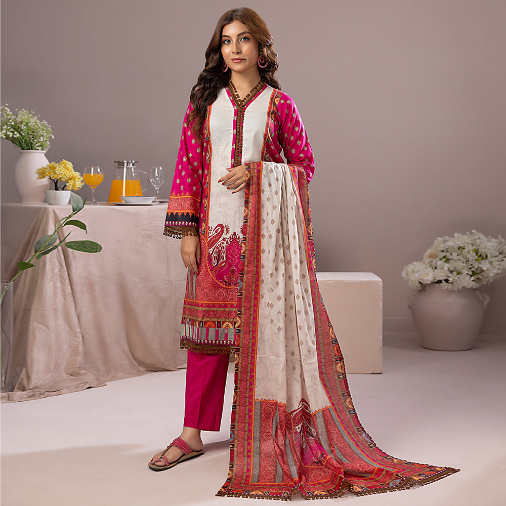 Summary: Introducing the Salina Dobby Lawn Vol-1 – SDOV1-4 by Regalia Textiles, a vibrant and comfortable Pakistani Lawn suit perfect for adding a touch of elegance to your everyday wardrobe. This unstitched three-piece suit features a predominantly pink printed lawn cotton top, complemented by dyed cotton bottoms and a coordinating printed lawn cotton dupatta. The top showcases a delicate all-over print in a cheerful pink hue, providing a refreshing and feminine aesthetic. The solid-colored cotton bottoms offer a comfortable contrast to the patterned top, while the lightweight printed lawn dupatta adds a touch of grace to the overall ensemble. This versatile suit is ideal for casual outings, daytime events, or simply relaxing at home. The breathable lawn cotton fabric ensures comfort throughout the day, making it a perfect choice for warm weather. This unstitched suit allows you to customize the fit and style according to your preferences. Get creative with different necklines, sleeve designs, and silhouettes to create a look that truly reflects your personal style. Pair it with traditional sandals or modern flats for a complete look. The Salina Dobby Lawn Vol-1 – SDOV1-4 is a must-have for those who appreciate comfortable elegance and timeless style in their daily wear. Be sure to add this exquisite piece to your spring/summer collection today. Embrace the perfect blend of comfort and style with this stunning Pakistani suit.