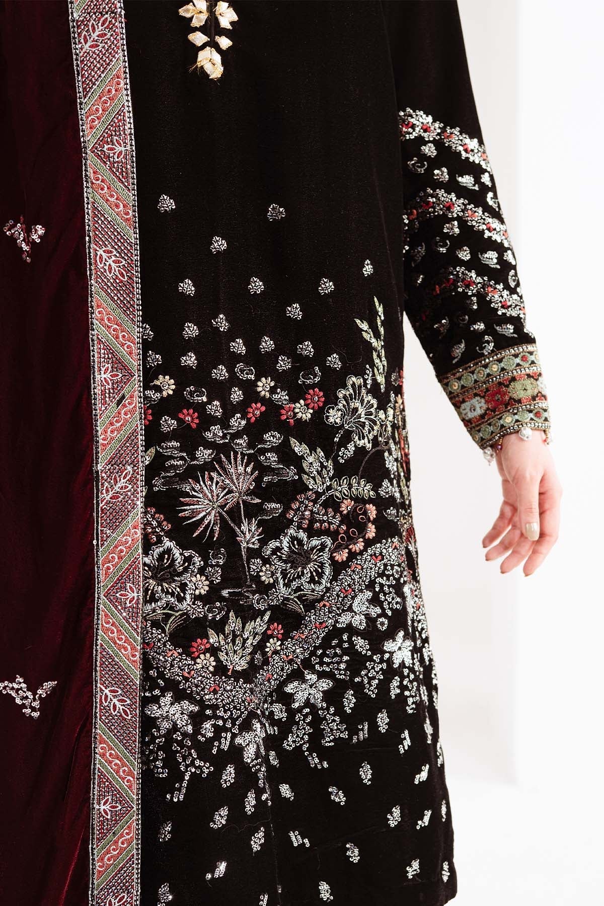 Summary: Embrace timeless elegance with this stunning black Pakistani suit from Nureh's Maya Fall/Winter collection. Crafted from plush, luxurious velvet, this unstitched dress material is designed for winter festivities. The kameez features an intricately embroidered front and sleeves, with a sophisticated embellished gota work neck patti that exudes regal charm. The deep black velvet provides a perfect canvas for the detailed craftsmanship, establishing this ethnic wear as a standout piece for formal events. Ideal for the colder months, this Pakistani velvet dress is a perfect choice for winter weddings, formal dinners, and glamorous evening parties, ensuring you look effortlessly chic.