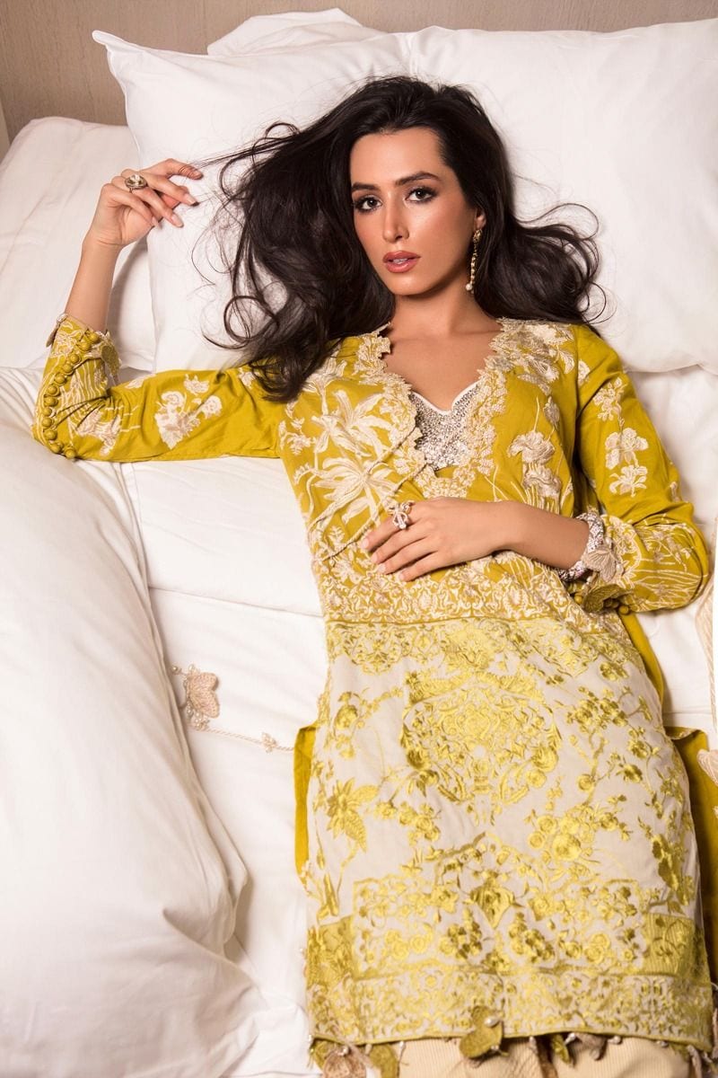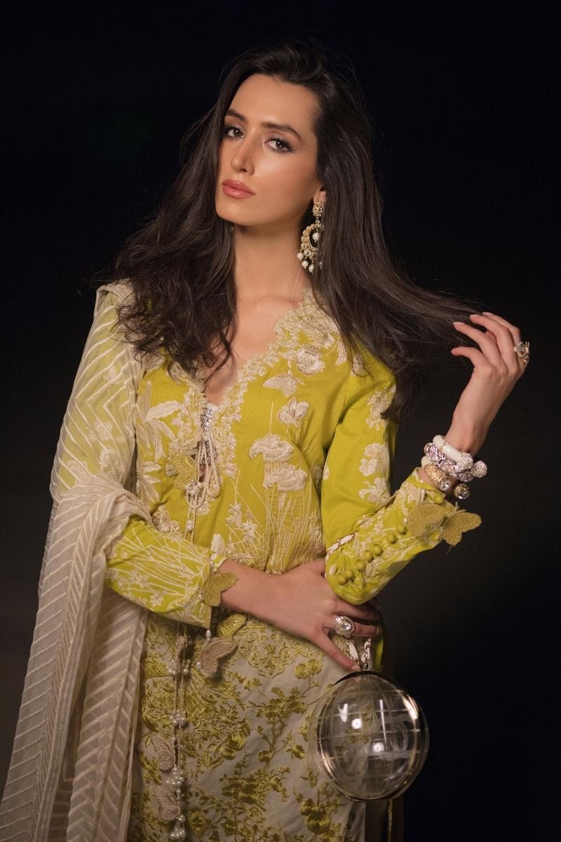 Fabric: A lime lawn shirt featuring scenery and tile work motifs, with a contrasting embroidered beige lawn daman and printed sleeves and back. Paired with a cream and beige embroidered dupatta and cream paste printed pants. Embroidered Lawn Front Body - 0.65 meter Embroidered Lawn Daman - 0.65 meter Printed Lawn Back - 1.25 meters Printed Lawn Sleeves - 0.65 meter Embroidered Tulle Net Dupatta - 2.5 meters Printed Trouser - 2.5 meters |